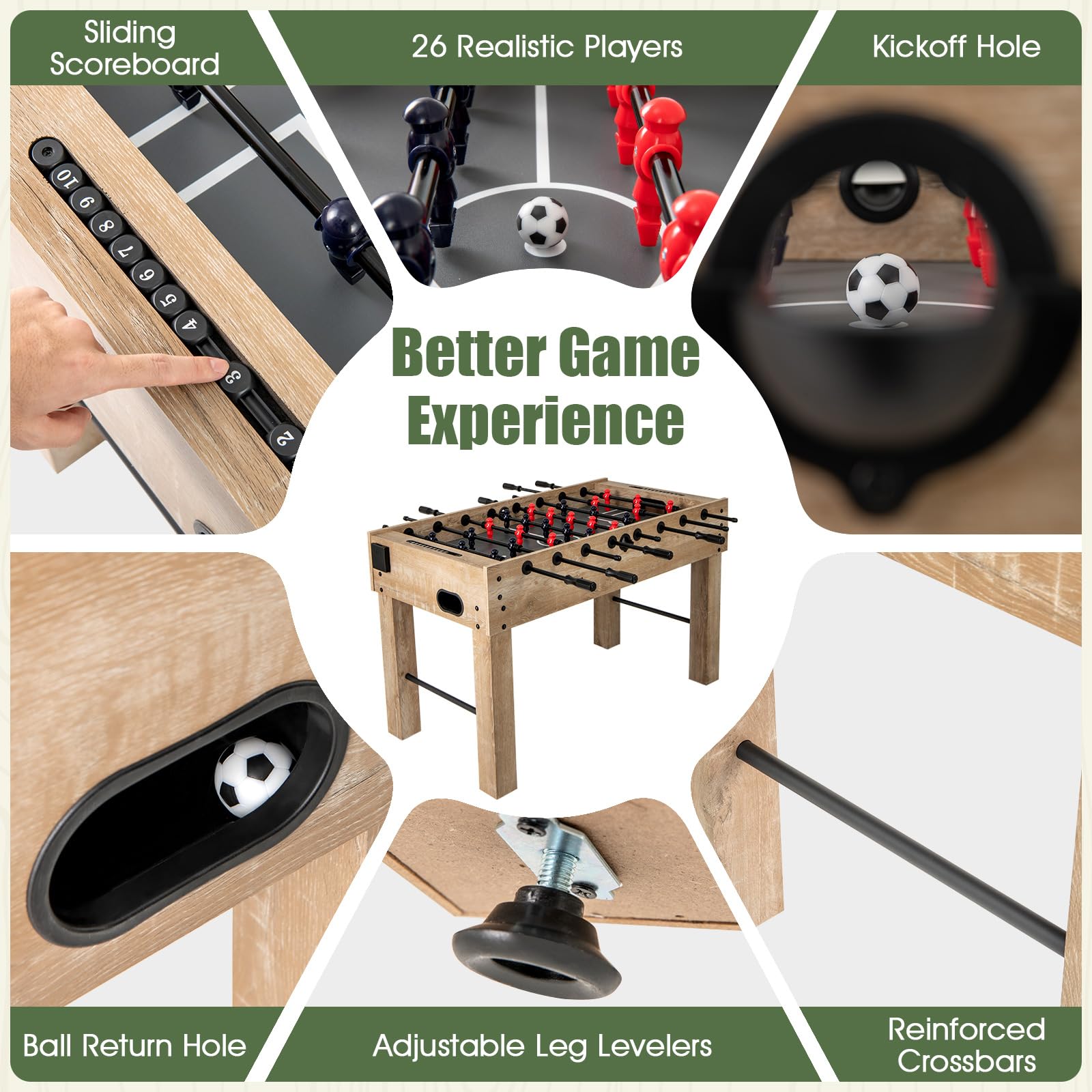 - [Robust Construction]: Crafted from thickened wooden legs and reinforced by metal crossbars, this football table ensures stability and durability. Furthermore, coupled with adjustable leg levelers, the table remains stable on any surface, letting you focus solely on winning the game.