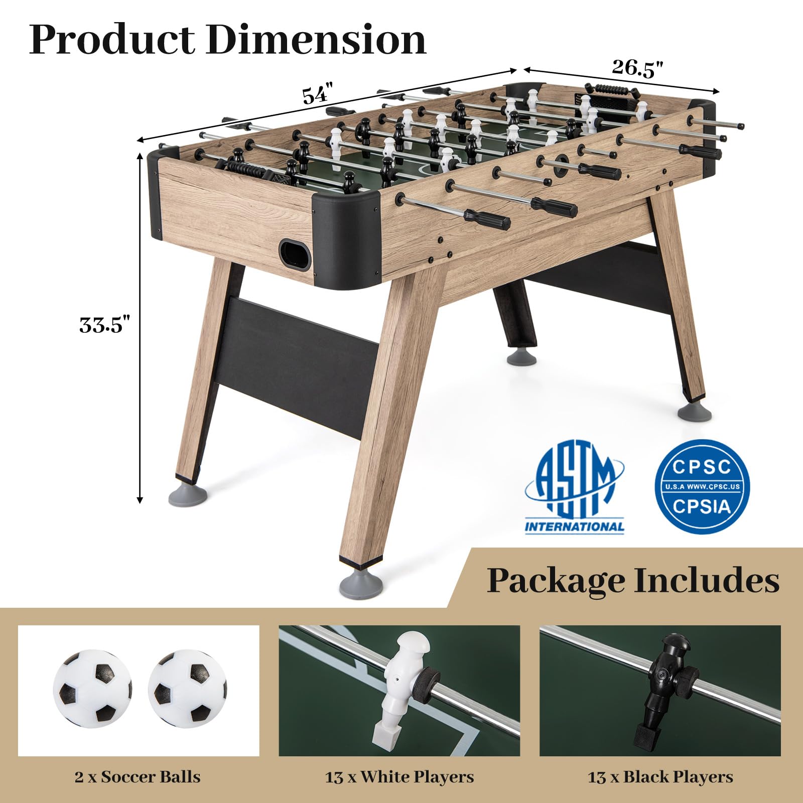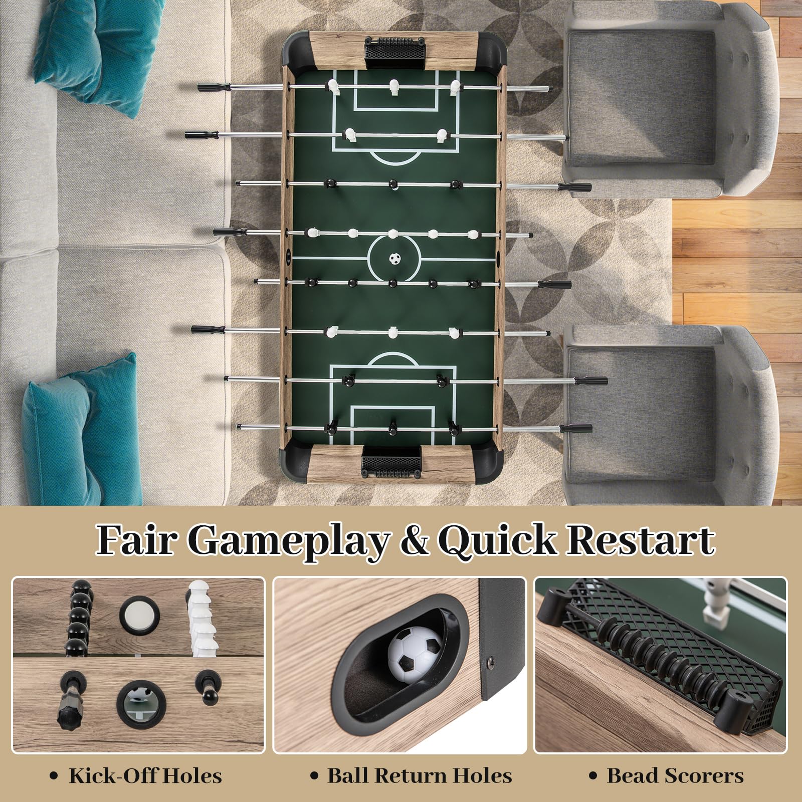 - [Full-Size Fun]: This 54" x 26.5" full-size foosball table is designed for competitive foosball games for both adults and kids, perfect for challenging friends and family to thrilling matches in the comfort of your home.