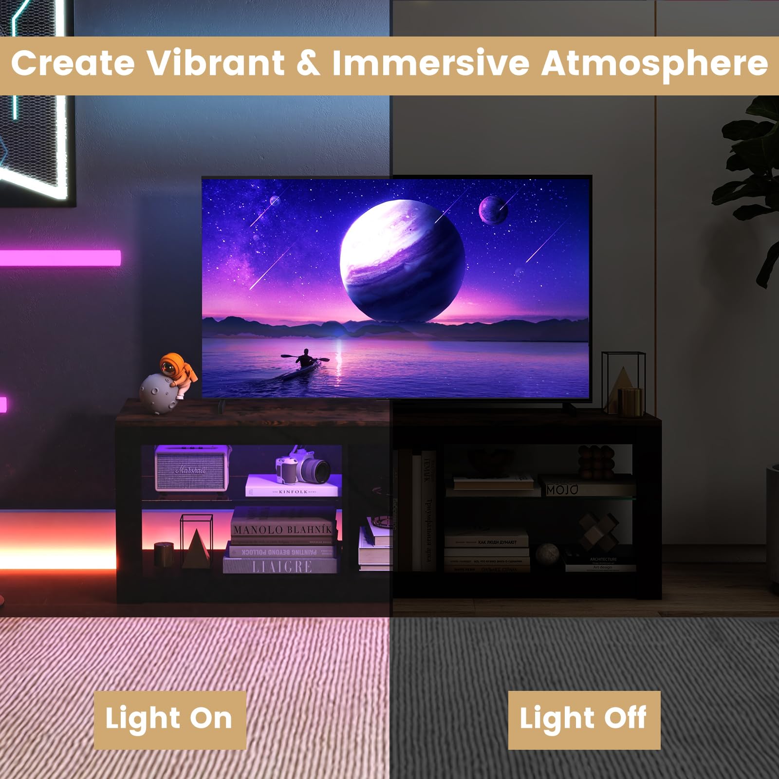 - [Vibrant LED Lighting]: Elevate your entertainment experience with the LED TV stand that offers a dynamic light show customizable through a remote control. Featuring 20 static colors and 22 dynamic modes, this TV cabinet sets the perfect mood for your viewing pleasure.