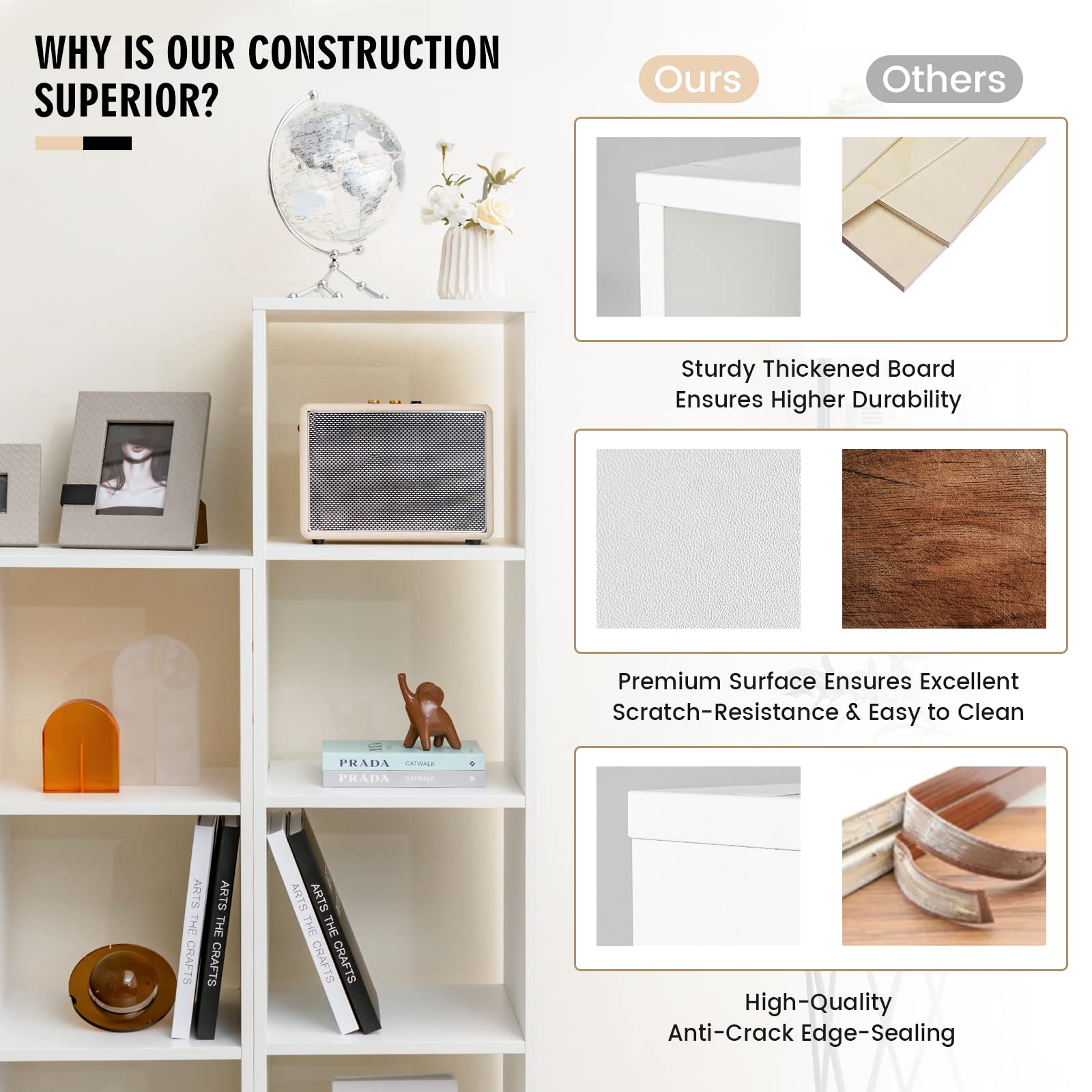 The bookshelf is composed of thickened and sealed boards with better scratch resistance and crack resistance. Also, the surface is much smoother without any burrs for easy cleaning. 4 wide cubes are ample for daily storage. Independent design allows for sorted organization to keep books, decorations, audios, sundries, etc. At the same time, the baseboard is 3” thick to keep items away from a dirty floor. More importantly, the shelving organizer has 4 anti-tipping kits for secured stability. Overall, it is a compact but practical bookcase, which only requires a simple installation.