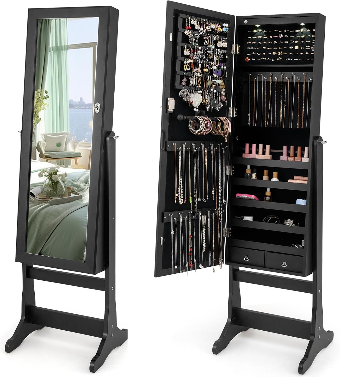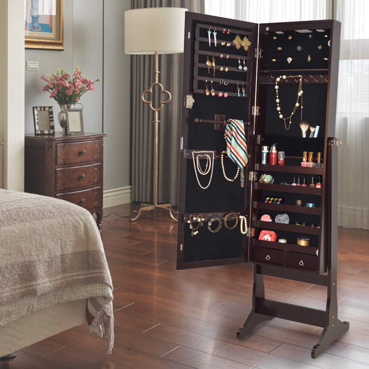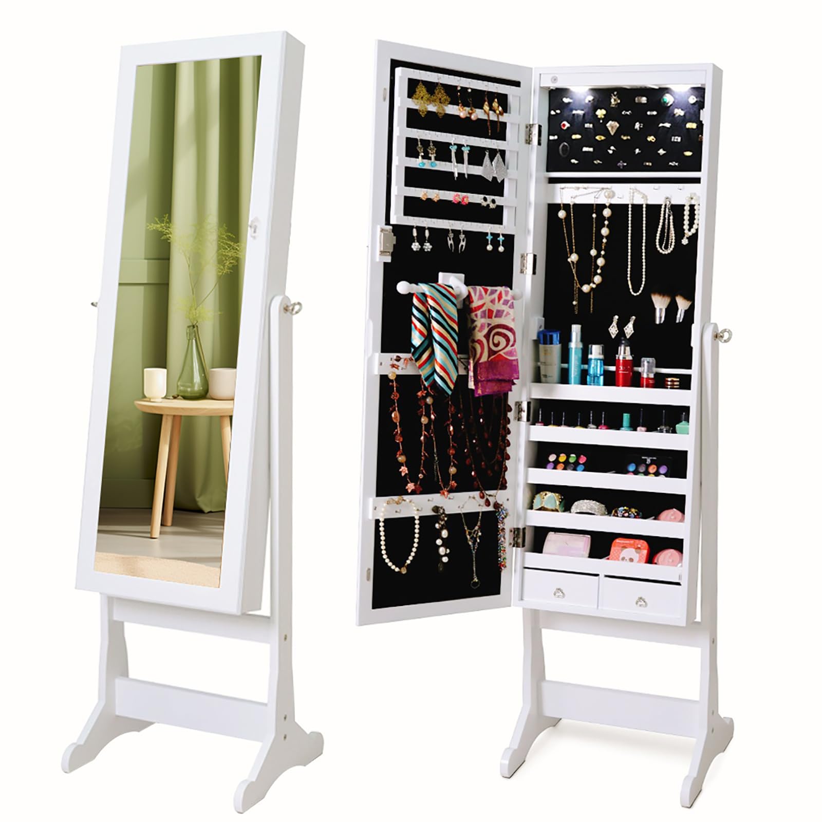 Standing jewelry cabinet with 2 drawers is perfect for organizing and storing your favorite rings, necklaces, bracelets. Made of high-quality MDF, this jewelry cabinet is sturdy and durable. It is equipped with a full length mirror and owns a powerful storage capacity. For its built-in different compartments and separate hooks, you can save your favorite accessories safely and in an organized manner. It makes it easy to choose your jewelry in the morning without the frustration of looking for missing pieces.