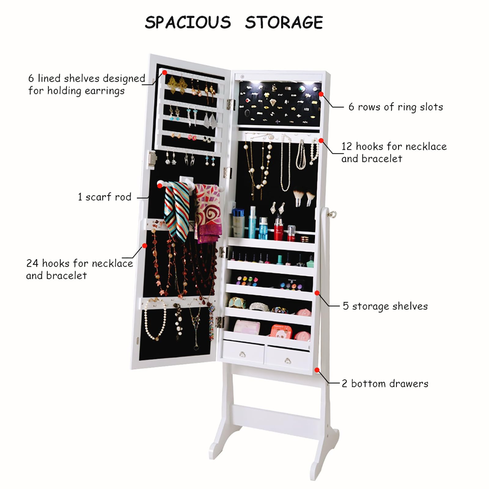 • 【Large Storage Capacity】108 earring slots, 36 earrings holes, 36 necklaces and bracelets hooks, 72 rings slots, 1 rod for scarf or bracelet, 1 pouch, 2 drawers and 5 shelves for other cosmetics, this roomy jewelry armoire easily gets all your jewelry neatly organized and maintained in good condition.