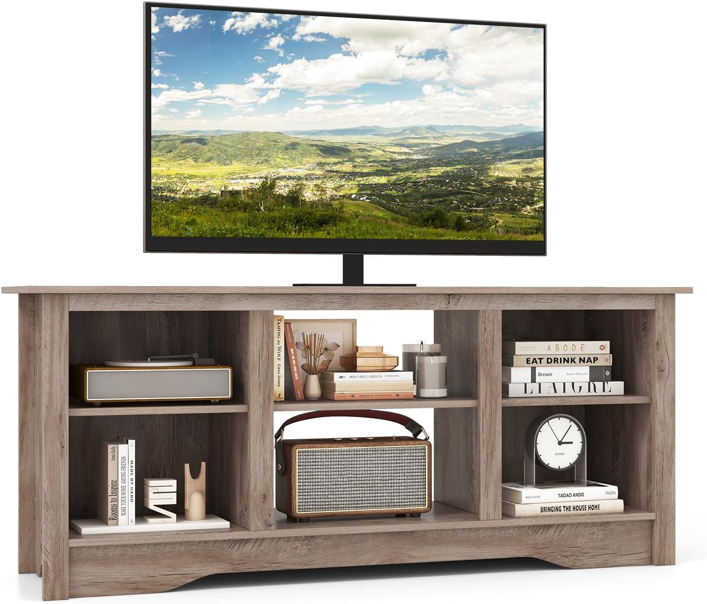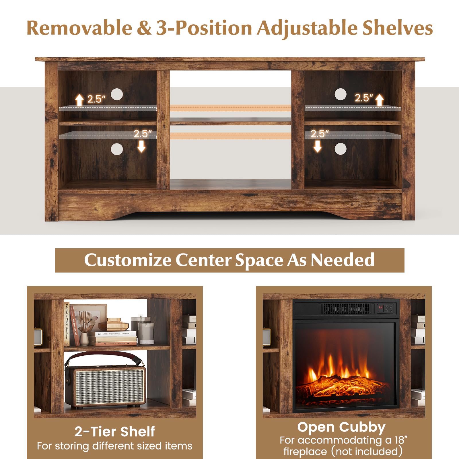 Boasting a generously-sized 58" x 16" tabletop, along with 6 open cubbies, this TV cabinet offers ample room to display a screen of up to 65" while efficiently organizing other media devices. With removable and 3-position adjustable shelves, you can customize center space as needed: use it as a 2-tier shelf for storing different sized items or an open cubby for accommodating a 18" fireplace (not included). Designed with 4 well-placed cable management holes, this TV stand ensures tidy cable organization. Thanks to the modern and simple style, it not only serves as a TV stand, but also works great as a fireplace console table or storage cabinet for your bedroom, study, hallway, etc.
