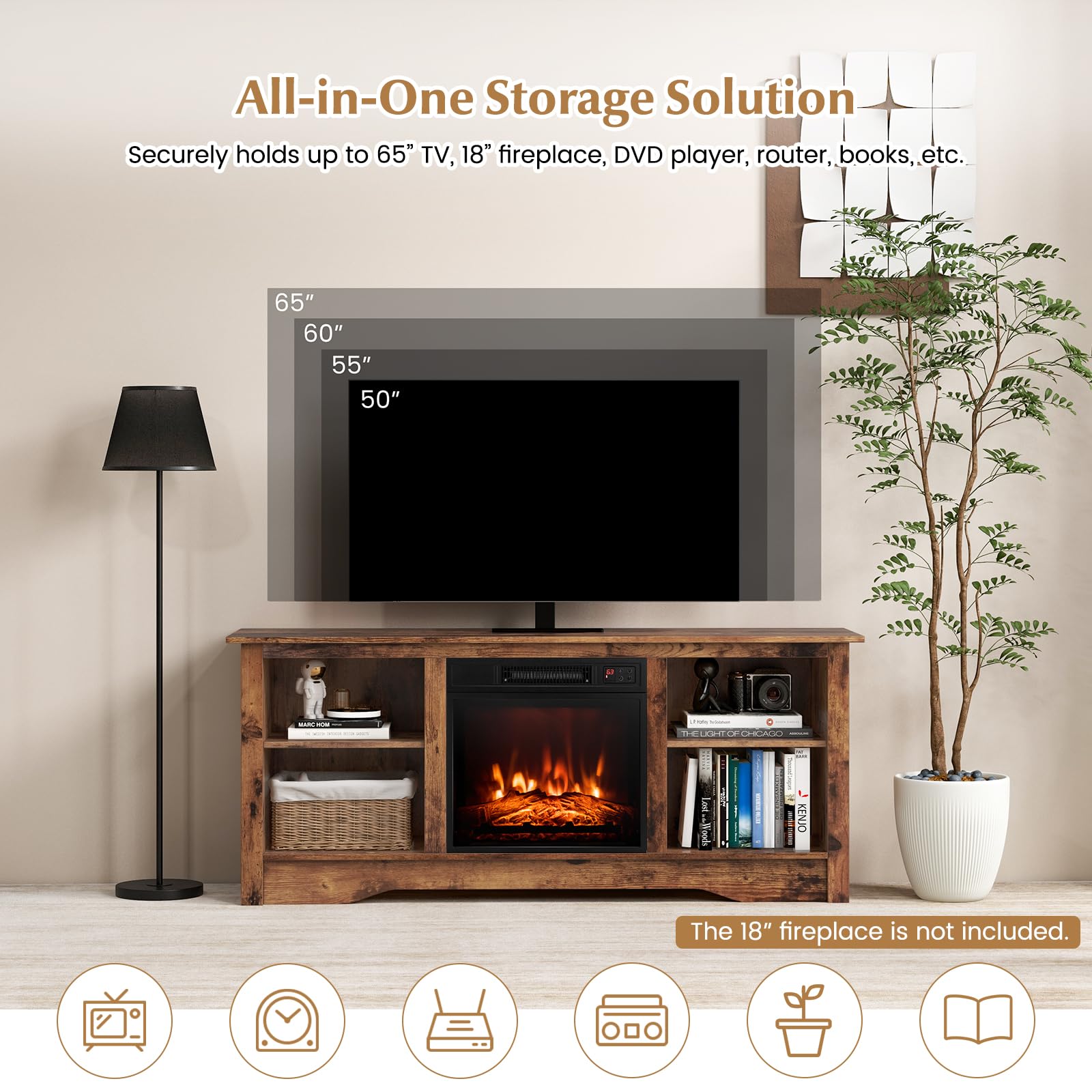- 【Fit for 65" TV & 18" Fireplace】: The spacious tabletop measuring 58"L x 16"W is designed to fit TVs ranging from 50" to 65". With the removable middle shelf, you can transform the center space into an open compartment for accommodating a 18" fireplace (fireplace not included).