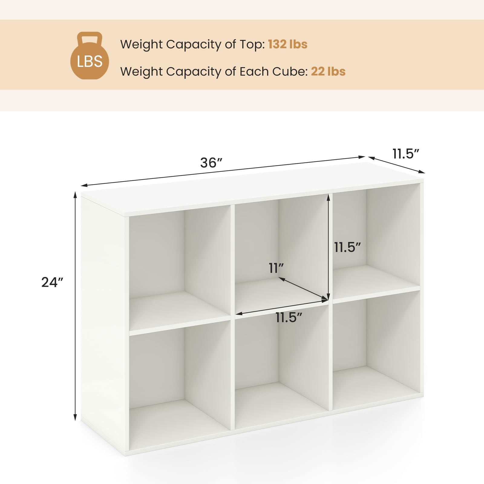 Transform any room with the sleek, versatile charm of our modern 6-cube bookcase! Stash your treasures or showcase your favorite reads across ample storage that fits just right – each cube supports up to an 11.5" x 11" x 11.5" dimension, welcoming books, CDs, and cherished keepsakes. Tailor it to your space; lay it horizontally for a chic low bookshelf vibe or stand it tall as an elegant showcase. Built to last and support up to 264 lbs, this bookcase boasts non-slip pads and safety anti-tipping kits, ensuring it's a fit even in bustling homes filled with lively kids and pets. Ready to redefine your furnishing? Place it in any setting–its contemporary design and clean lines promise to elevate your living room, bedroom, or cozy reading nook. Don't just store items – showcase your style confidently!