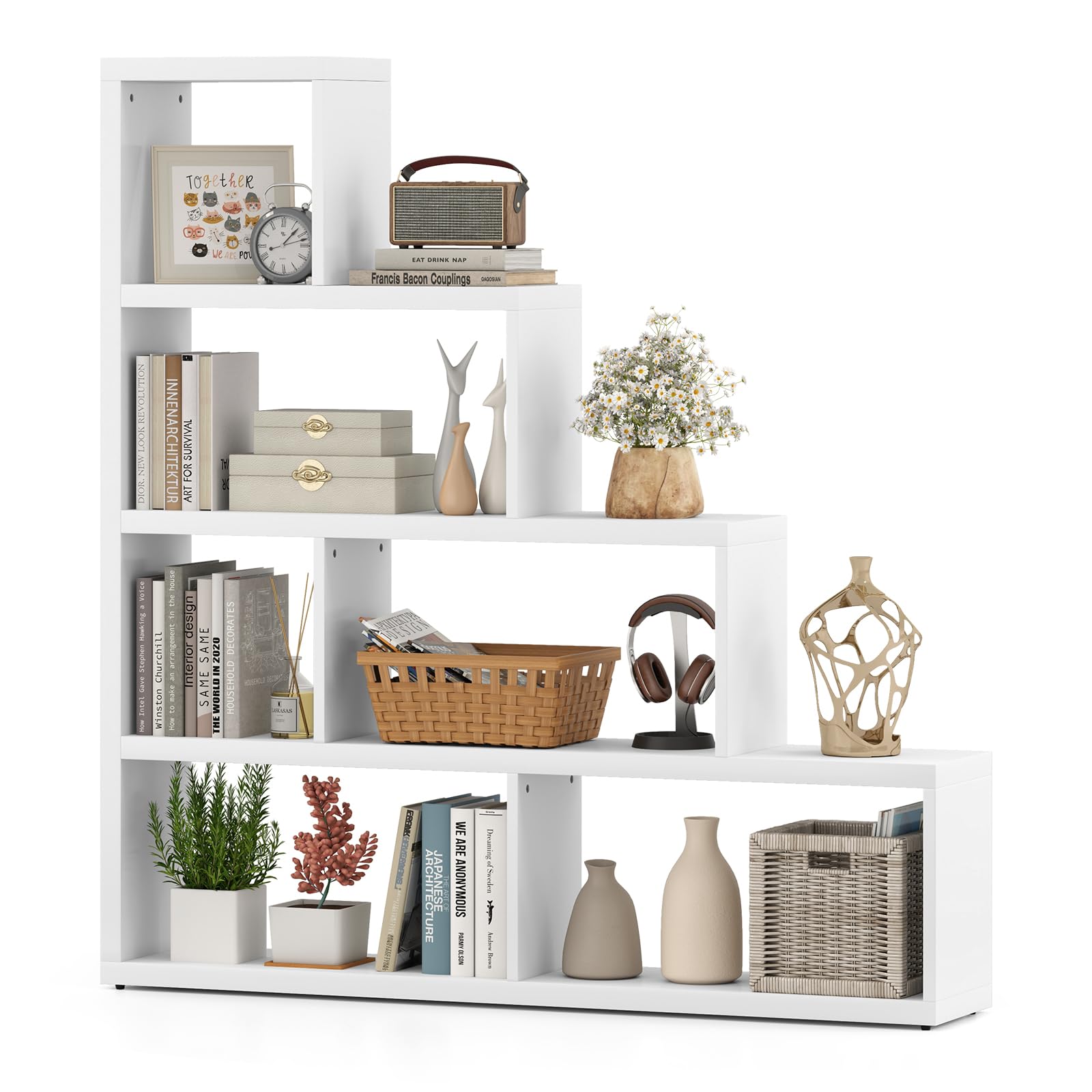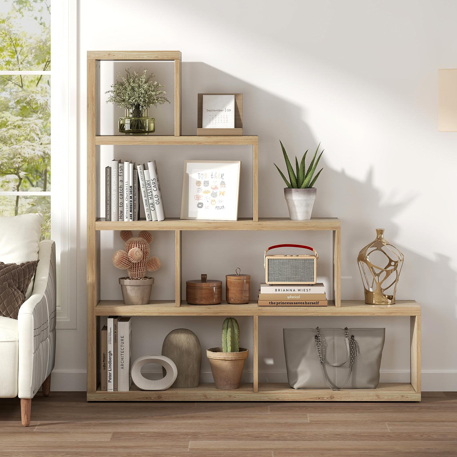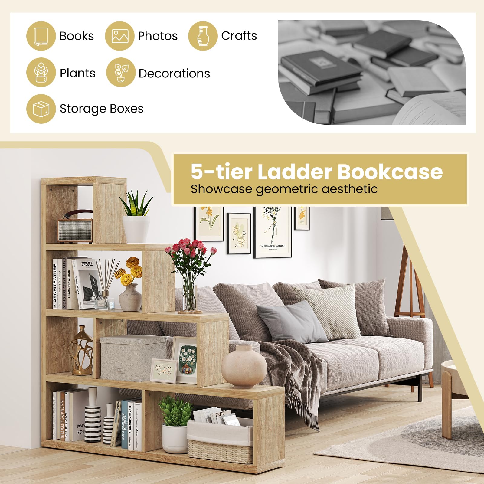 Effortlessly organize books, photos, and plants with the ladder design