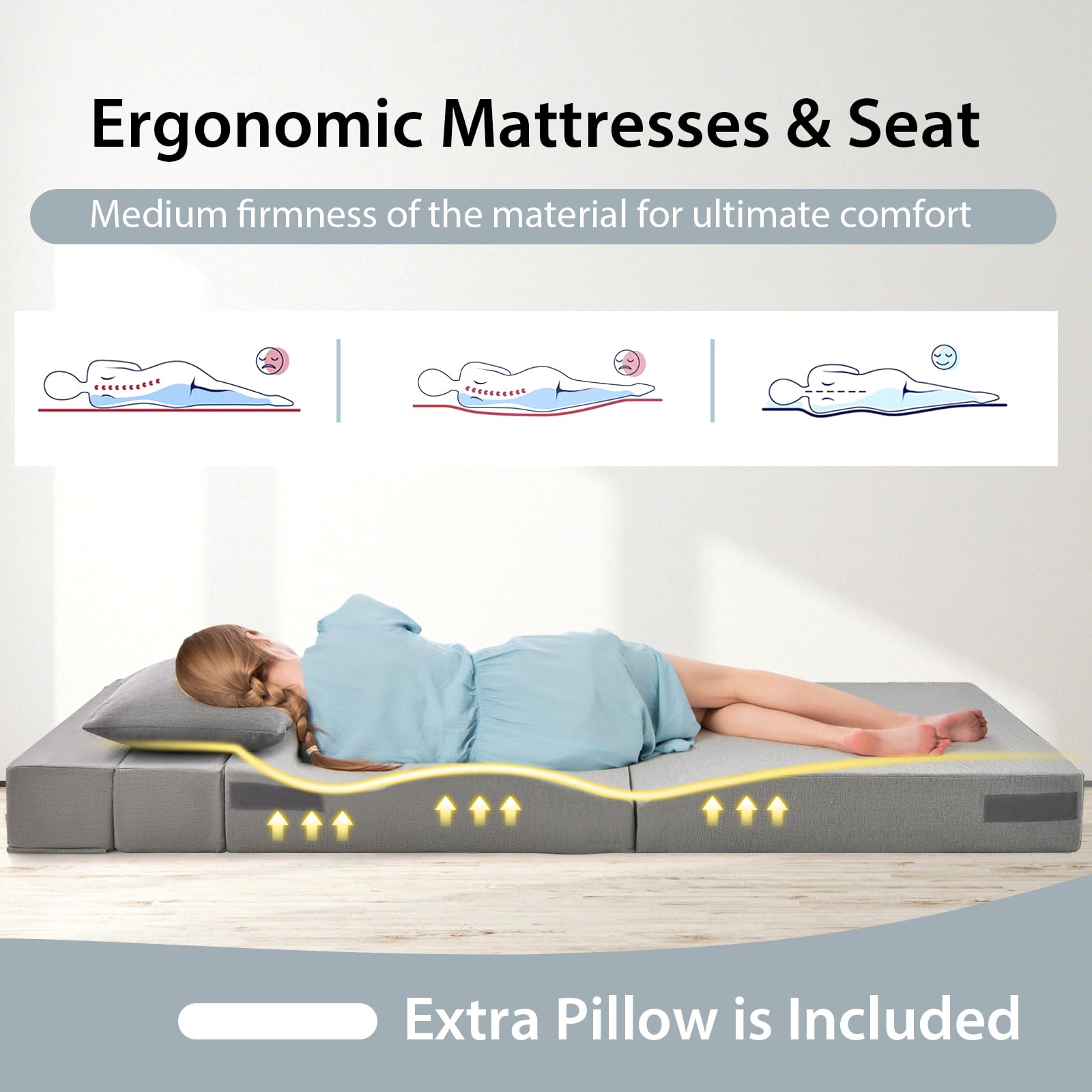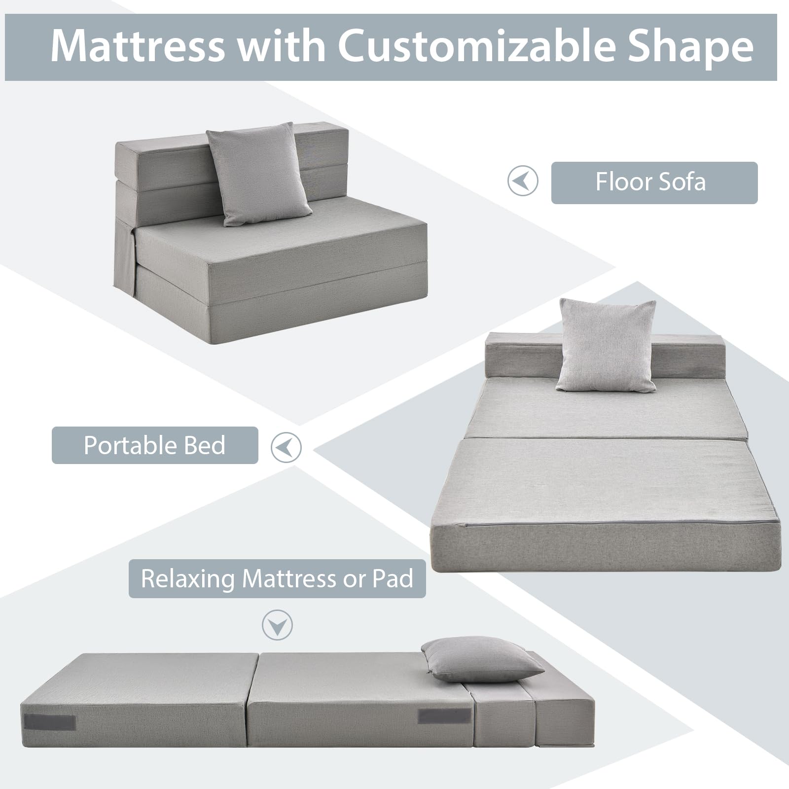 Experience ultimate comfort and versatility with our customizable tri-fold sofa bed. This sofa bed can transform into a recliner, lazy couch, mattress, or extra seat, allowing you to create the perfect seating or sleeping arrangement. The folding mattress is designed with a skin-friendly faux linen cover and features high resilience foam and PP foam padding for optimal support. With an ergonomic design that provides support to your entire body, you can reduce pressure, alleviate pain, and maintain correct spinal alignment. The mattress is also easy to clean with its zippered and machine washable cover. Plus, the included pillow adds an extra level of comfort. Suitable for various scenarios, from beds to sofas to floors, this ergonomic pillow set ensures the best experience while reading, resting, or taking a nap.
