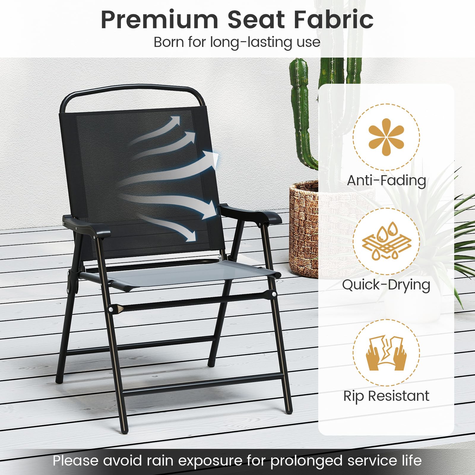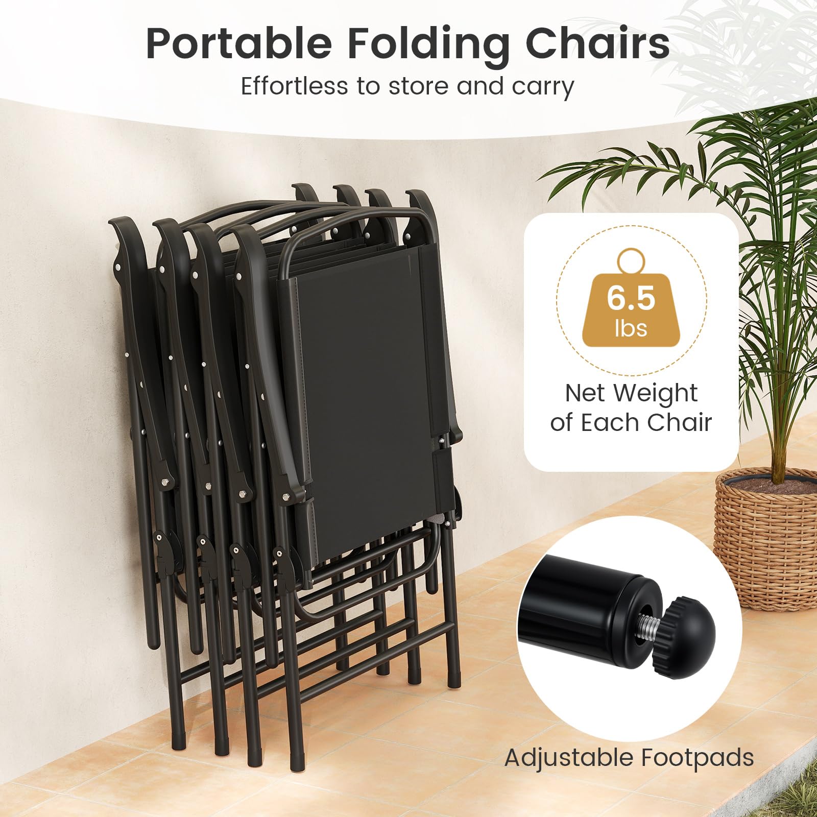 Perfect for every outdoor scenario, from backyard gatherings to poolside parties, the set will always meet your demands for relaxation. The sleek tempered glass round table, 4 easily foldable chairs and a large umbrella provide you with a complete outdoor furniture set. Enjoy the perfect blend of style and functionality with this versatile outdoor dining set.