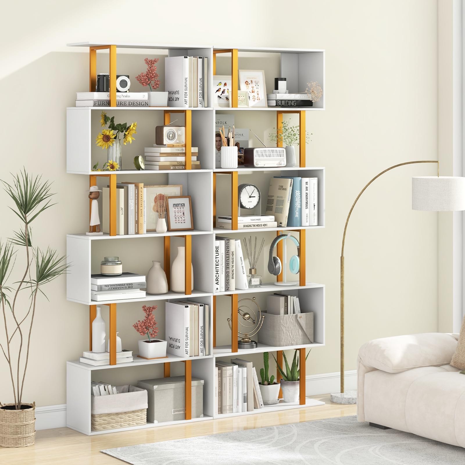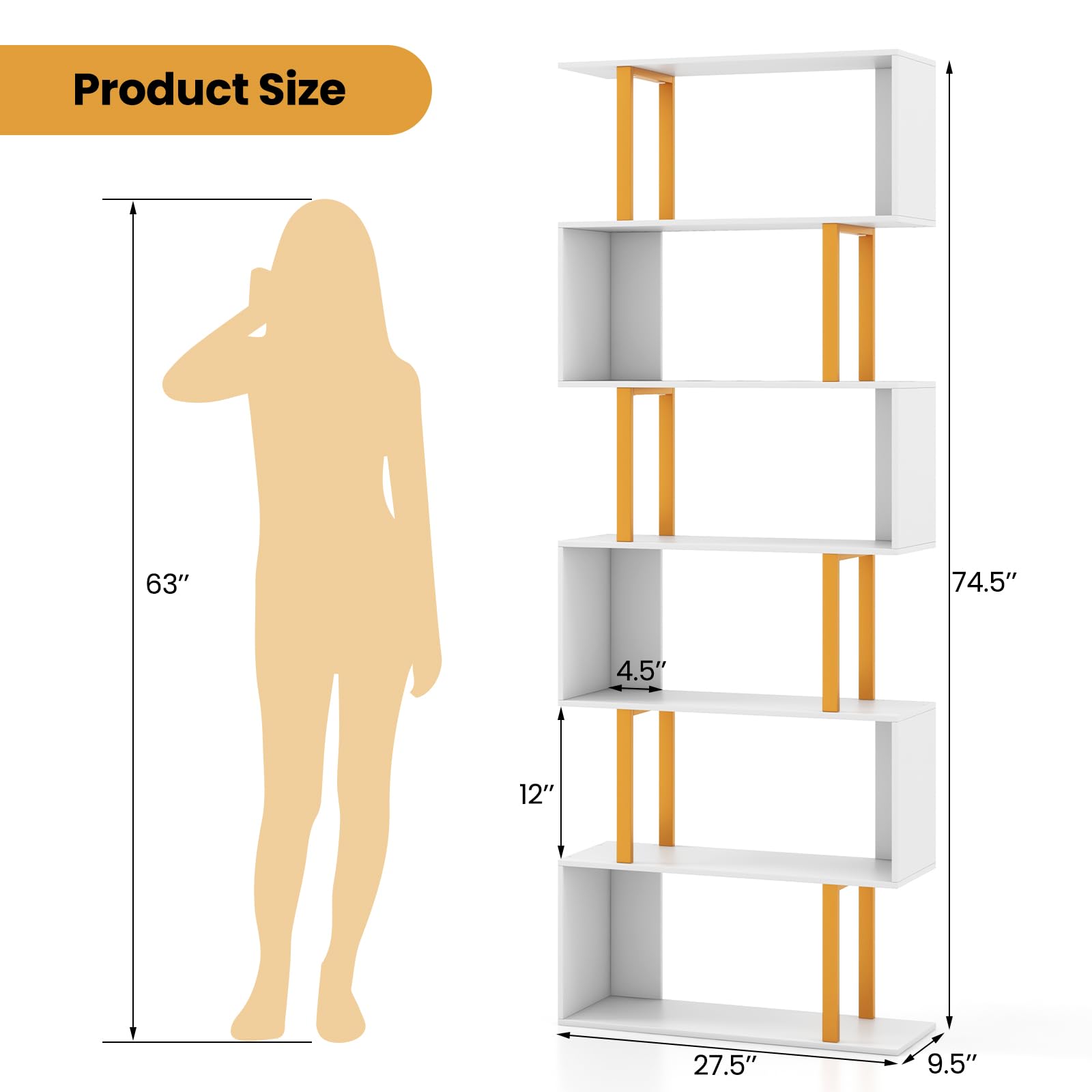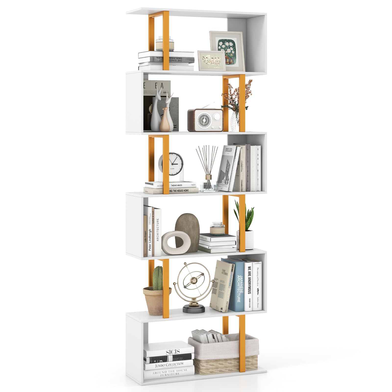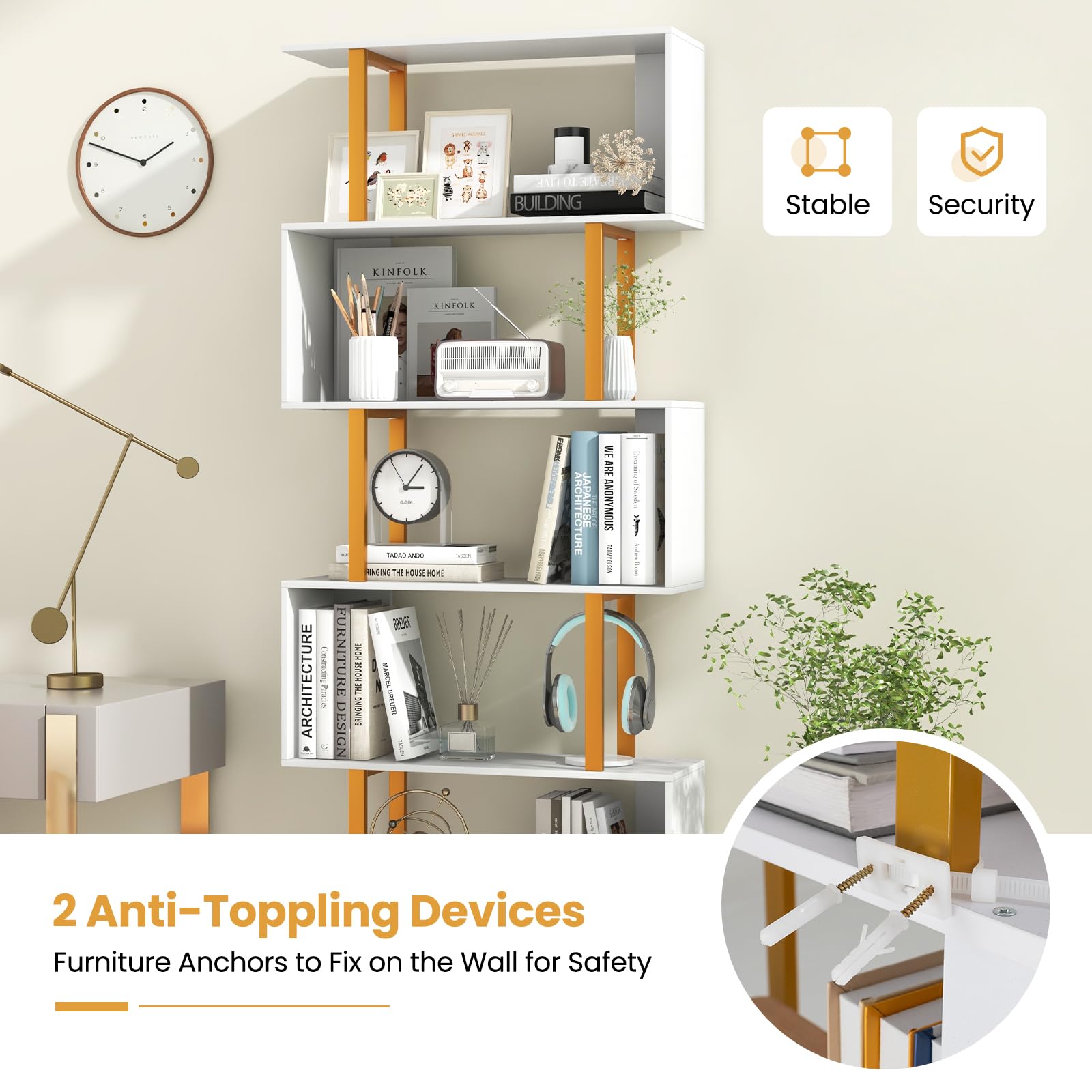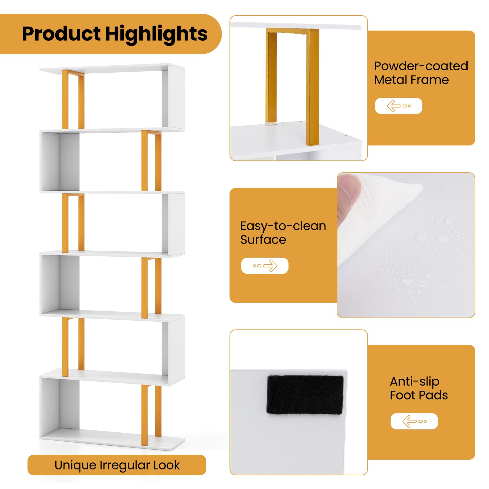 Our geometric bookcase is meticulously crafted with S-shaped shelves and an eye-catching gold frame, designed to bring a statement of modern elegance to your interiors. The bold structure and sophisticated design create a standout feature in any room, bridging artful aesthetics with functional flair. Constructed for endurance, the freestanding bookshelf boasts a combination of high-grade boards and a solid metal frame. It is engineered to offer long-standing reliability, enhanced further by non-slip foot pads that anchor the unit securely in place to ensure stability and support. 2 anti-toppling devices can attach to the wall to avoid tipping over and wobbling. This piece offers versatile storage options with its 6-tier arrangement, ideal for housing a vast array of items.