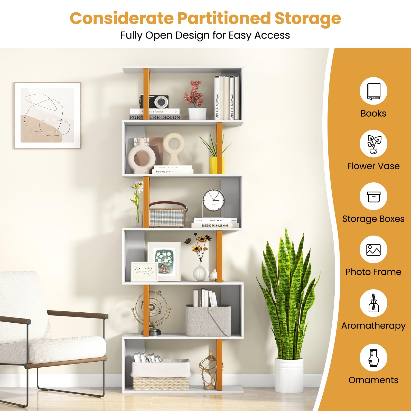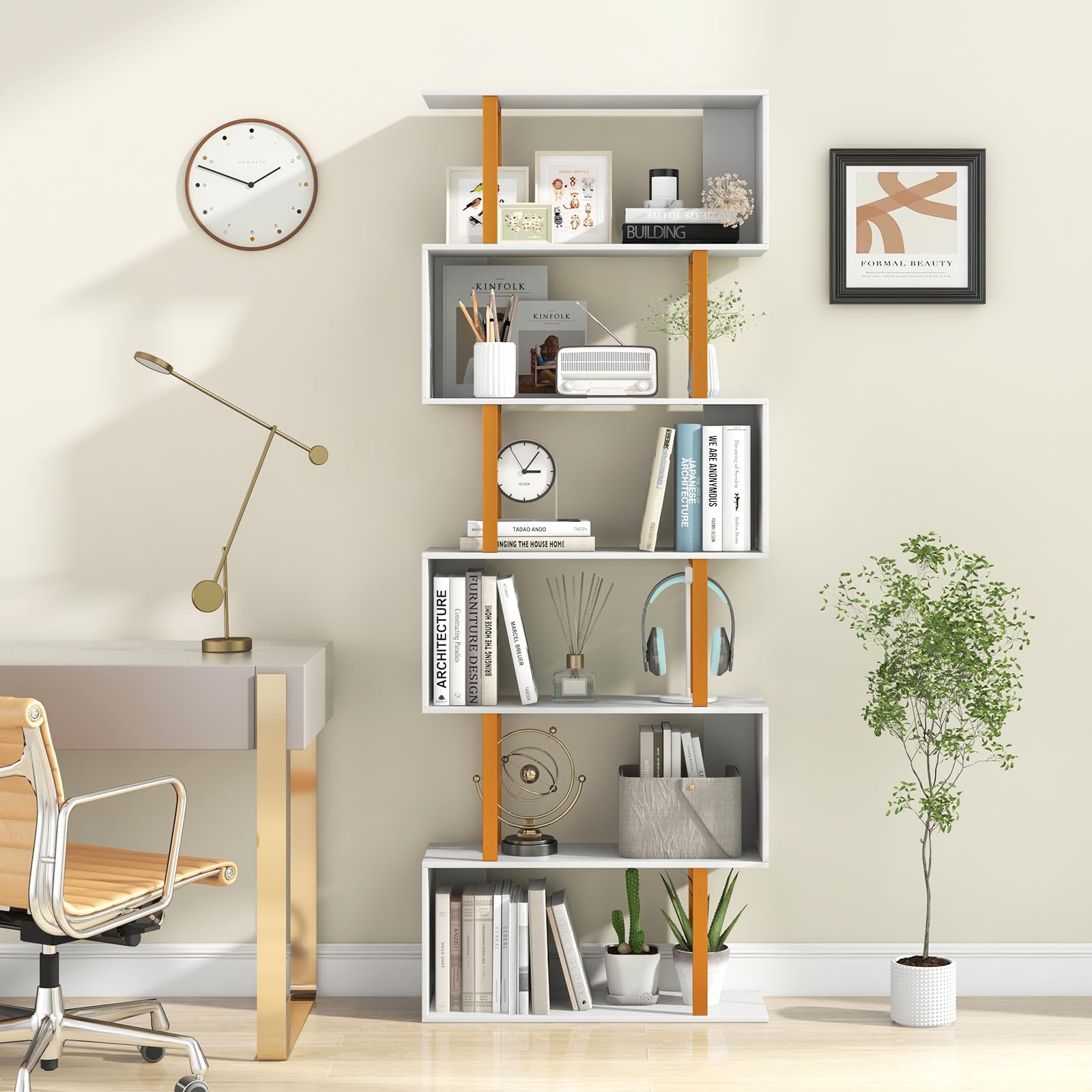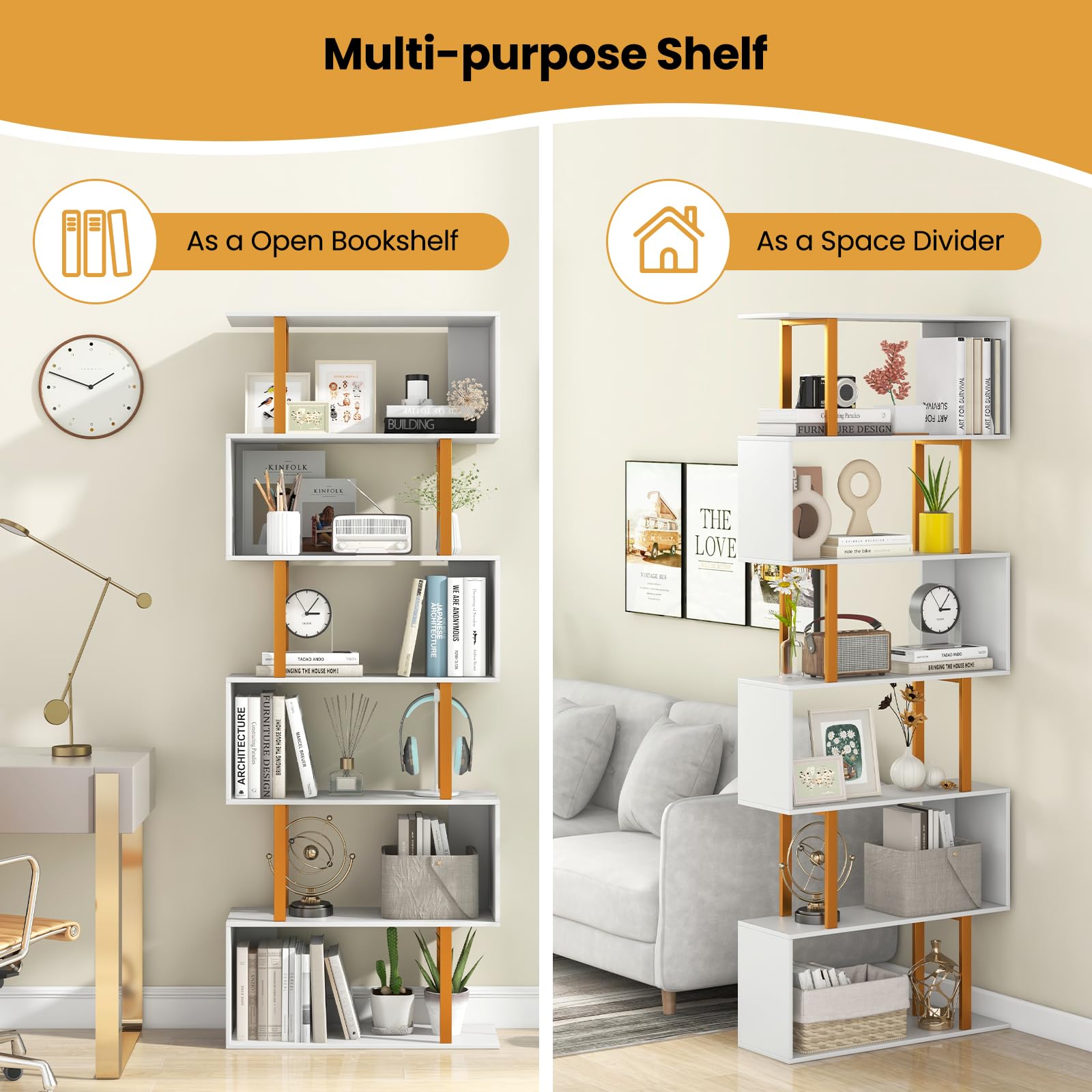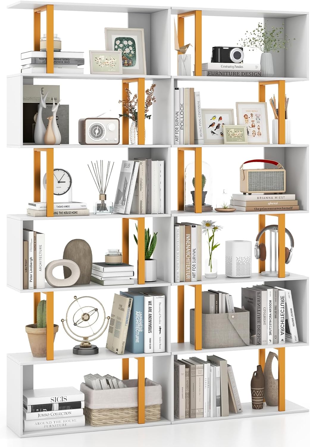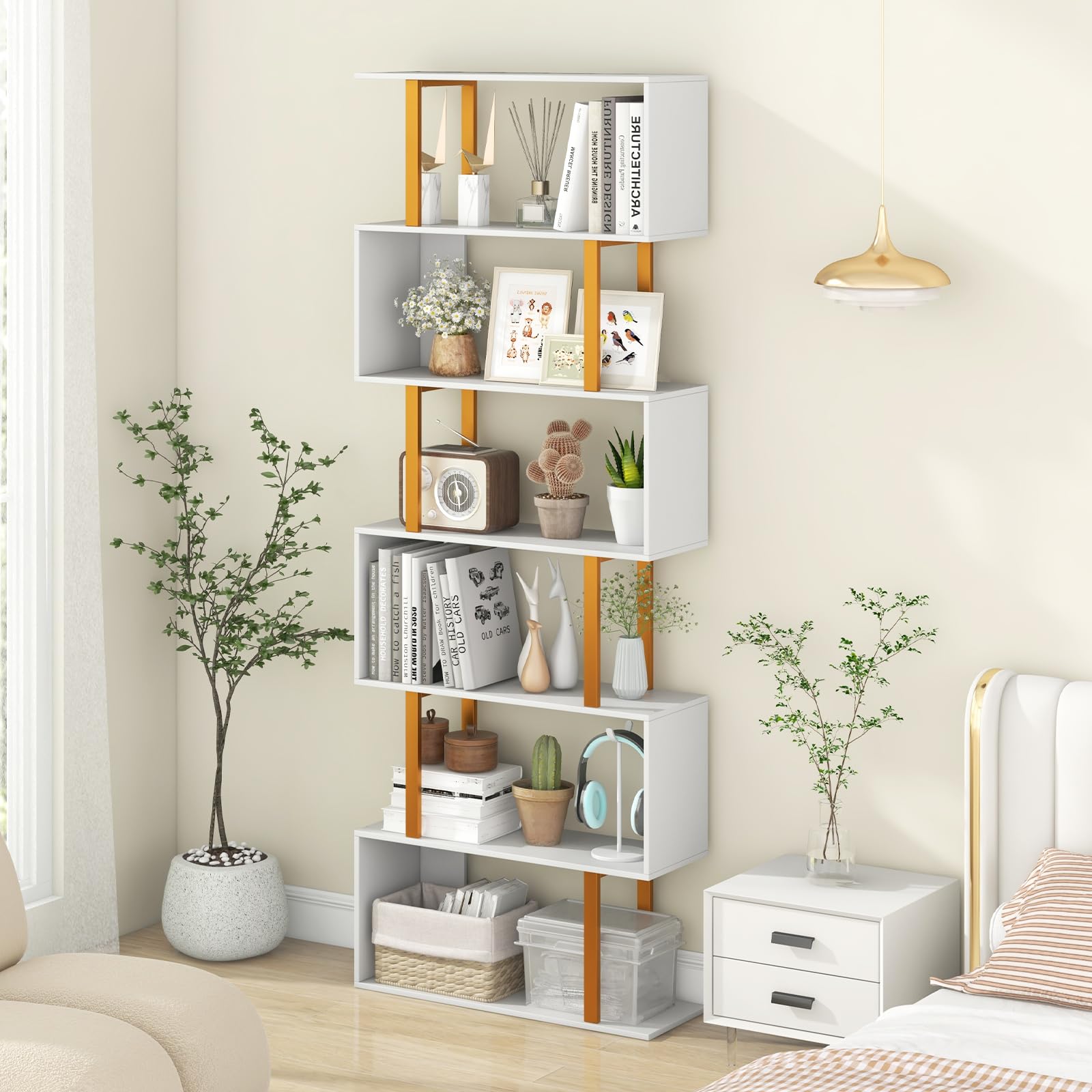 Our geometric bookcase is meticulously crafted with S-shaped shelves and an eye-catching gold frame, designed to bring a statement of modern elegance to your interiors. The bold structure and sophisticated design create a standout feature in any room, bridging artful aesthetics with functional flair. Constructed for endurance, the freestanding bookshelf boasts a combination of high-grade boards and a solid metal frame. It is engineered to offer long-standing reliability, enhanced further by non-slip foot pads that anchor the unit securely in place to ensure stability and support. 2 anti-toppling devices can attach to the wall to avoid tipping over and wobbling. This piece offers versatile storage options with its 6-tier arrangement, ideal for housing a vast array of items.
