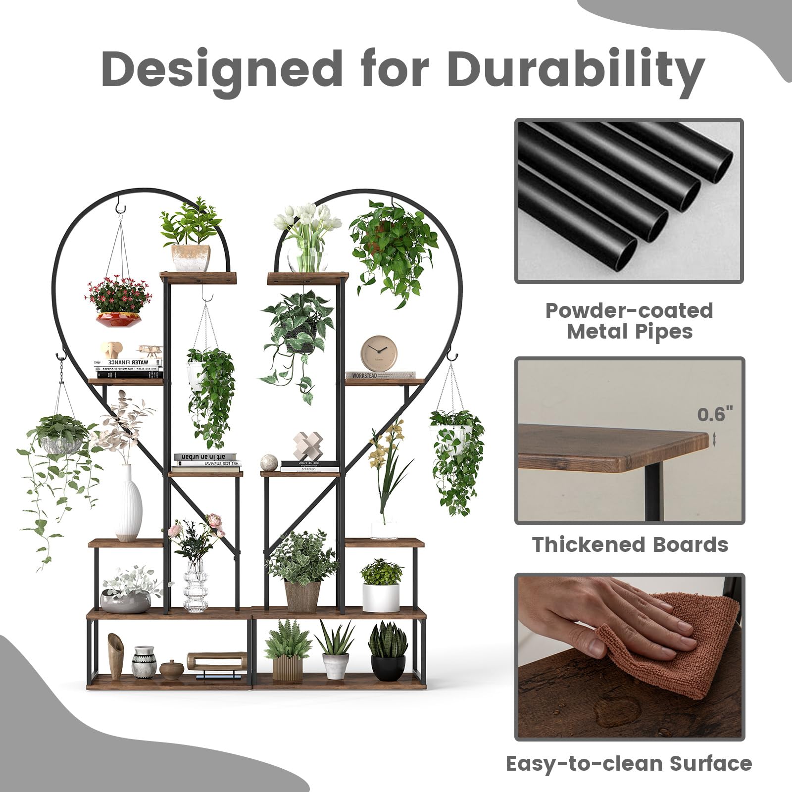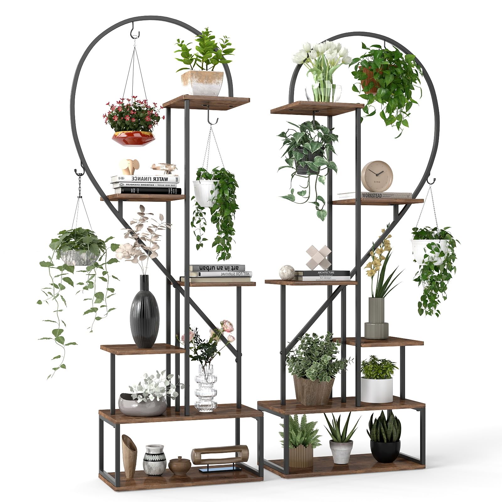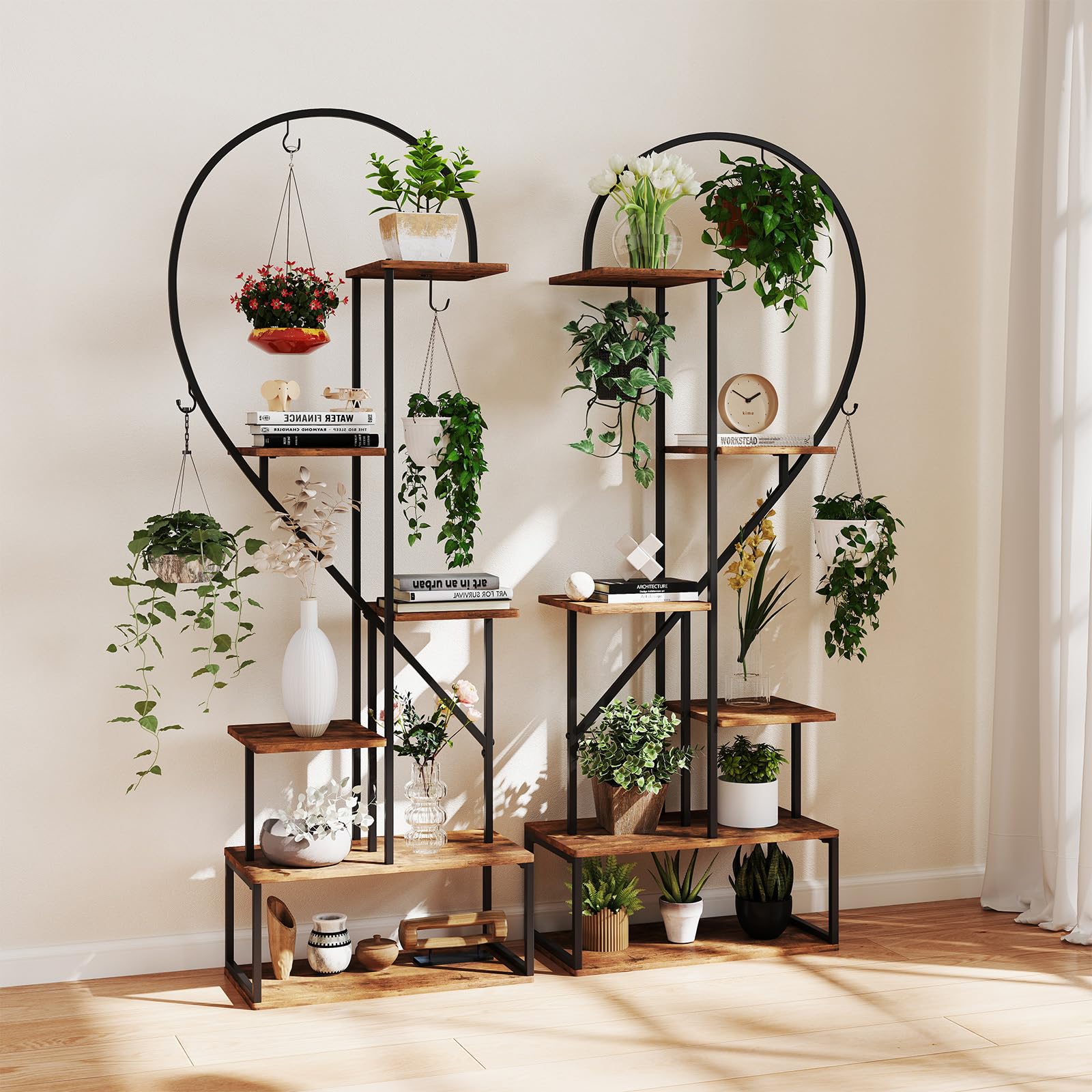 Elevate your plant game with our innovative plant stand set. It features an elegant heart-shaped design to add a romantic touch to any living space while showcasing your favorite plants. The 6-tier design offers generous space for organizing and displaying a variety of plants. Its unique ladder design allows plants to be displayed at varying heights, ensuring optimal sunlight for healthy growth. Crafted from heavy-duty metal and thickened boards, it ensures stability and durability. Perfect for showcasing plants, books, or crafts, it seamlessly fits into any living space. Effortless to maintain with waterproof veneered MDF boards, this versatile plant stand set will add charm and style to your home or office.
