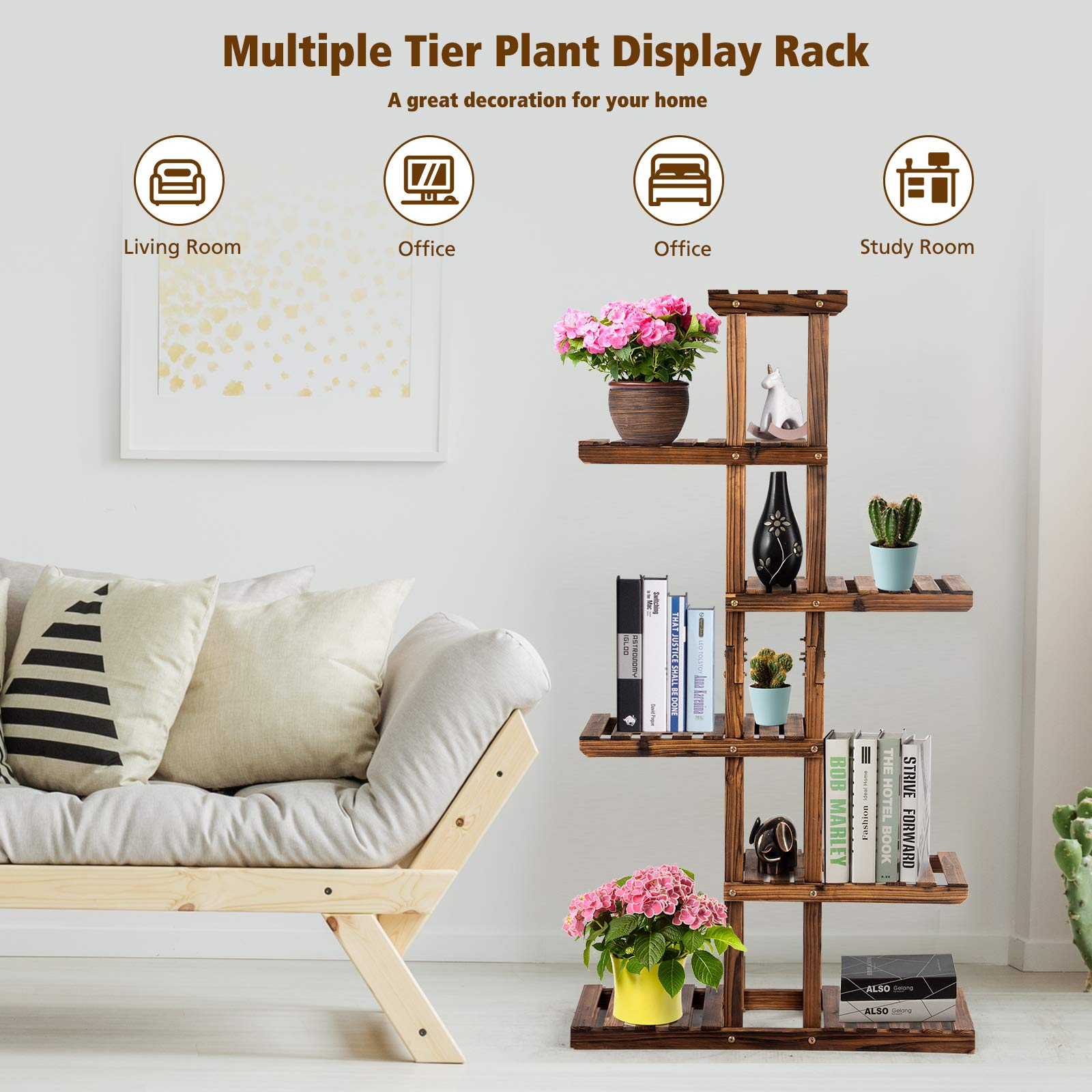 Our Giantex flower stand can fully play its multifunctional role inside or outside your home. Equipped with solid and weather-resistant wood construction, the plant stand can be placed at your balcony, living room, garden or patio etc. not only todisplay beautiful flowers and vigorous potted plant but also to store or exhibit your photos, trophies, books and other beautiful artworks. Multi-layer high and low design makes full of space to highlight all plants and makes them not affect with each other. Each rack provides sufficient space to accommodate plants, and hollow-out design make it convenient for you to water plants without messy. With strong bearing capacity, anti-corrosive and weather-resistant wood construction will maintain long term use. It will be an ideal choice for your home!