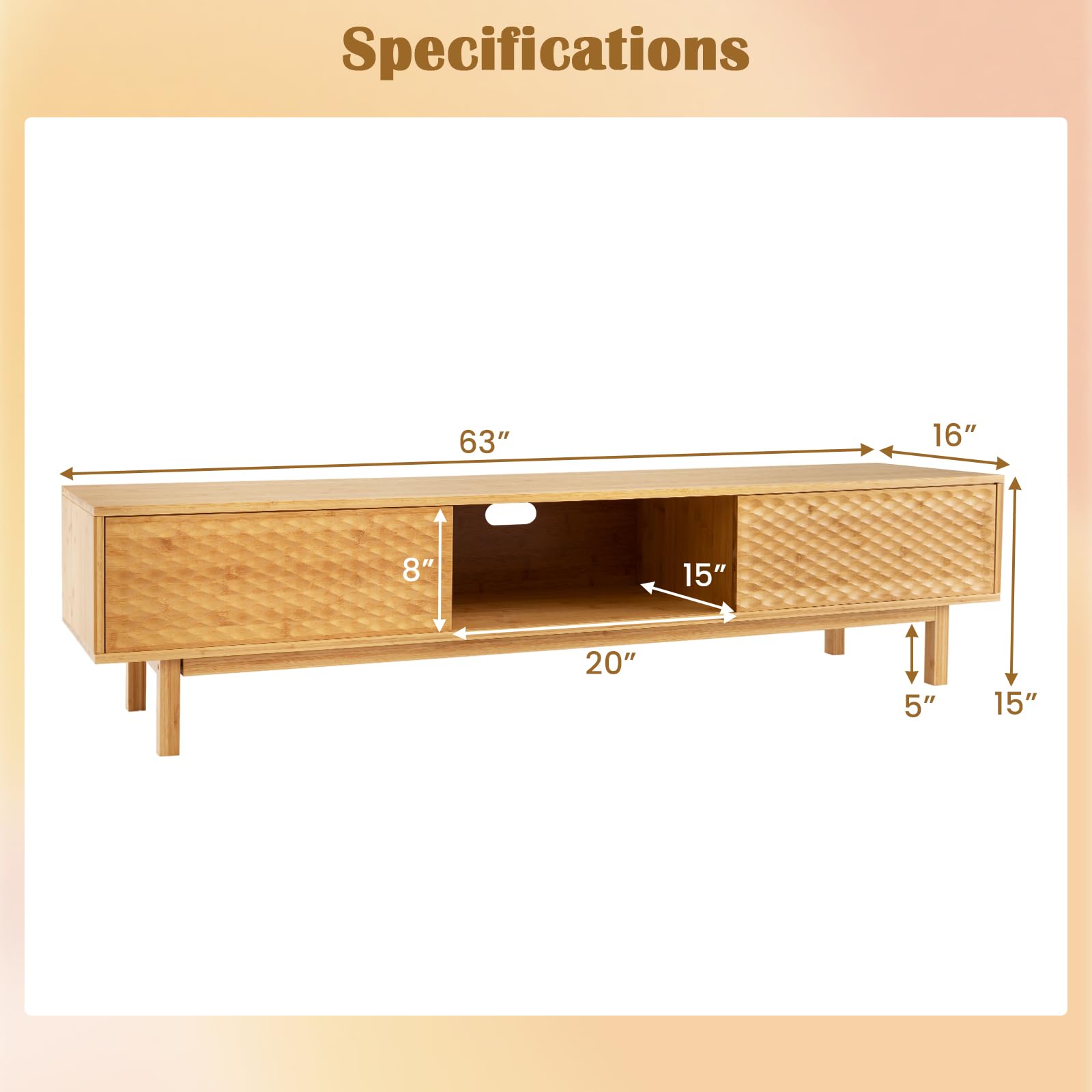 Elevate your living space with our expertly crafted TV stand, boasting a blend of retro-chic style and functionality. Featuring sleek sliding doors and a sophisticated diamond pattern, this TV cabinet adds a touch of elegance to any room. Constructed from high-quality bamboo, this sustainable entertainment center ensures durability and stability, supported by sturdy legs. The generous 63" tabletop offers ample space for a TV of up to 70 inches, while the 3 storage compartments below help keep your media essentials organized. Say goodbye to cable clutter with the convenient built-in cable hole, creating a tidy living area. This versatile storage cabinet can serve as a media center or console table, bringing a timeless charm to your space.