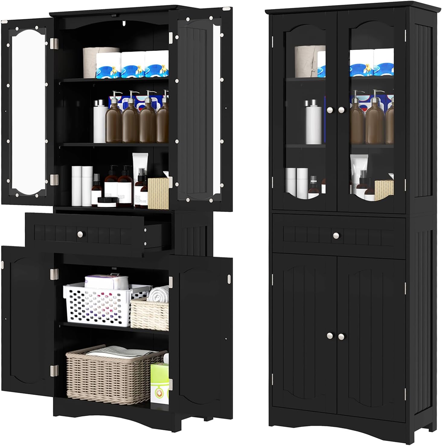 - [Stylish 4-Door Design]: With 2 tempered glass doors and 2 ordinary doors, this bathroom storage unit offers both protection for your essentials and a touch of elegance to your space. Convenient knobs make it easy to open the doors.