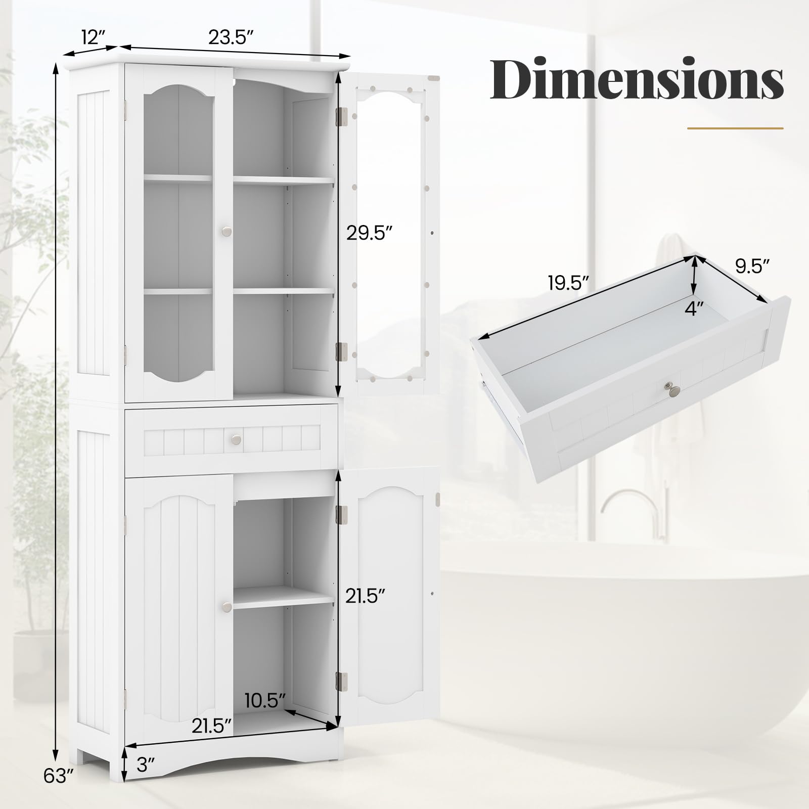 - [Diverse Storage Options]: This bathroom cabinet features a glass-door cabinet, large drawer, and double-door cabinet to provide various storage options for towels, skincare products, toiletries. Organize and display your items with ease.