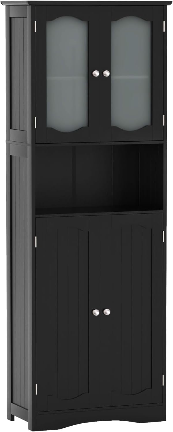 • [Ample Storage Options]: Featuring a glass-door cabinet, open compartment, and double-door cabinet, this bathroom cabinet offers versatile storage for towels, cosmetics, toiletries, and more. Hide or showcase your items as you please.
