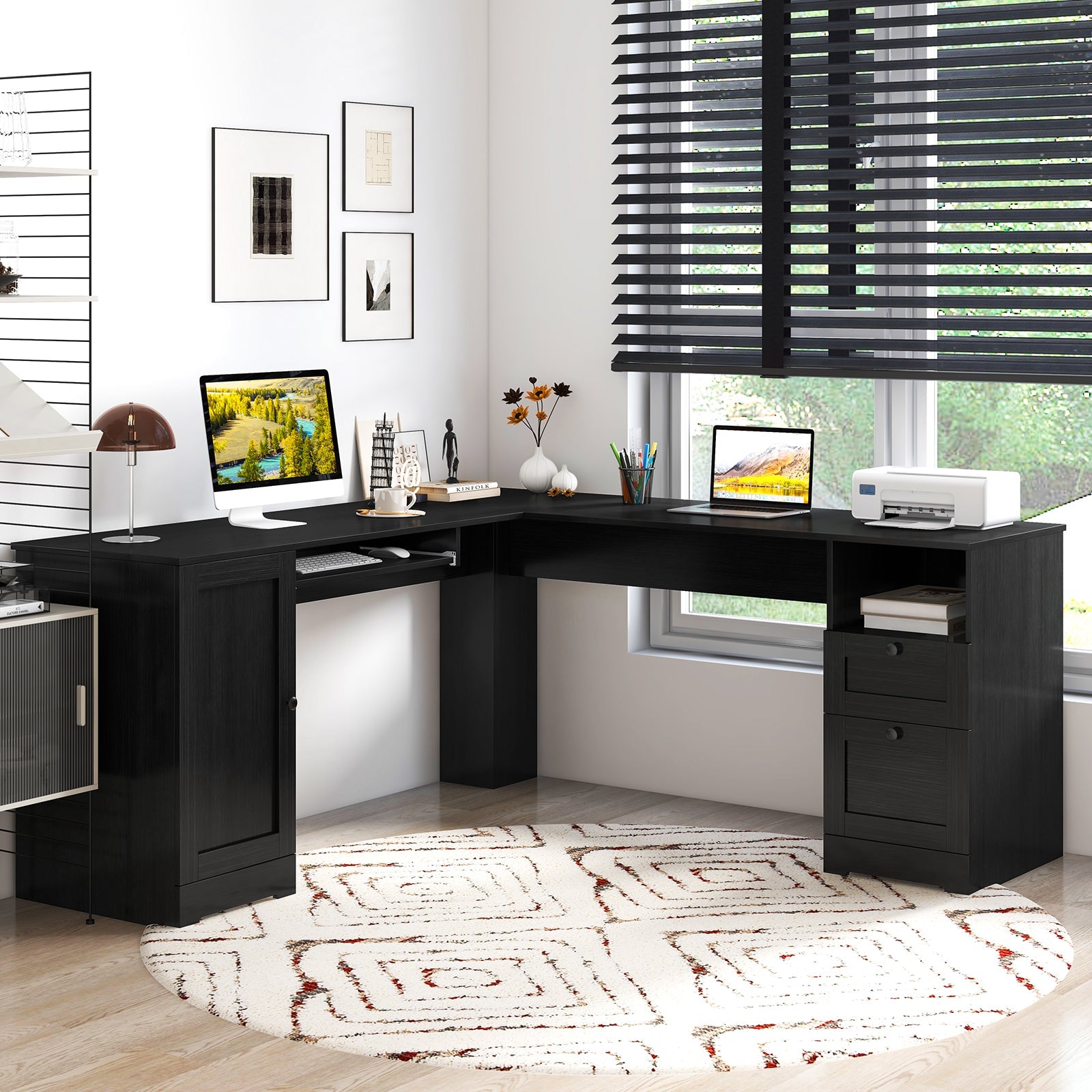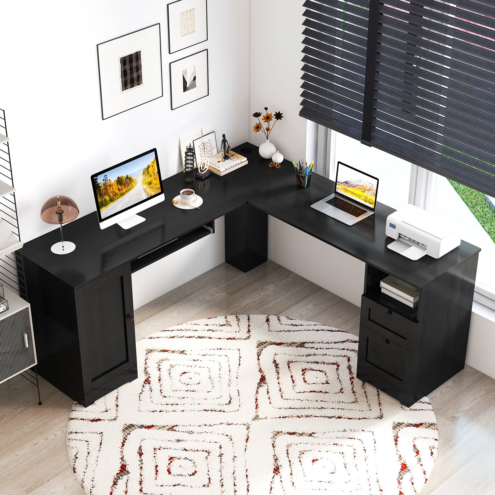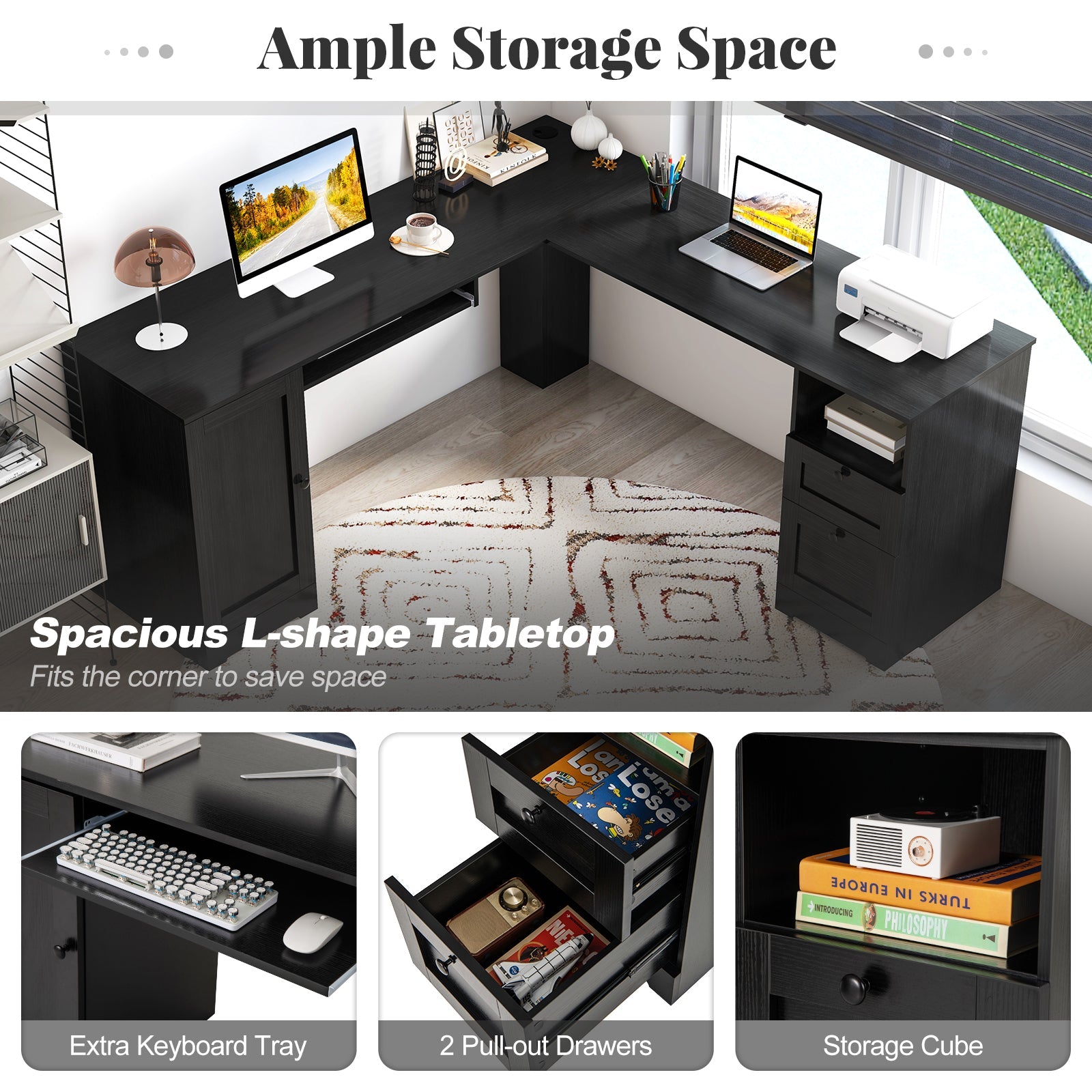- [Ample Storage Space]: Maximize your organization with this computer desk's spacious L-shaped tabletop, perfect for multiple monitors and office supplies. It also features an extra keyboard tray, 2 pull-out drawers, a storage cube for storage, and the cable management hole keep the wires tidy.