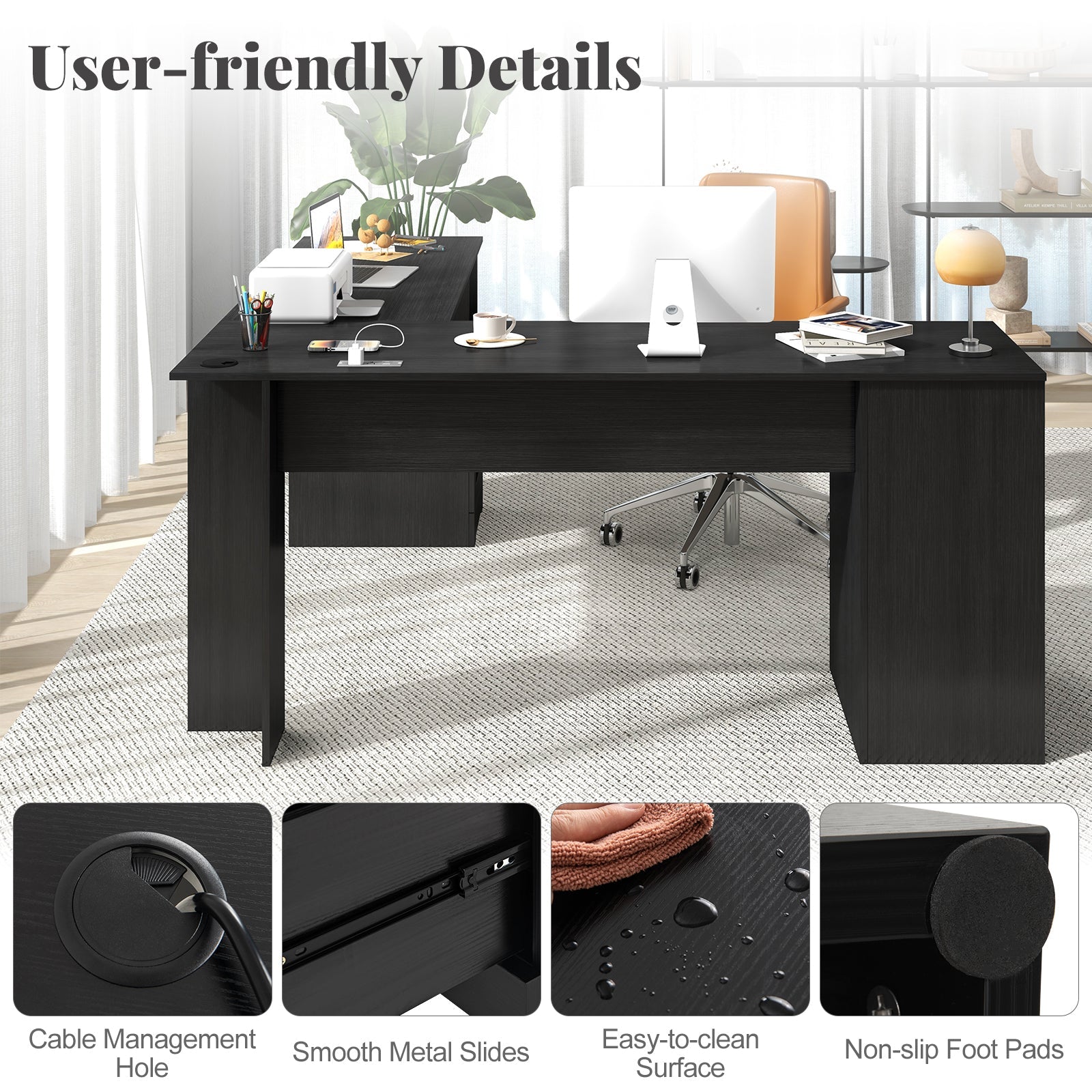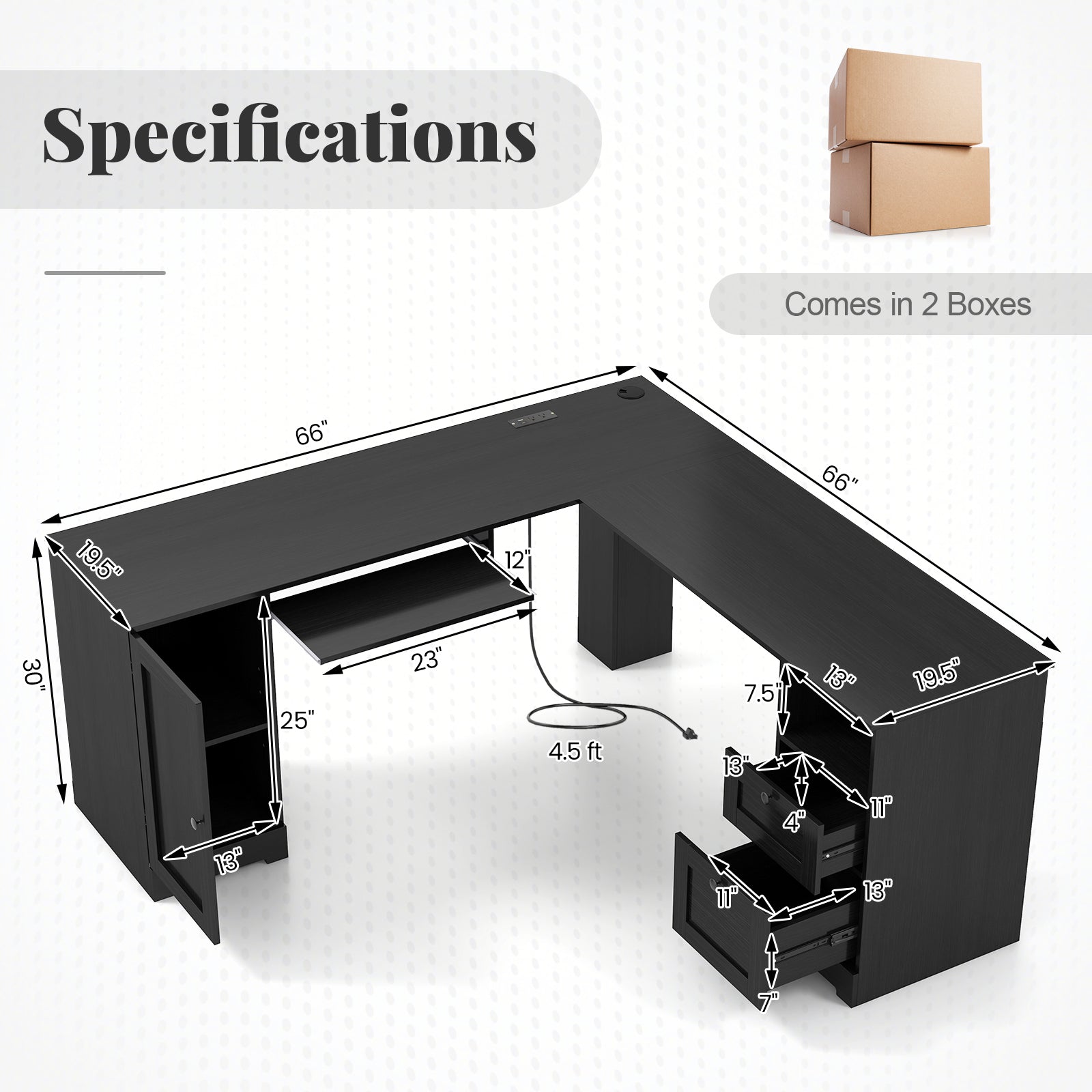Elevate your workspace with this modern and practical computer workstation. With 2 AC outlets (125V/12A) and 1 USB port + type-C port (5V/2.4A), you have multiple charging options for your devices. The corner desk's L-shaped tabletop offers ample space for multiple monitors and other office essentials. Stay organized with an extra keyboard tray, 2 pull-out drawers, and a storage cube, along with a cable management hole to keep wires tidy. Customize your storage with the 5-position adjustable shelf, perfect for accommodating different sized items. The home office desk's multi-functional design fits snugly in corners, saving space and catering to your gaming, studying, or working needs. User-friendly details such as smooth metal slides for easy item access, an easy-to-clean surface, and non-slip foot pads for floor protection as well as stability make this desk a smart and stylish choice for any home office.