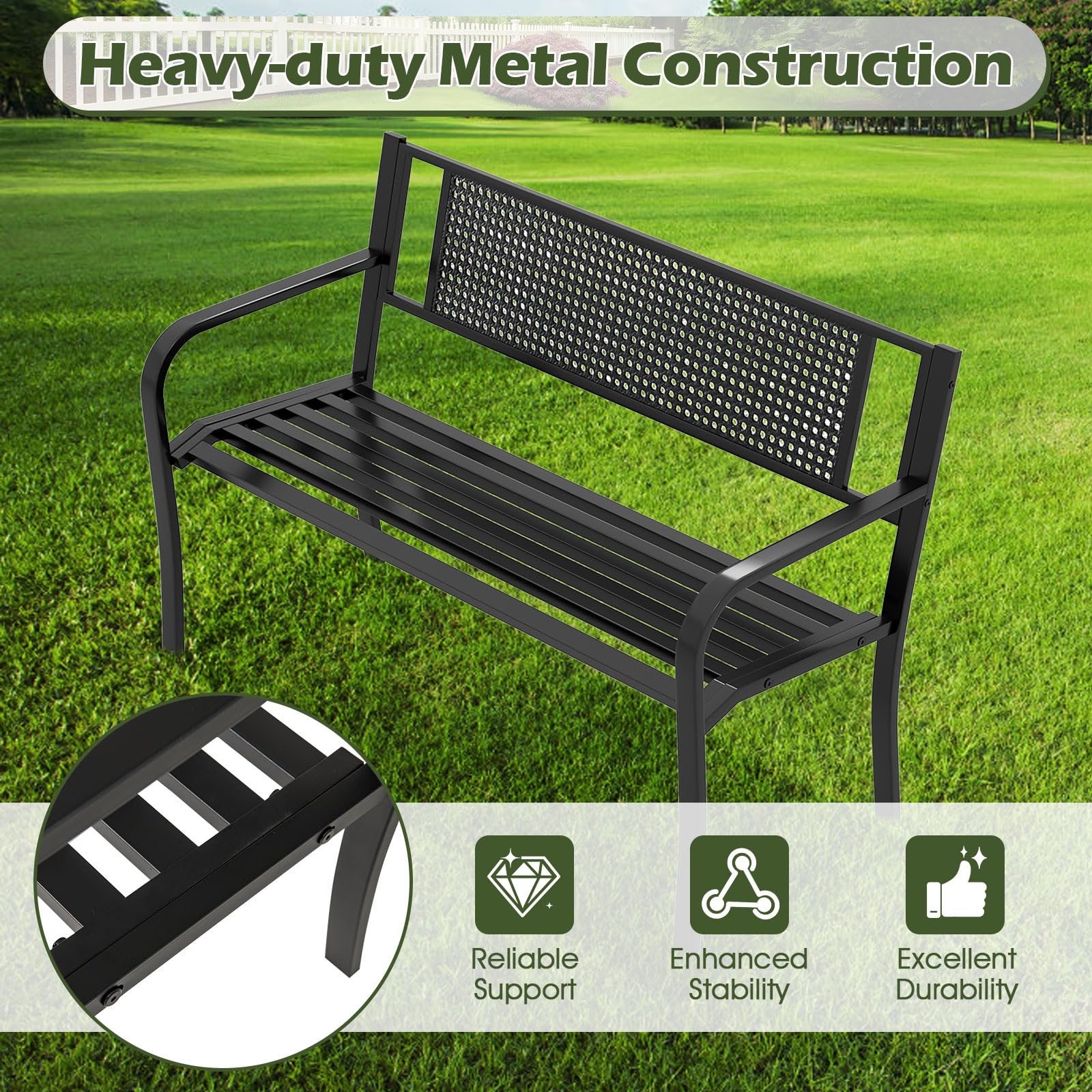 Upgrade your outdoor seating with this robust garden bench! With a weight capacity of 660 lbs, this heavy-duty bench is perfect for any outdoor environment. The ergonomic design includes a tilted backrest, ergonomic seat, and curved armrests for maximum comfort. The generously sized seating area can comfortably fit 2-3 people, making it perfect for gatherings or quiet moments alone. Featuring elegant ironwork patterns and a breathable slatted seat, this patio bench combines style and function effortlessly. Whether on a balcony, in the garden, or at the park, this versatile bench will add charm to any space. Don't miss out on this practical and stylish outdoor seating option!