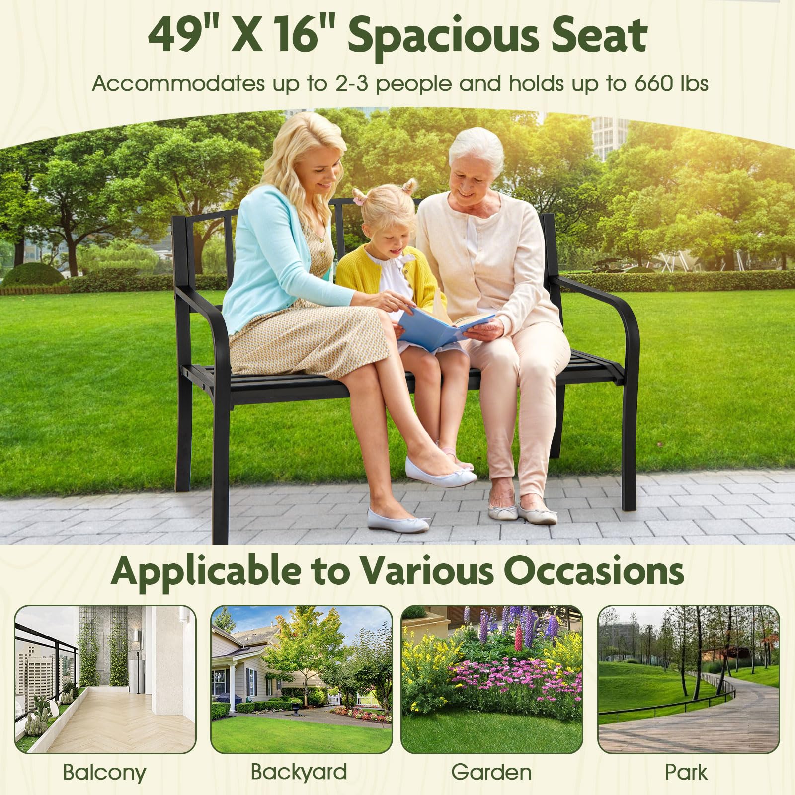 Transform your outdoor space with our robust metal garden bench! Boasting a weight capacity of up to 660 lbs, this bench provides unwavering support and long-lasting durability. Its ergonomic construction, with a gently tilted backrest, slatted seat and curved armrests, ensures ultimate comfort for outdoor relaxation. The generous seating area can easily accommodate 2-3 people, making it perfect for social gatherings or peaceful solo moments. With well-designed details like elegant ironwork patterns and a breathable slatted seat, this bench brings both style and functionality to any outdoor area—whether it's on a balcony, in a garden, or at a park.
