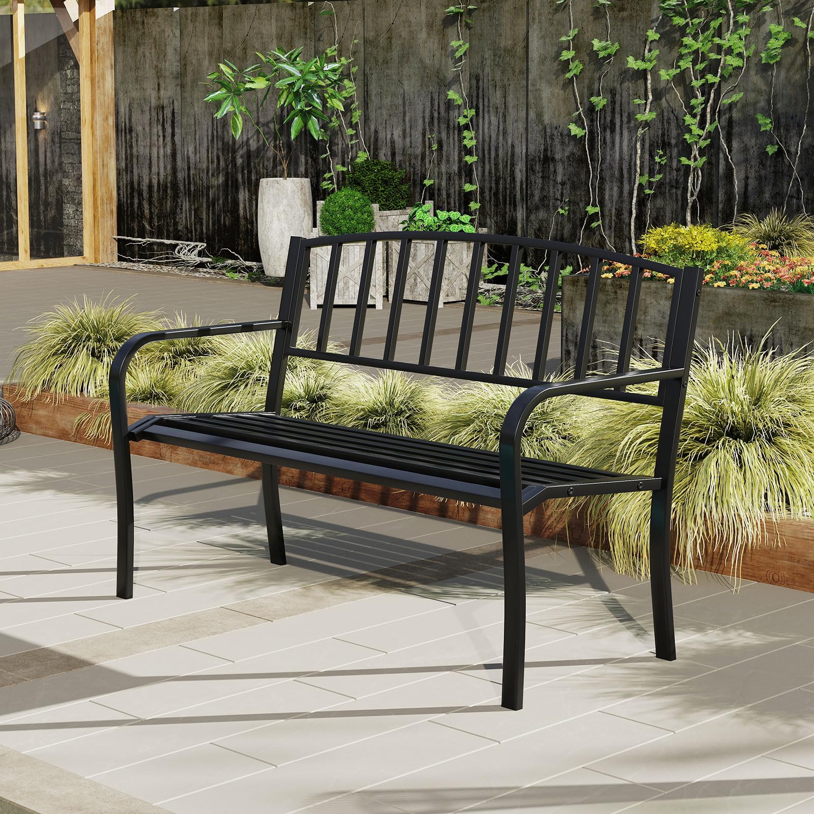 Transform your outdoor space with our robust metal garden bench! Boasting a weight capacity of up to 660 lbs, this outside bench provides unwavering support and durability. Its ergonomic construction, with a gently tilted backrest, slatted seat and curved armrests, ensures ultimate comfort for outdoor relaxation. The generous seating area can easily accommodate 2-3 people, making it perfect for social gatherings or peaceful solo moments. With well-designed details like elegant ironwork patterns and a breathable slatted seat, this patio bench brings both style and functionality to any outdoor area—whether it's on a balcony, in a garden, or at a park.