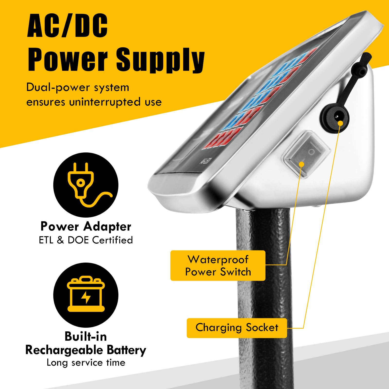 - [AC/DC Power Supply]: This floor scale comes with a power adapter and a built-in rechargeable battery for long service time. So you can power up the scale easily and use it wherever needed, without the hassle of frequent battery replacements.