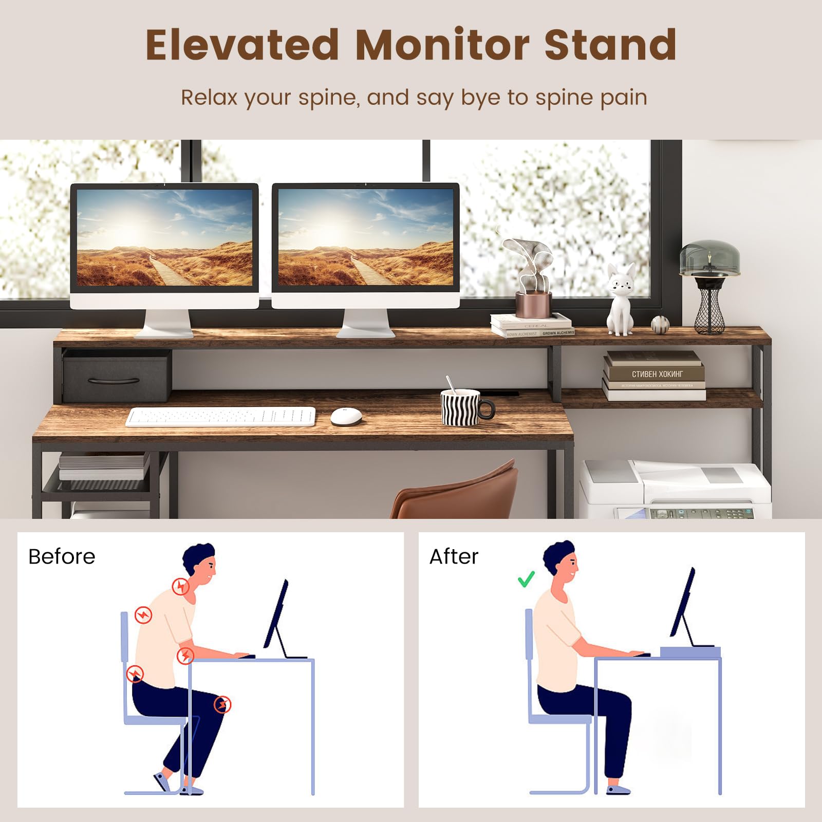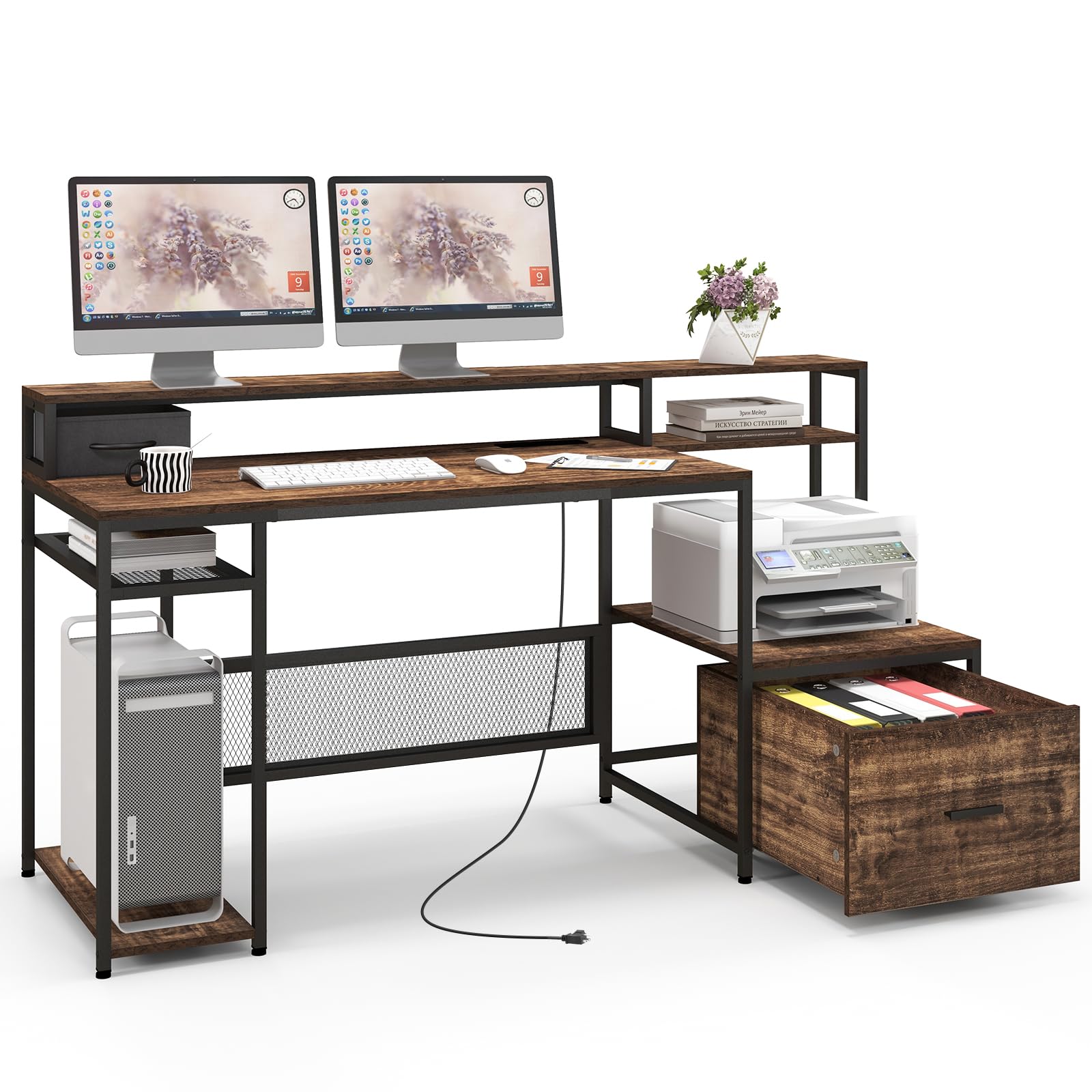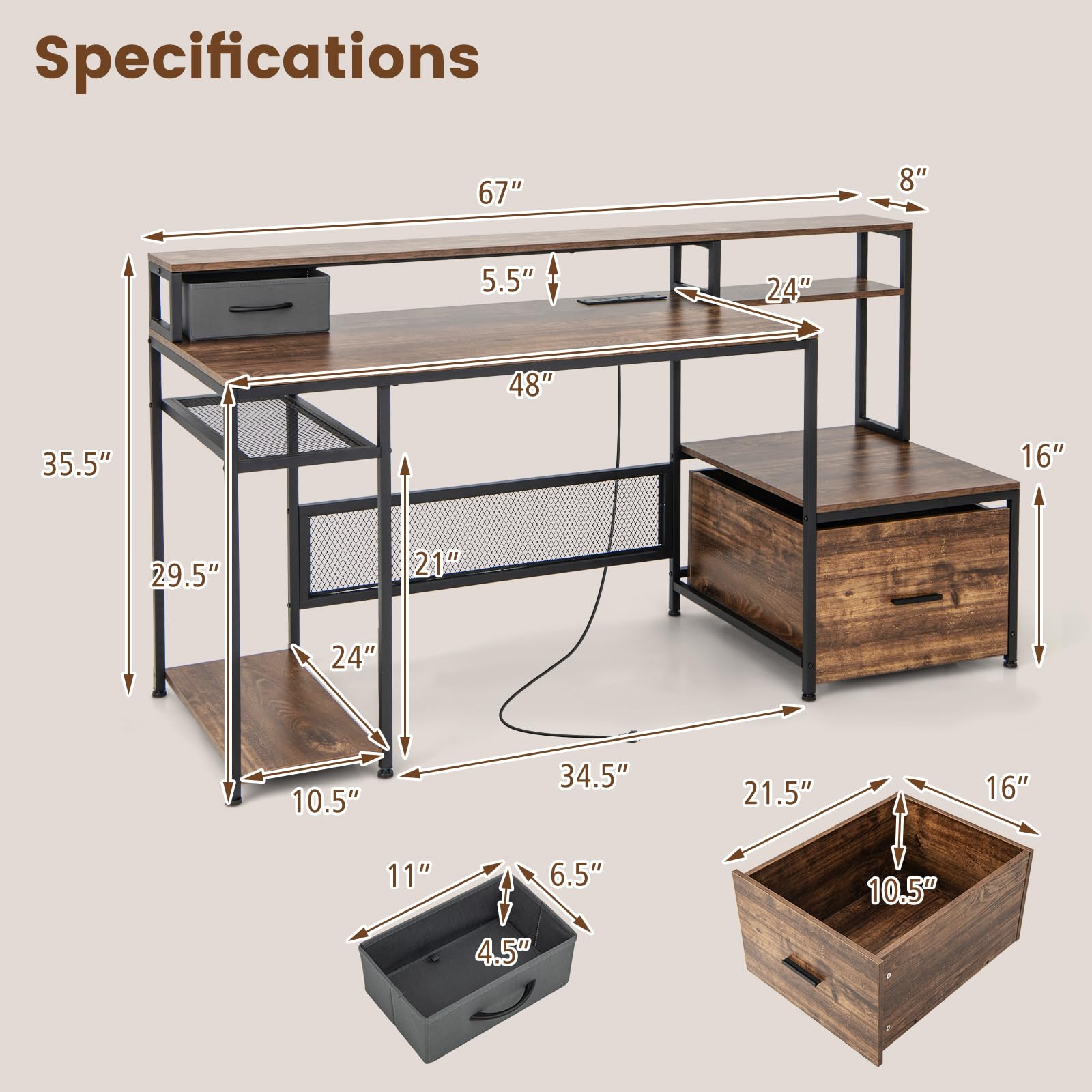 Upgrade your home office with our spacious and functional 67" computer desk, designed to enhance your productivity and comfort. Thanks to a built-in power strip with 2 outlets and 2 USB ports, charging your devices has never been easier. The ergonomic design includes a monitor stand that raises your screen to eye level. You may have been tired of working long hours before, but now you can reduce neck strain during extended work sessions. Stay organized with the rolling file drawer, CPU stand, and storage shelves for keeping all the essentials within reach. The sturdy powder-coated metal frame, adjustable foot pads, and thickened board ensure durability and stability. With its beautiful wood grain and black metal frame, this versatile desk seamlessly blends style and functionality to suit all your work, study, and gaming needs.