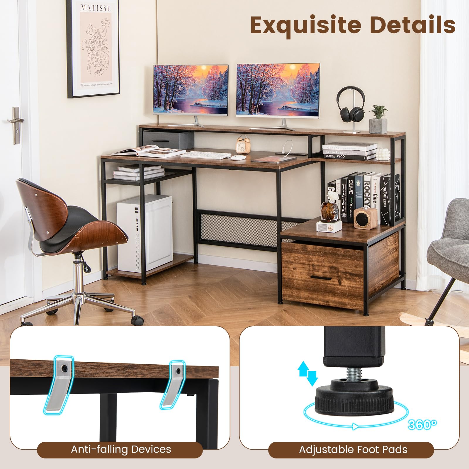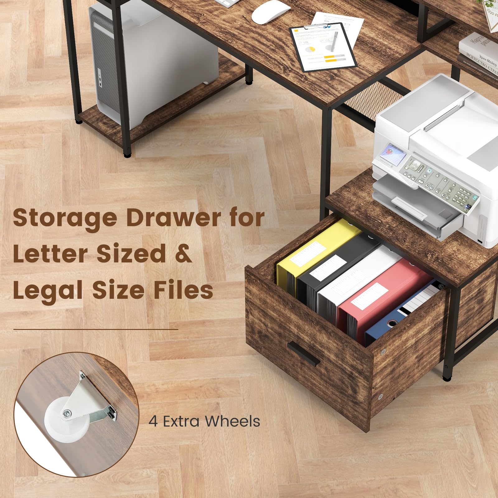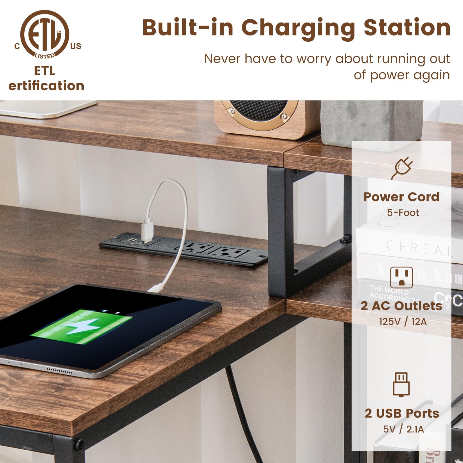 Upgrade your home office with our spacious and functional 67" computer desk, designed to enhance your productivity and comfort. Thanks to a built-in power strip with 2 outlets and 2 USB ports, charging your devices has never been easier. The ergonomic design includes a monitor stand that raises your screen to eye level. You may have been tired of working long hours before, but now you can reduce neck strain during extended work sessions. Stay organized with the rolling file drawer, CPU stand, and storage shelves for keeping all the essentials within reach. The sturdy powder-coated metal frame, adjustable foot pads, and thickened board ensure durability and stability. With its beautiful wood grain and black metal frame, this versatile desk seamlessly blends style and functionality to suit all your work, study, and gaming needs.