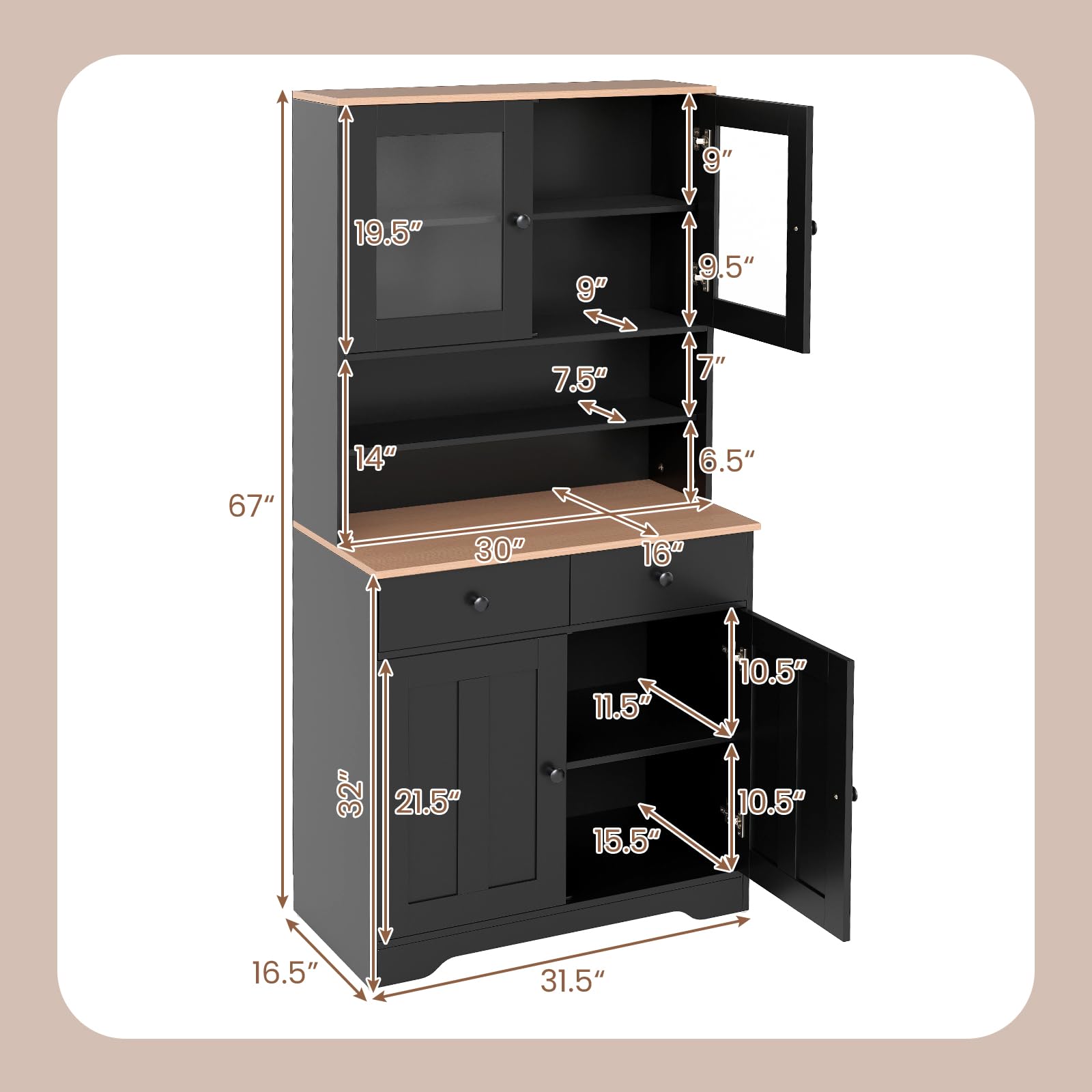 Adorned with 2-door cabinets, it stores various objects and keep them easily accessible. Furthermore, you can customize your storage space with 3 adjustable shelves, ensuring a snug fit and organized look. The addition of 2 drawers and hutch provide ample space to organize essentials. The tall pantry is thoughtfully designed with non-slip pads, promising stability and floor protection. This all-in-one solution is not only perfect for your kitchen but versatile enough for various rooms, from living rooms to entryways, bringing order and sophistication to your space.