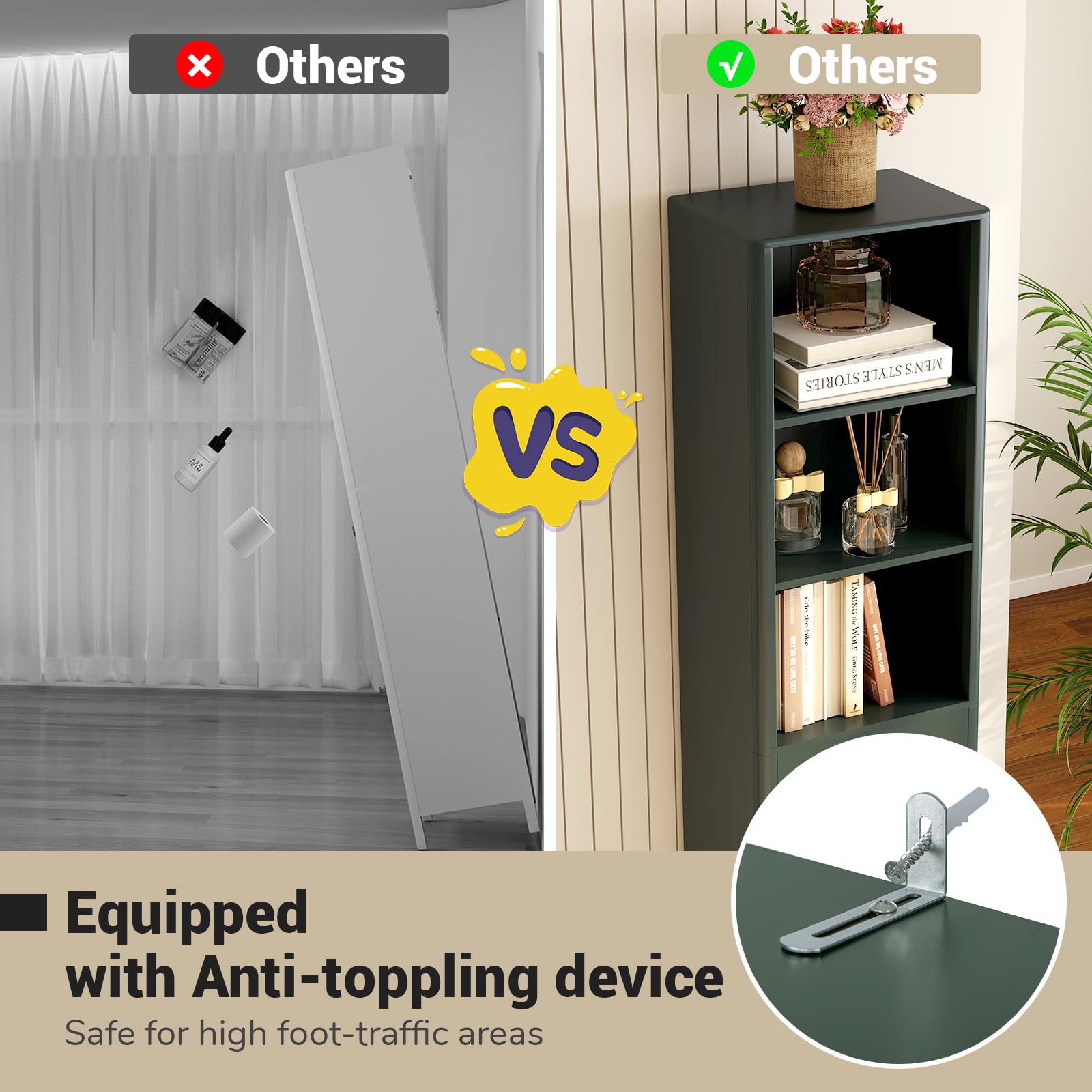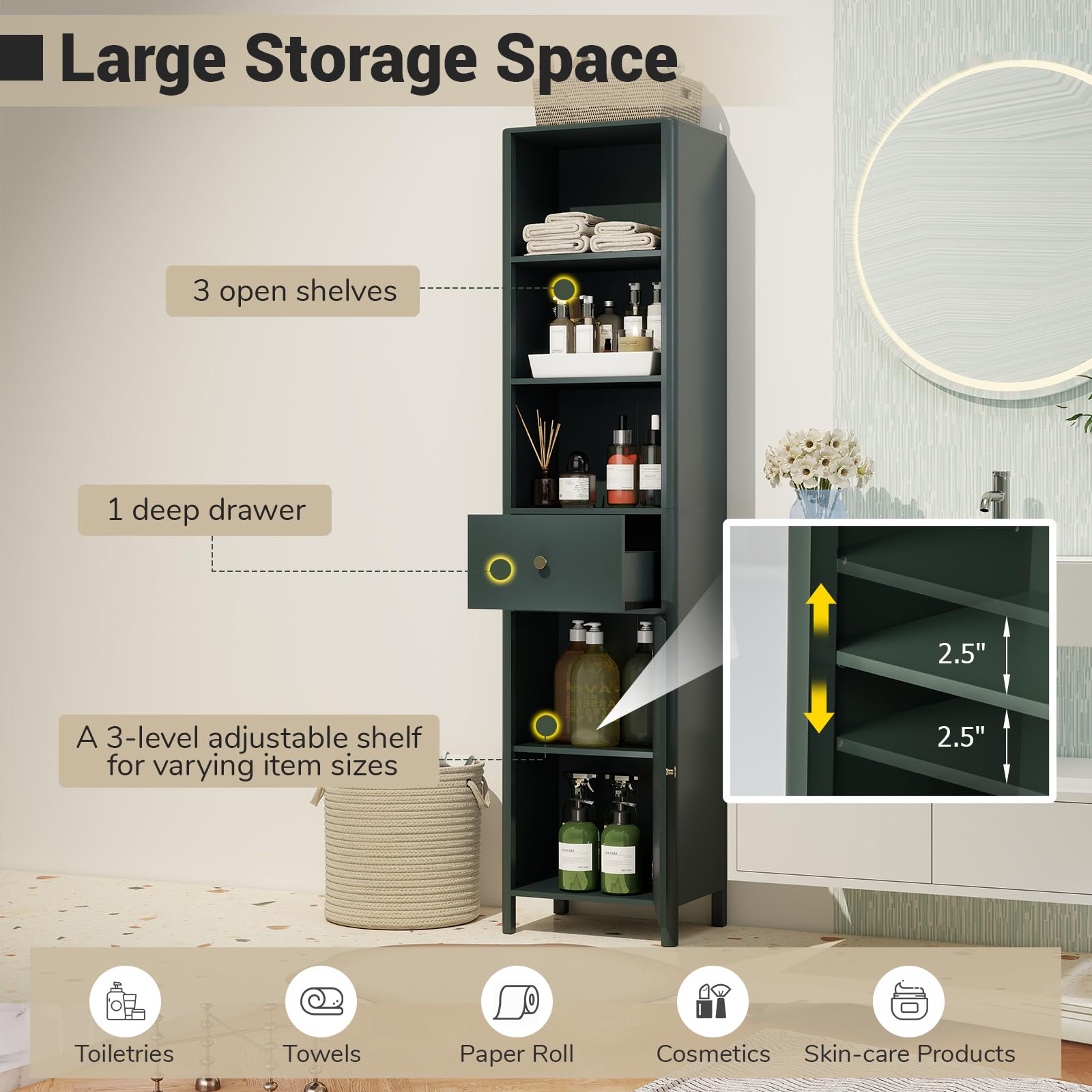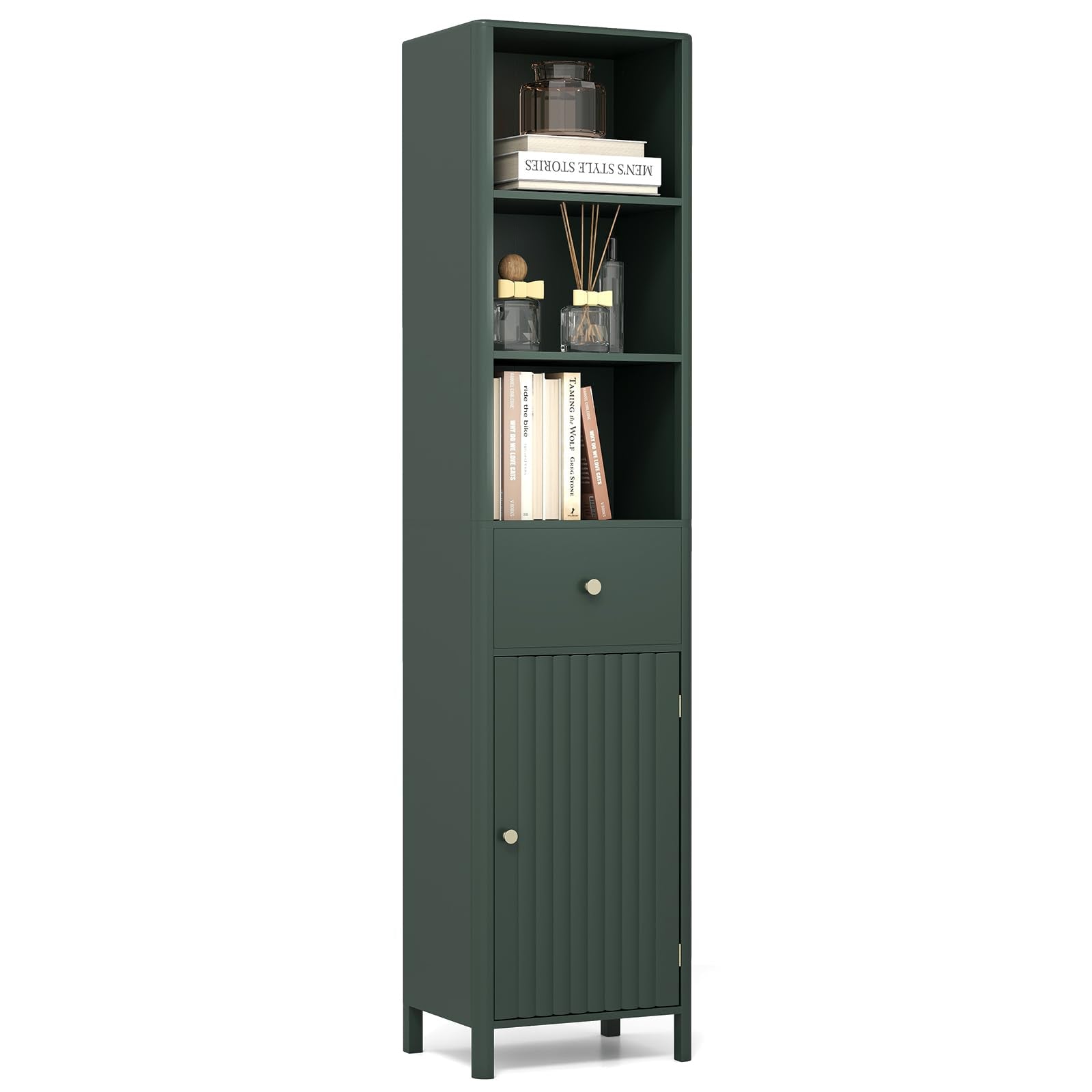 This tall, slim cabinet is perfect for tight spaces like bathrooms, laundry rooms and kitchens. It offers plenty of storage with a deep drawer, 3 open shelves, plus an enclosed cabinet, and the interior shelf can be adjusted to 3 heights to accommodate items ranging from towels to family-sized bottles of shampoo. Built with stability in mind, the cabinet features an anti-tipping safety kit and 4 sturdy legs for added security. Fluted doors and contemporary metal handles complete the look, adding a touch of refined modernity to any room. Declutter with efficiency and elevate your space with our slim bathroom cabinet!