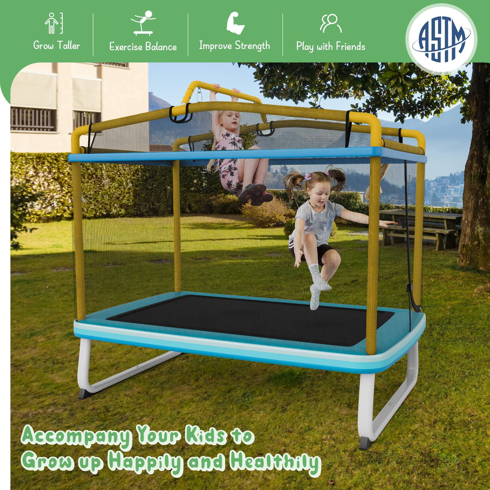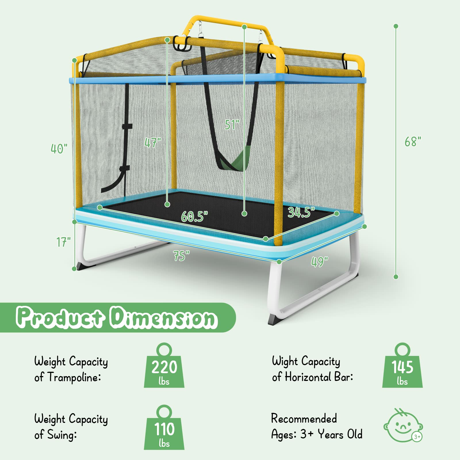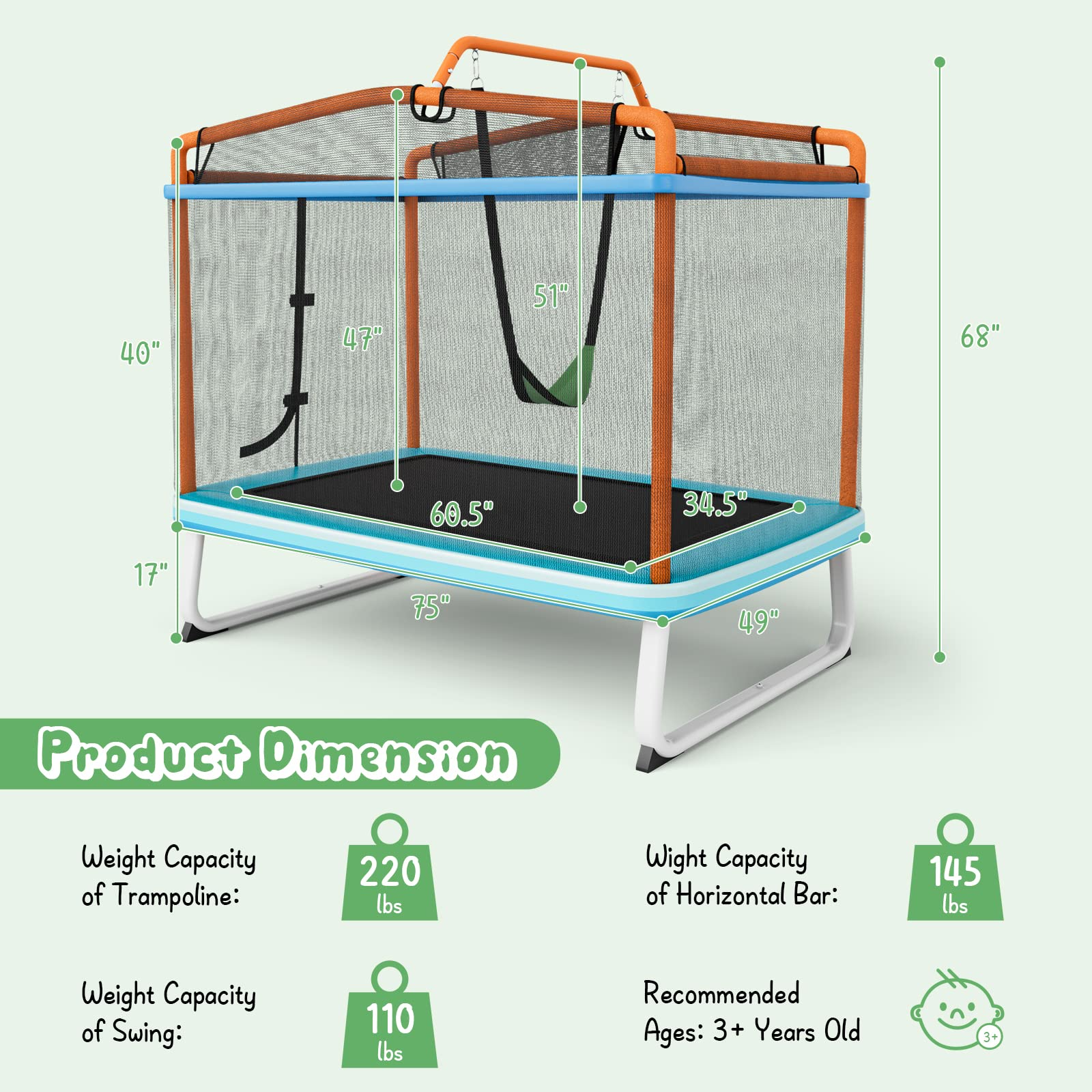- 3-in-1 Versatile Design: Apart from serving as a trampoline, the ASTM-approved toddler trampoline is also available in a swing and horizontal bar. As a result, the kid's trampoline with the net is able to offer your child multiple choices for fun with his/ her intimate friend.