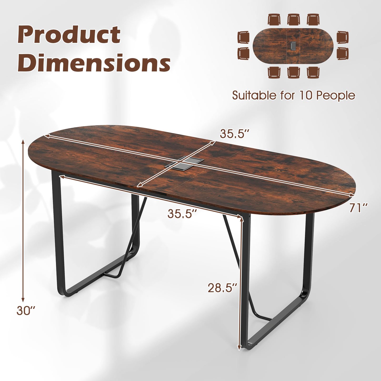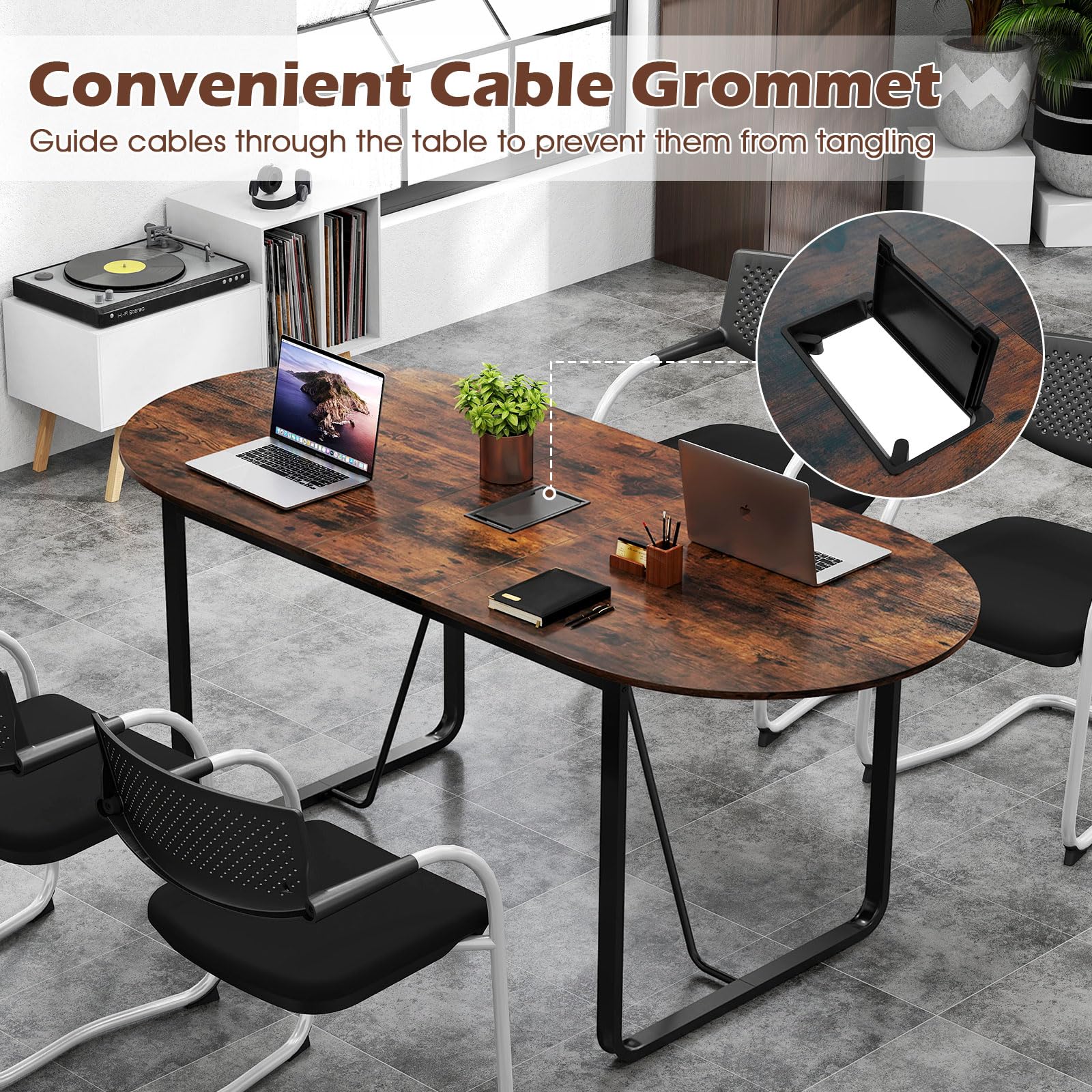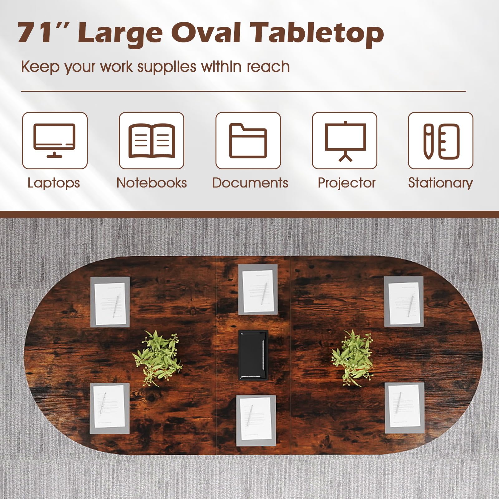 This oval meeting table boasts a generous 71" tabletop, offering plenty of space for all your office essentials while comfortably seating up to 6-8 people for larger gatherings. Additionally, center cable management grommet with cover ensure that wires remain neatly organized and discreetly hidden. Constructed with thickened tabletop board and heavy-duty metal frame, this conference table promises exceptional sturdiness and durability. The adjustable foot pads protect your floor and make leveling the table on uneven surfaces a breeze. Whether placed in a reception room, office space, or collaborative area, this versatile conference table is an elegant and practical solution to satisfy all your meeting needs across multiple settings.