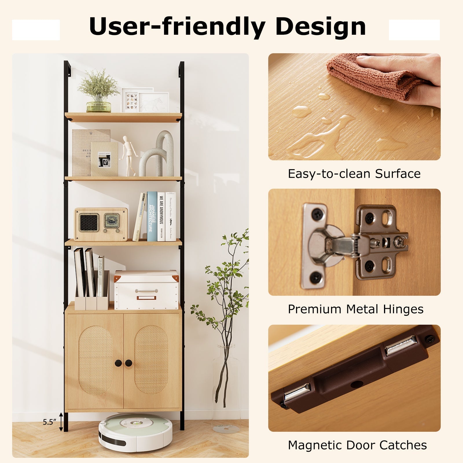 Transform your space with chic safety! Discover the space-saver that blends function?and style! Our ladder bookshelf is not only a stunning focal point with its elegant rattan doors and sleek vertical design, but it’s also built to last with a robust double anti-tipping mechanism and secure wall anchoring. Versatile? Absolutely! Show off your beloved book collection, vintage treasures, or chic decorations?on its spacious 3-tier shelves, and hide away the clutter in the cleverly concealed adjustable cabinet below. More importantly,?this versatile unit?stands tall at 72.5” and keeps your floor pristine with an easy-to-sweep space underneath. Let safety meet style in your home today!