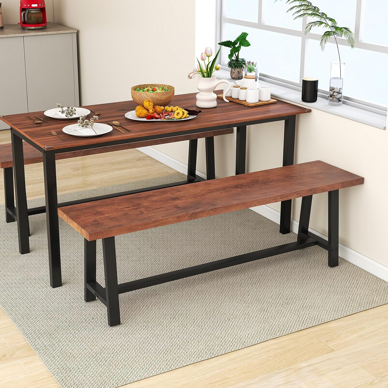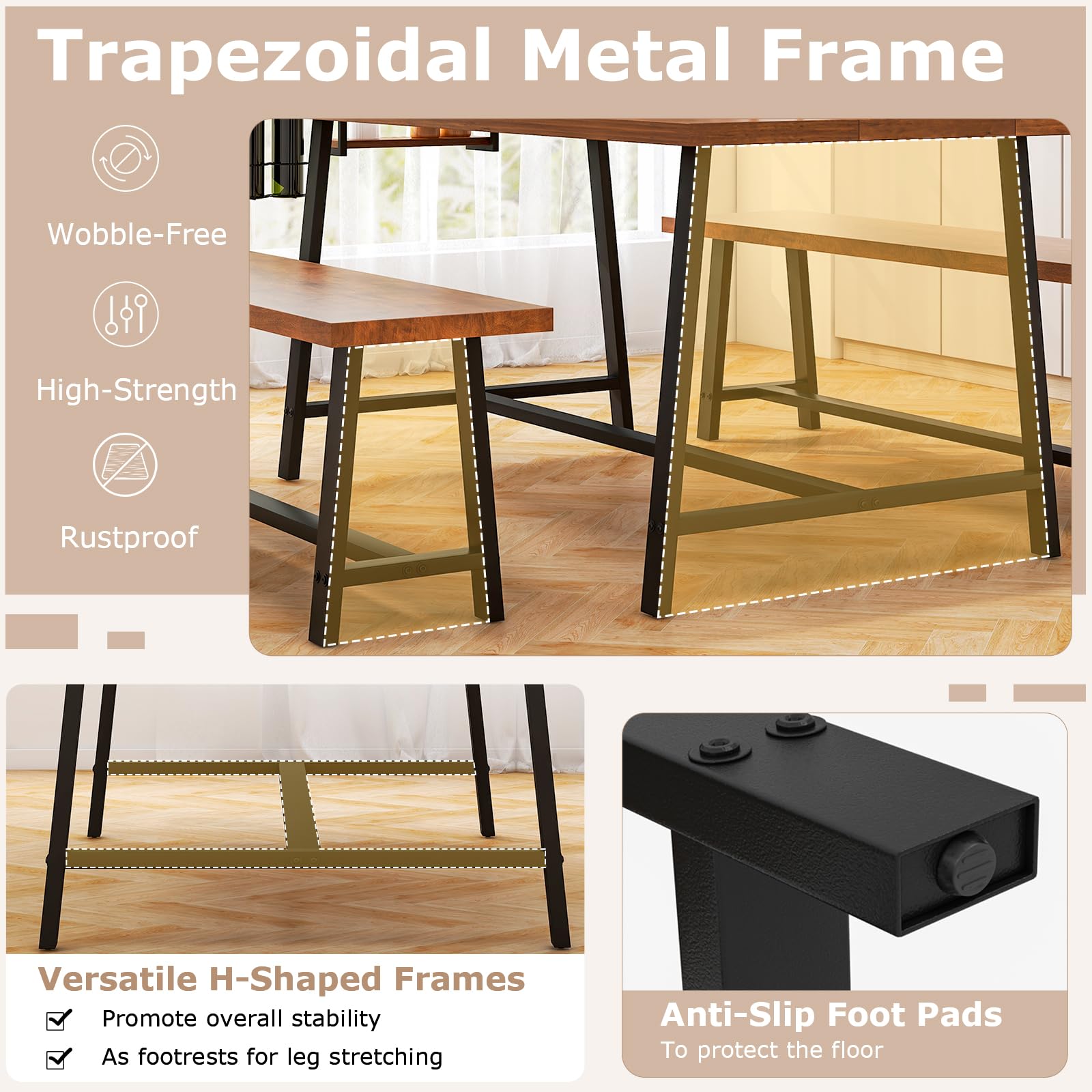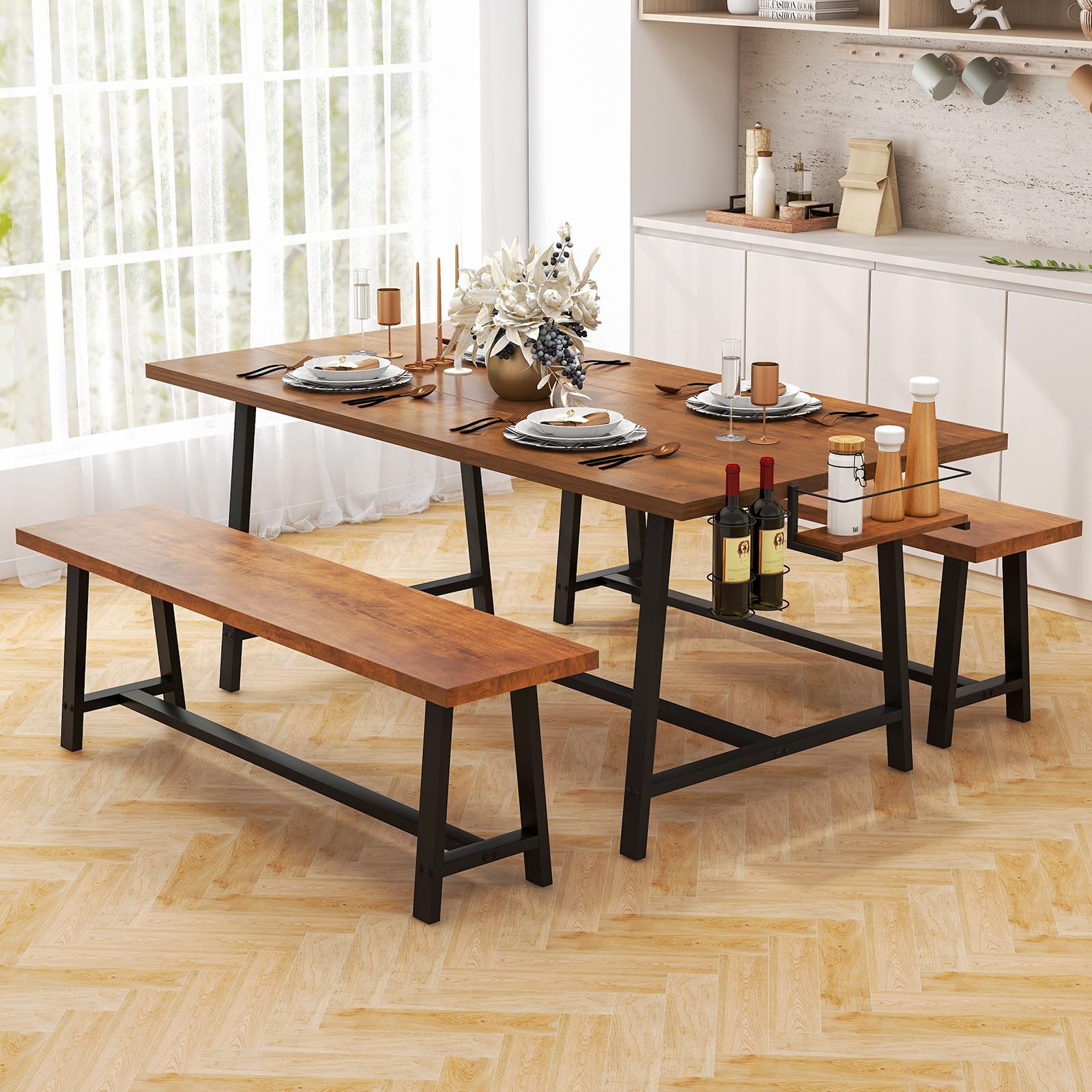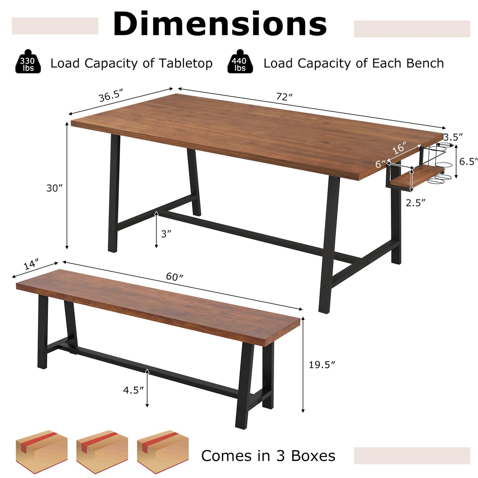 Infuse your dining experience with the fusion of industrial chic and practicality with our 3-piece dinette set. The ensemble includes a robust kitchen table with a capacity of 330 lbs, flanked by 2 sturdy benches, each supporting up to 440 lbs, all resting on a rustproof metal frame with protective anti-slip foot pads to promote overall stability. Designed to comfortably seat up to 8 guests, this kitchen set ensures convenience with integrated footrests for a relaxed posture and a 2-bottle wine rack plus a spice holder for your drinks, wine glass, spice jars, and more. The wood-grain finish on anti-crack boards introduces an industrial aesthetic to your home, while the smooth surface allows for easy cleaning.