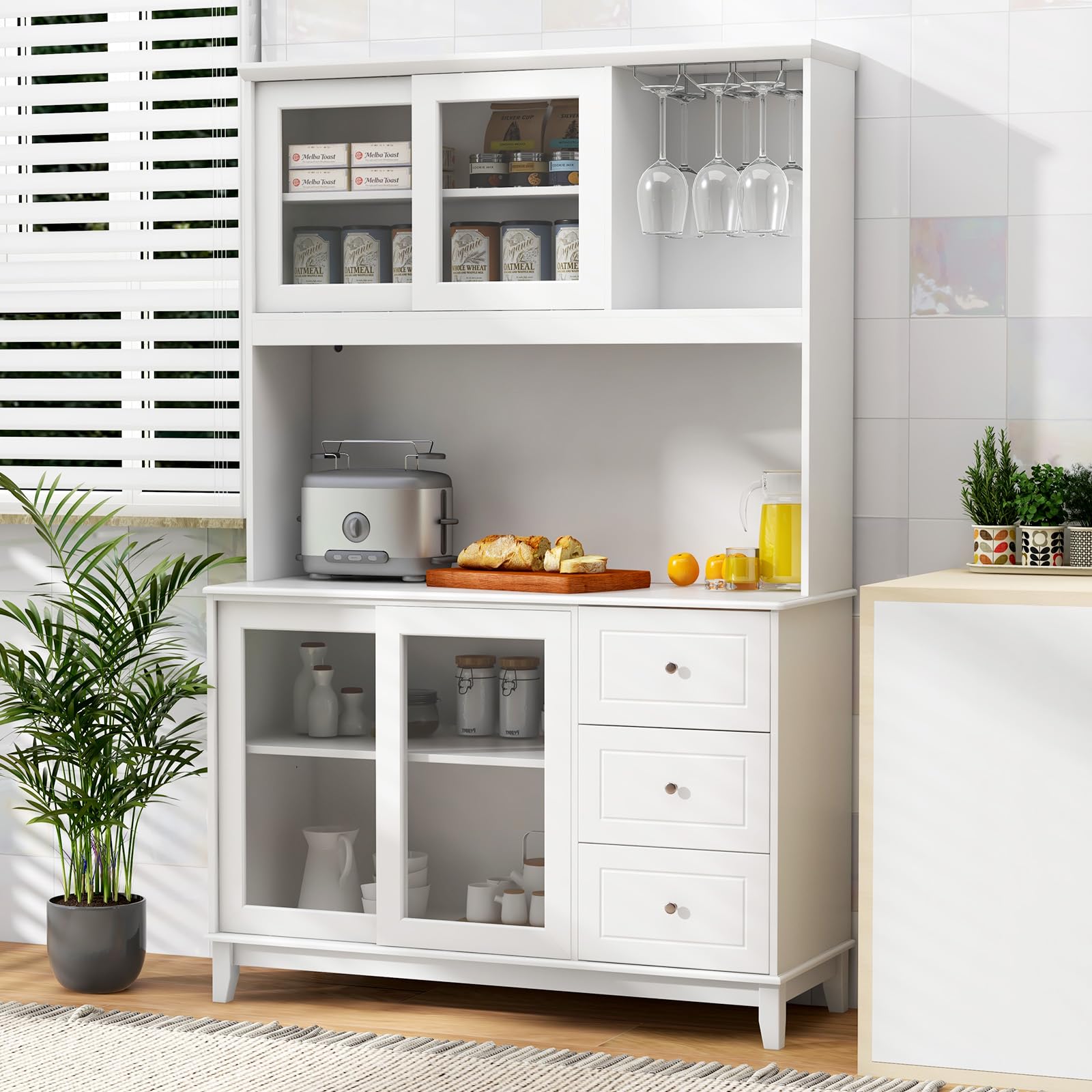 • [Sufficient Storage Space]: Our kitchen pantry storage cabinet is designed with 2 compartments with doors, an open compartment with wine glass holder, 3 deep drawers and a spacious countertop for all your kitchen necessities. The top of the cabinet can also be utilized as a storage shelf.