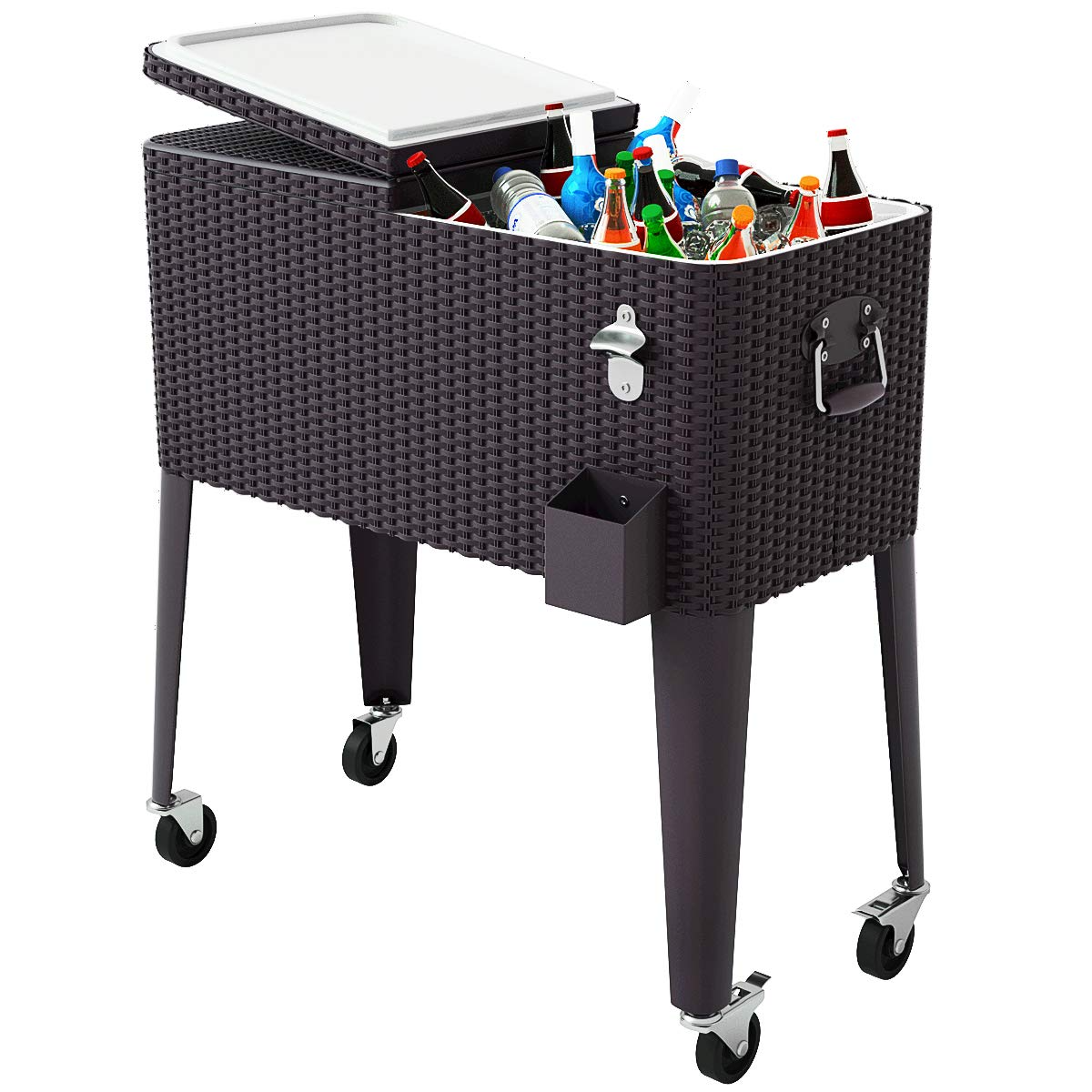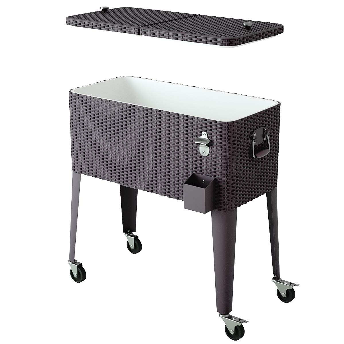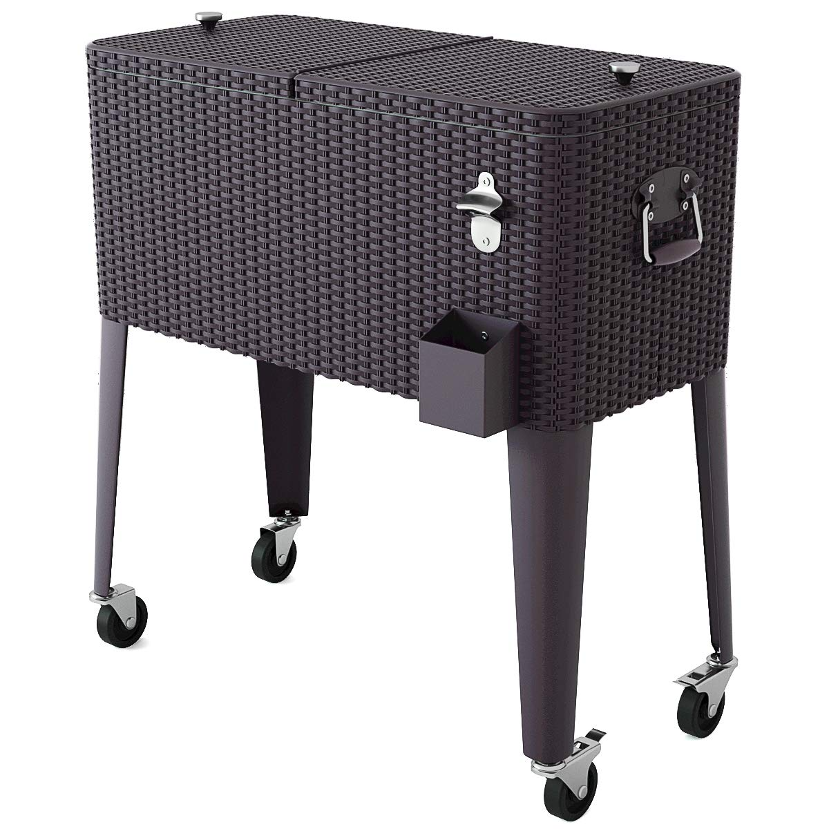 This is Our 80 Quart PP Rattan cooler cart and it will add beauty, style and functionality to your patio. This cooler cart features refrigeration insulation and perfectly enables to keep a variety of drinks, such as water, wine, beer, vintage juicy and other for 36 hours. For convenience, this cooler is humanized designed and comes with a bottle opener and a cap catcher as well as a drainage plug for easy daily use and care; furthermore, it is equipped with two side handles for carry or pull, and the special designed dual top lids for easily opening and closing.