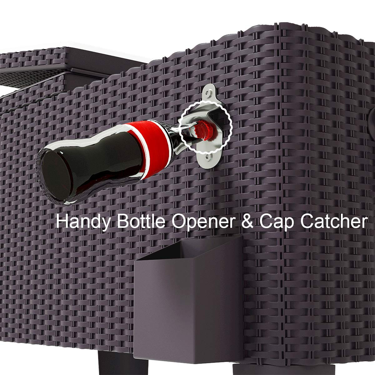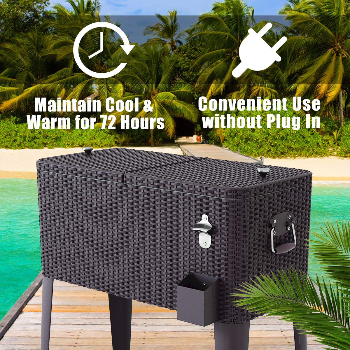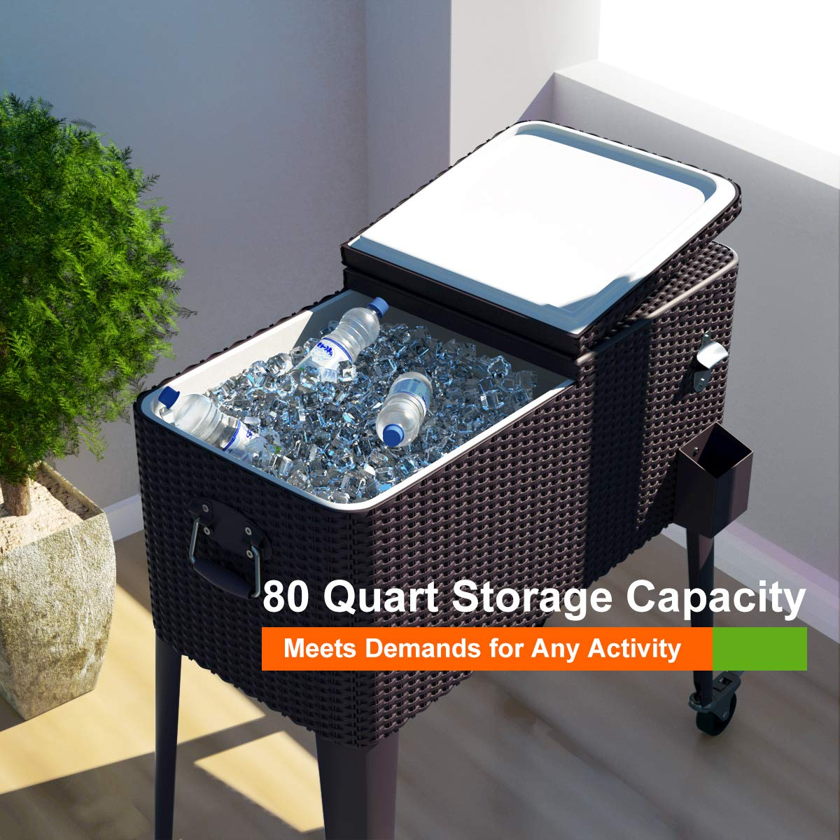 This is Our 80 Quart PP Rattan cooler cart and it will add beauty, style and functionality to your patio. This cooler cart features refrigeration insulation and perfectly enables to keep a variety of drinks, such as water, wine, beer, vintage juicy and other for 36 hours. For convenience, this cooler is humanized designed and comes with a bottle opener and a cap catcher as well as a drainage plug for easy daily use and care; furthermore, it is equipped with two side handles for carry or pull, and the special designed dual top lids for easily opening and closing.