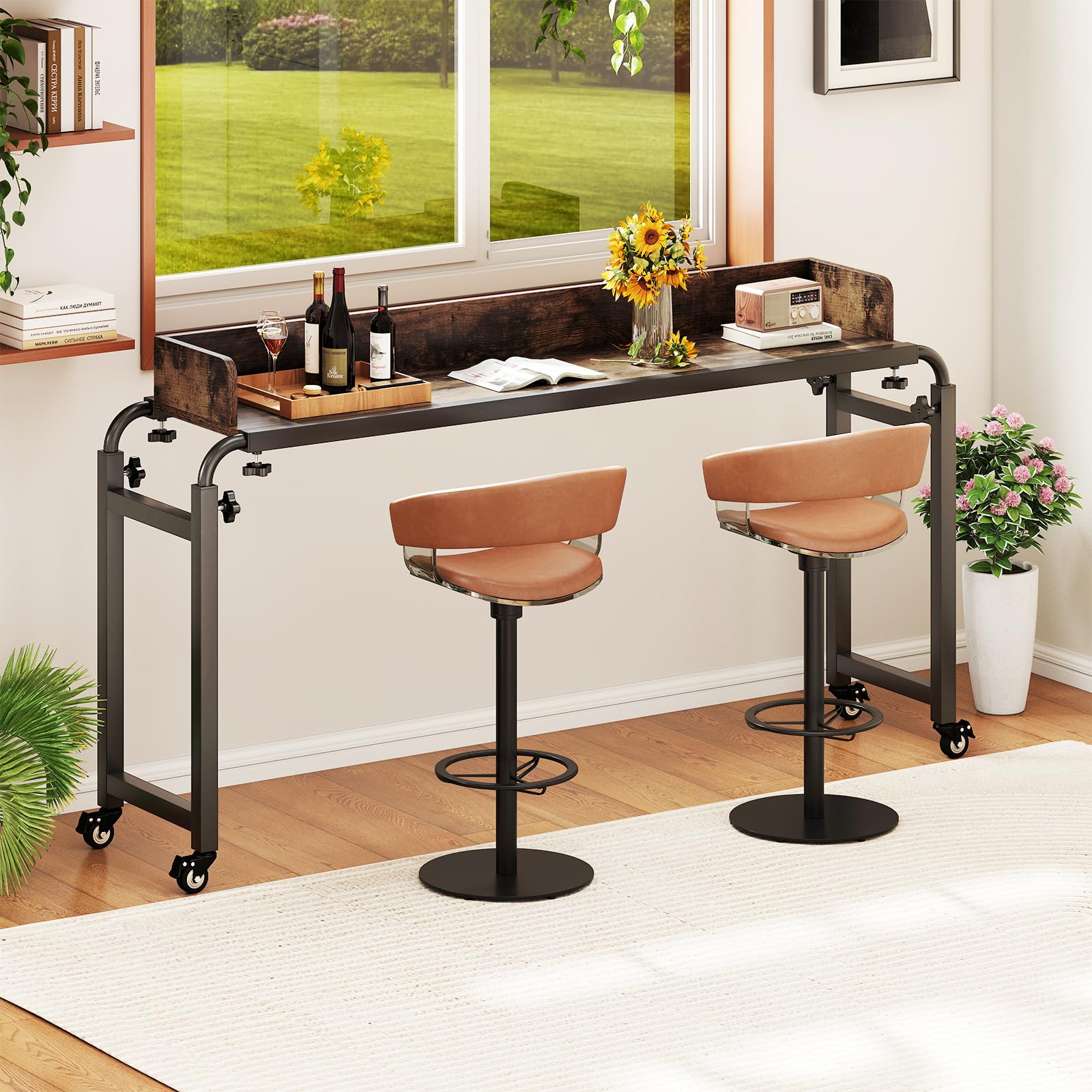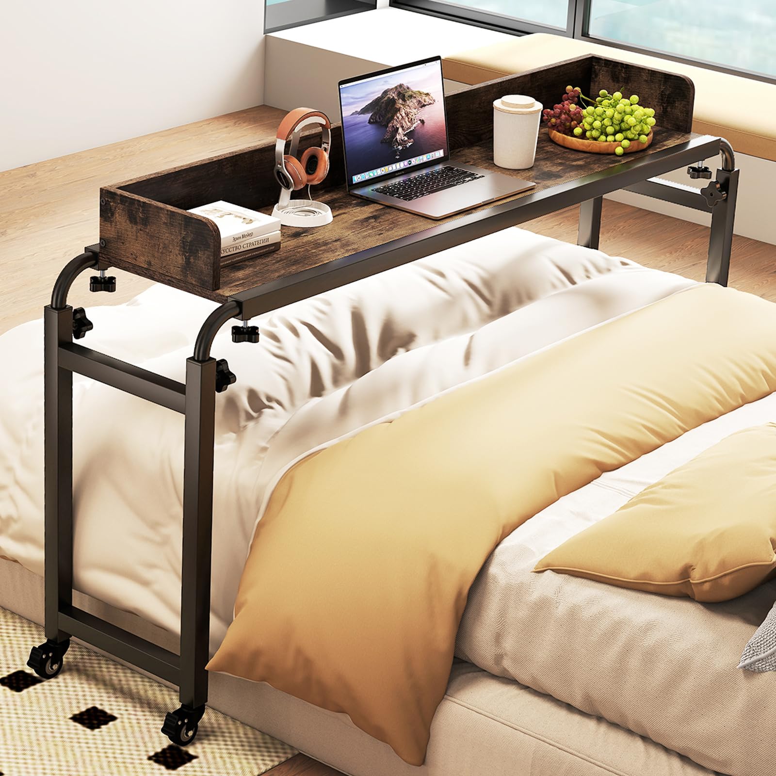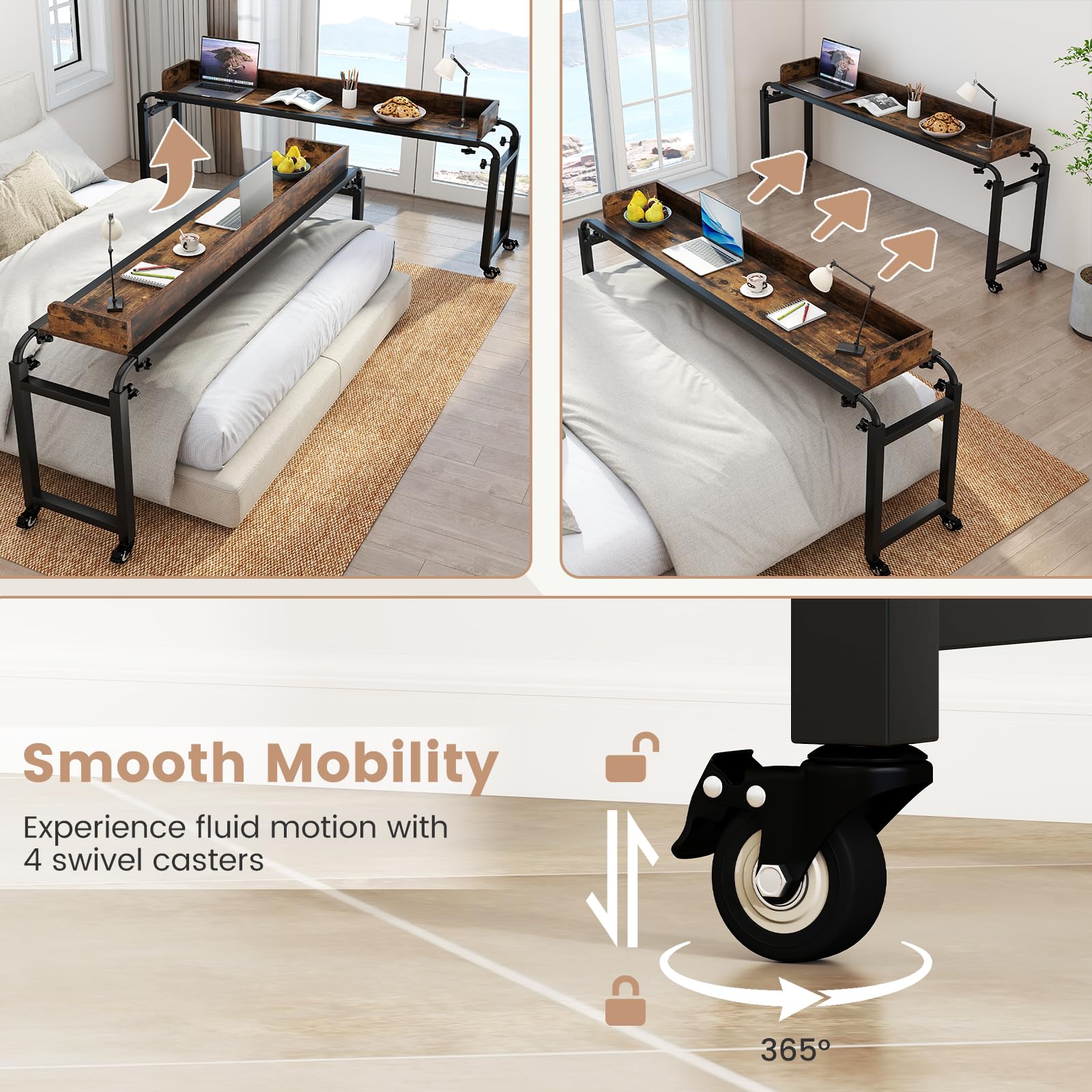 With adjustable height (29"–40.5") and length (53.5"–81"), the desk easily fits different bed sizes and user preferences, providing personalized comfort. Four 360° rolling wheels ensure smooth movement across any surface, while the lockable design keeps the desk steady during use. The spacious tabletop offers ample room for daily essentials, and its 4" raised edge prevents items from slipping off. Built with a heavy-duty metal frame and reinforced boards, this table delivers long-lasting strength and stability—perfect for bedrooms, living rooms, and home offices alike.