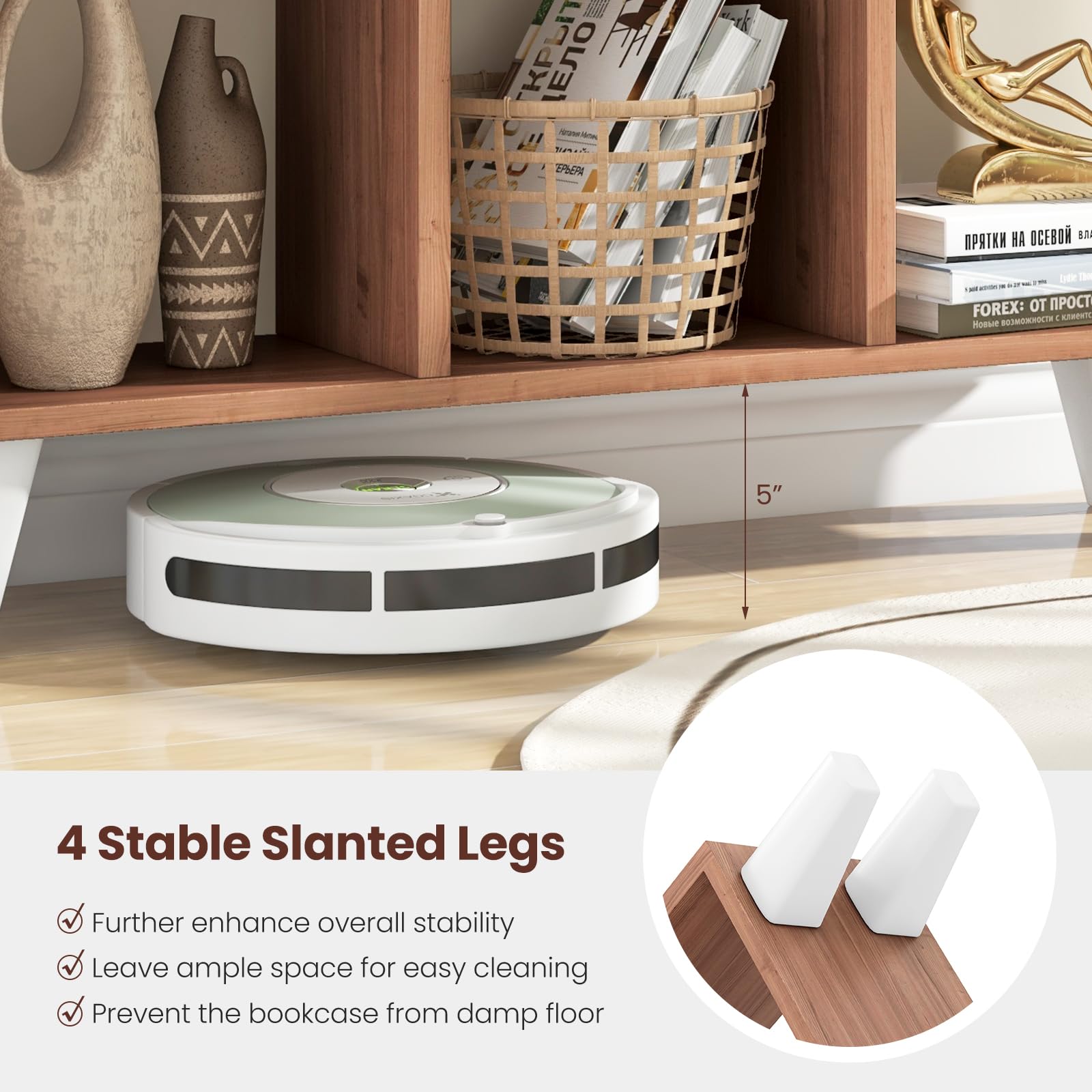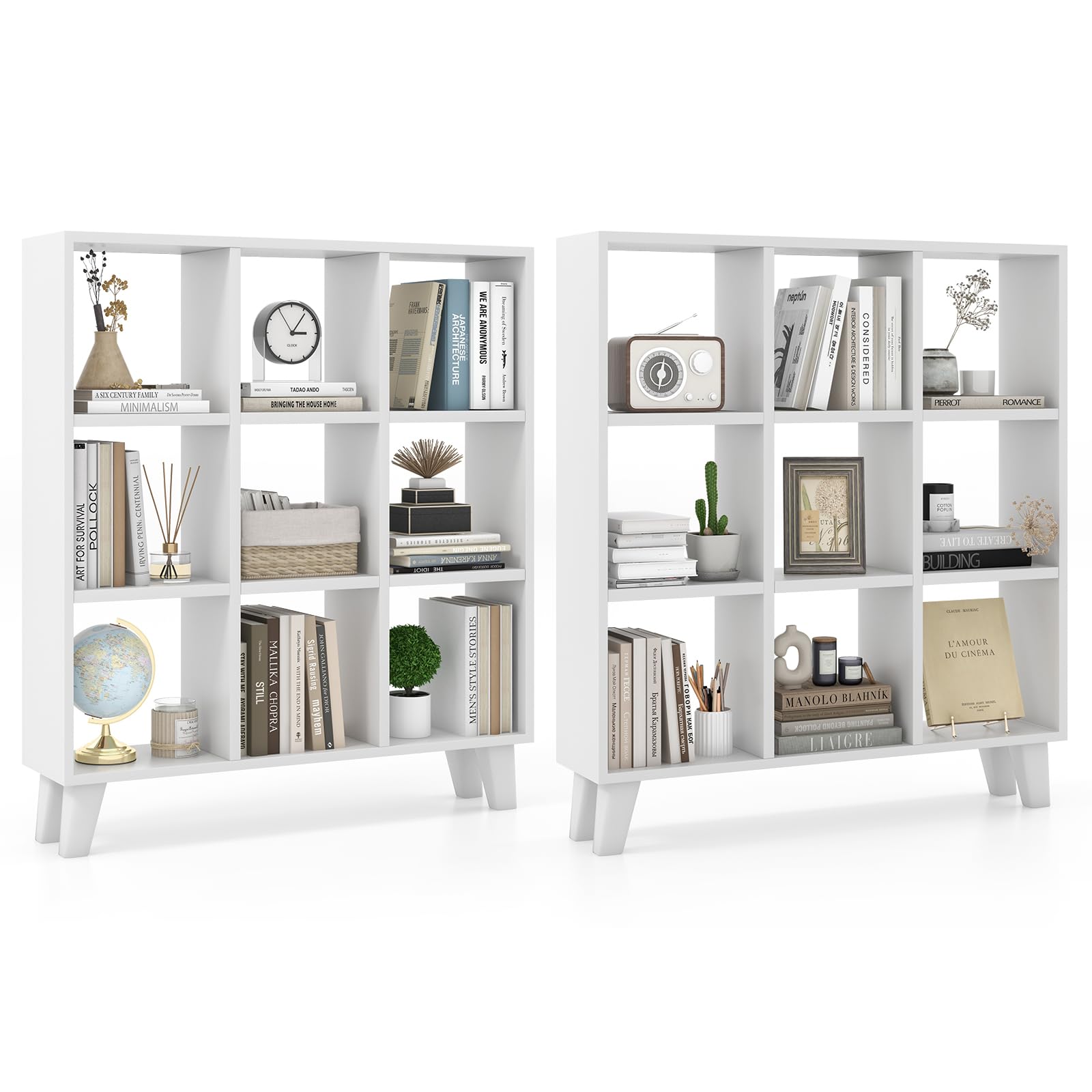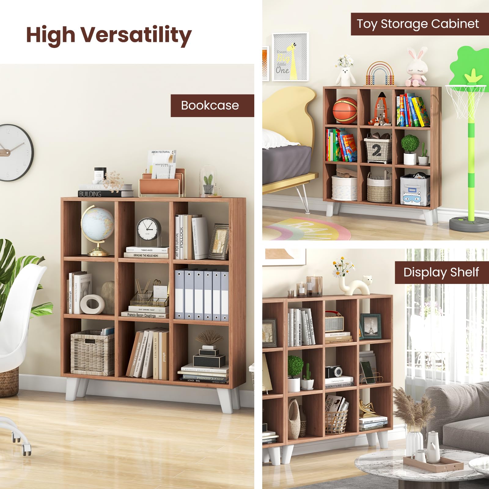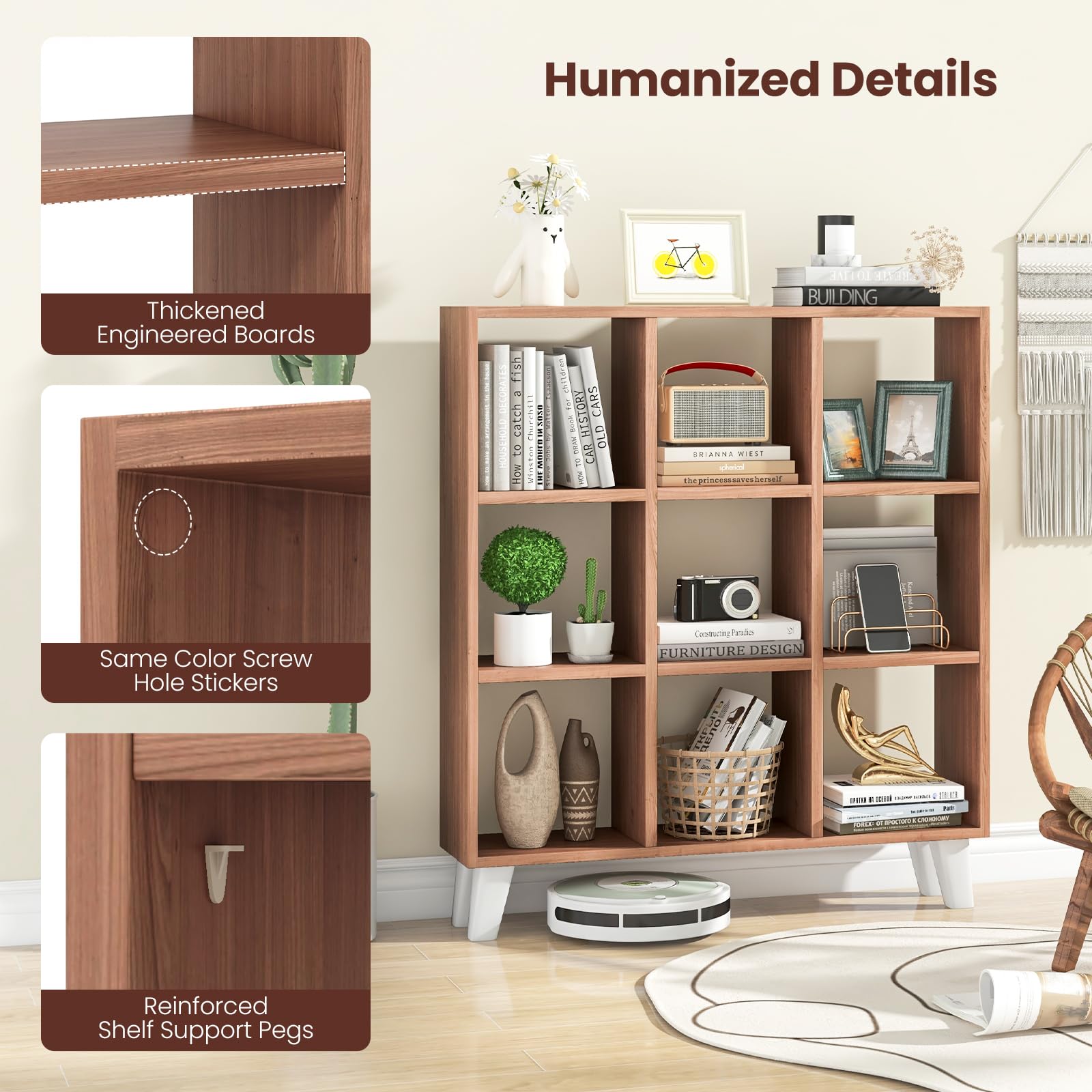 With 9 fully open compartments, you can store books, small decorations, bins, collectibles for easy access. And all 6 shelves are detachable, which allows for customized storage for different sized items. Constructed of thick boards, the bookcase is built to last. While the sturdy leg support brings exceptional stability to avoid wobbling during use. Moreover, proper raised height makes it easier for robot cleaning. As a practical storage solution, our cube storage organizer enhances the overall aesthetic of any living space, large and small.