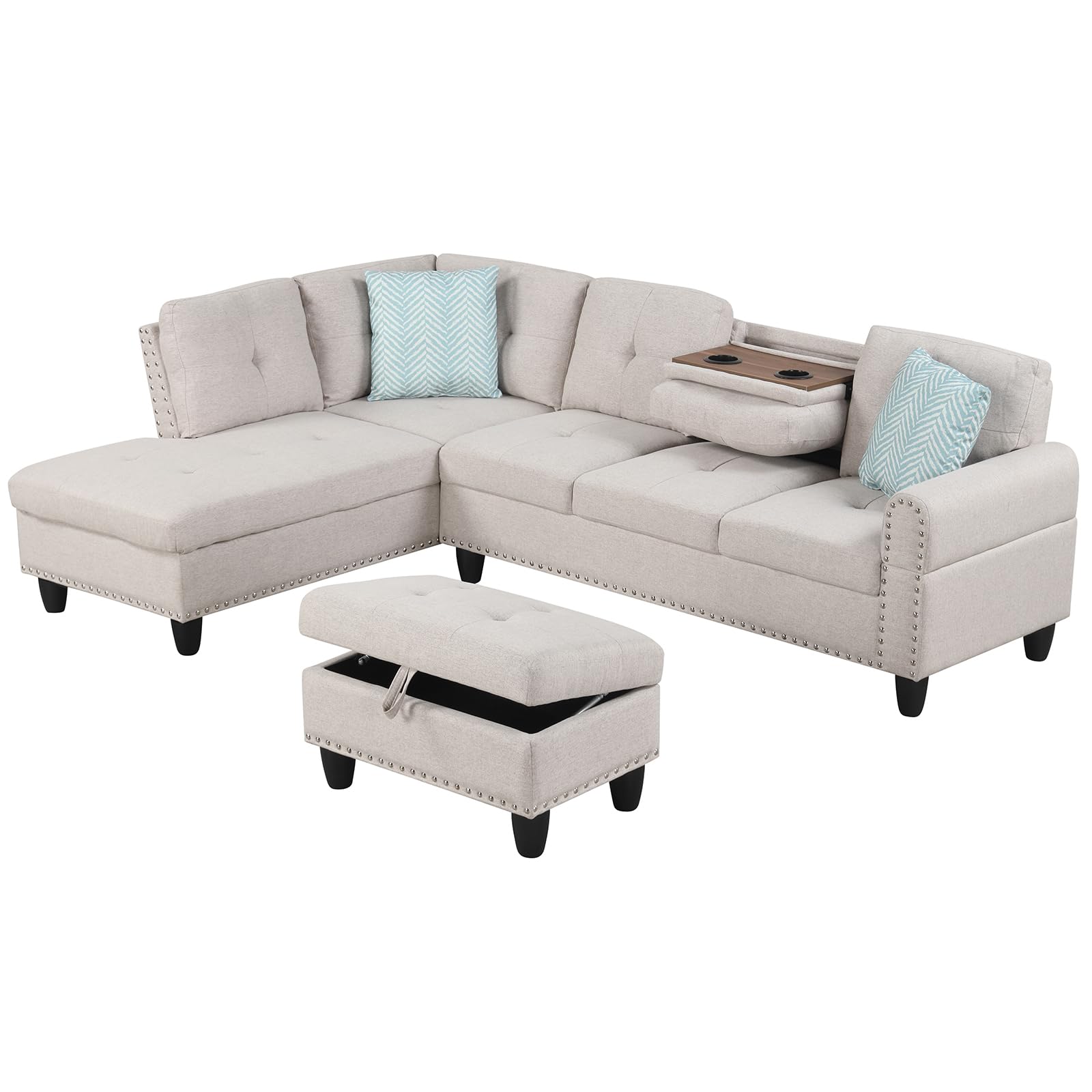 Enjoy ultimate comfort in your living room with our L-shaped sofa with an ottoman! With 1 chaise lounge, 1 loveseat, and 1 ottoman, you can customize your resting space as your like. The storage ottoman can also tuck away blankets, remote controls, or magazines, keeping a tidy and inviting area. You can also place your legs on the ottoman to relax. One of the backs can be converted into a tray with 2 cup holders to place your beverages. The backs and seats feature high-quality linen fabric cover and soft sponge filling. Additionally, 2 pp cotton filled pillows provide you with added comfort. The L-shaped sofa couch is an ideal choice for living rooms, offices, small apartments, and more. Whether entertaining friends or enjoying a quiet evening, this sectional sofa is your go-to option.