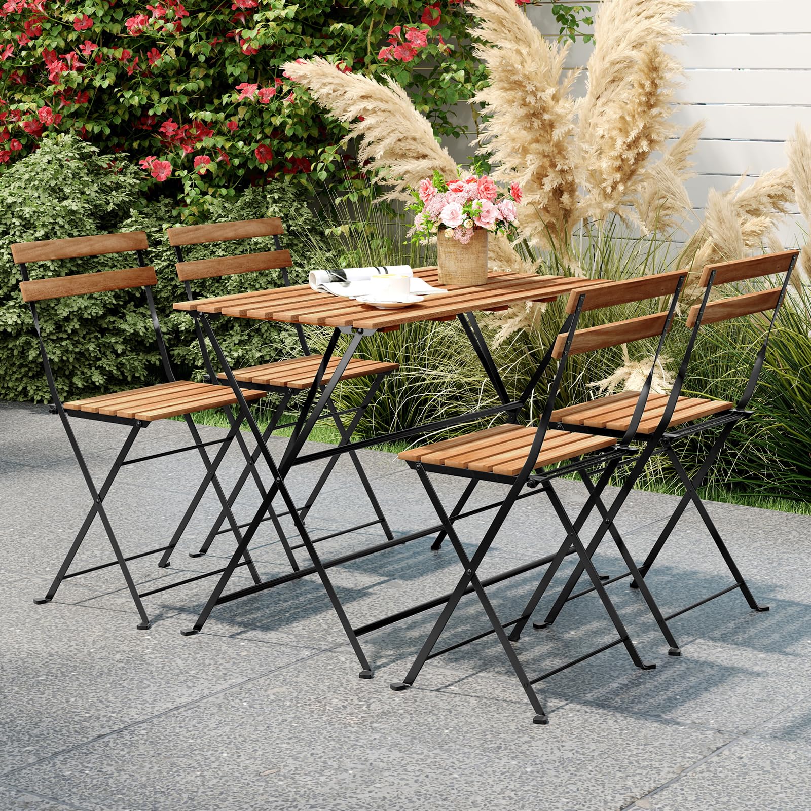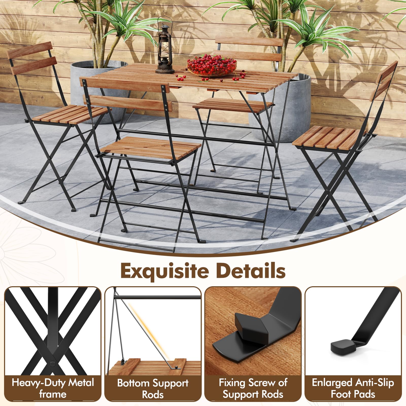 Constructed from premium acacia wood, the tabletop, seat and back of this furniture set withstand long-time use and showcase much elegance. The whole table and chair set is supported by solid metal frames with anti-slip foot pads for added stability, while fixing screw of support rods ensures reinforced strength. The quick-folding chairs offer practicality and ease, allowing for simple storage and transport. Whether positioned indoors or outdoors, this patio set fits seamlessly into any setting from garden to dining room. This patio set with exquisite details not only serves as a functional addition to your space but also enhances your decoration with its natural elegance.