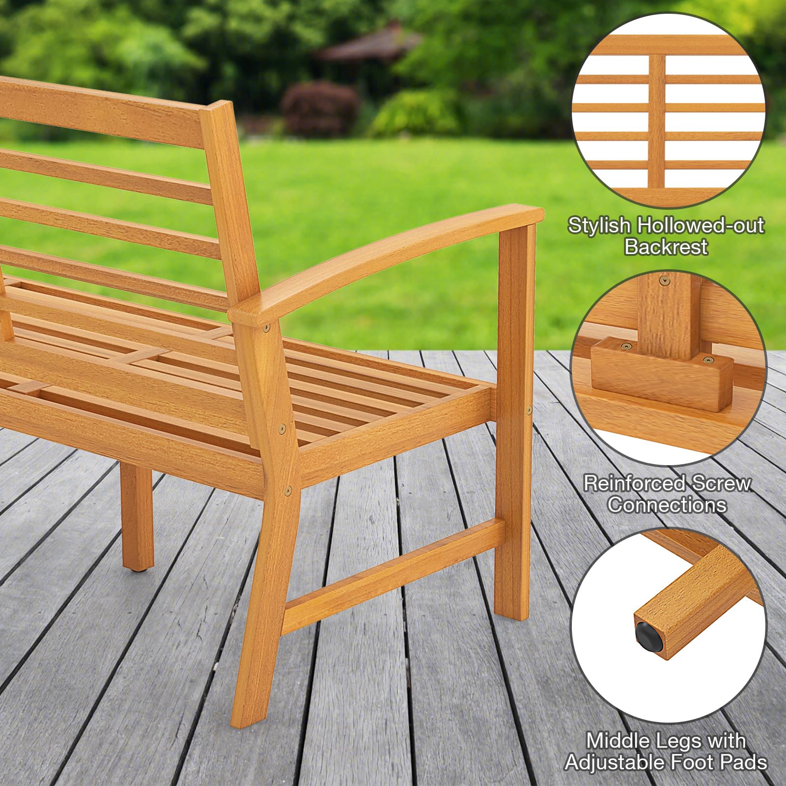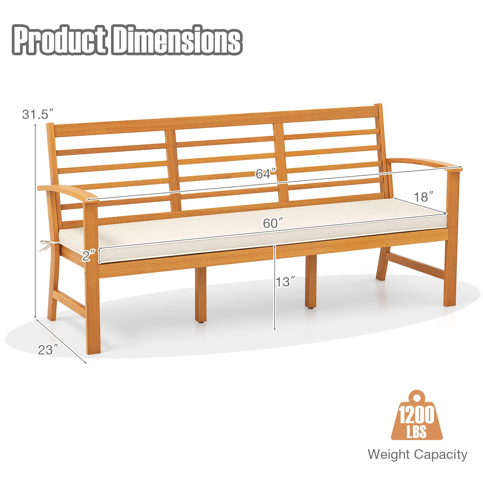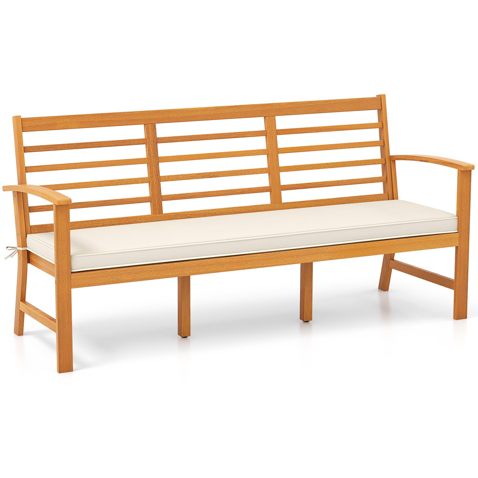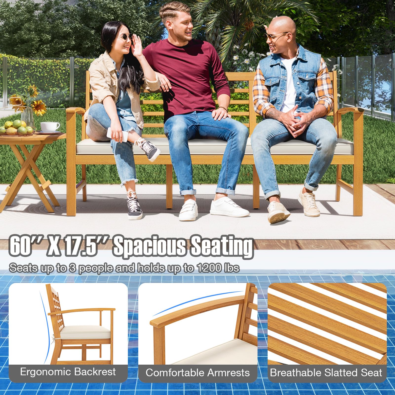 Discover the ultimate outdoor seating experience with our spacious wood outdoor bench. With a 60'' x 17.5'' spacious seating area, this bench comfortably seats up to 3 people and holds up to 1200 lbs. Crafted from solid acacia wood, it comes with a removable seat cushion for added coziness. The breathable slatted seat is cool and comfortable, especially for hot summer days. The ergonomic design with a 105° inclined backrest and comfy armrests ensures optimal relaxation. This wooden bench blends seamlessly with various outdoor decor styles, applicable to various occasions, such as the garden, patio, poolside and more. Bring comfort and style to your outdoor living with our acacia wood bench today.