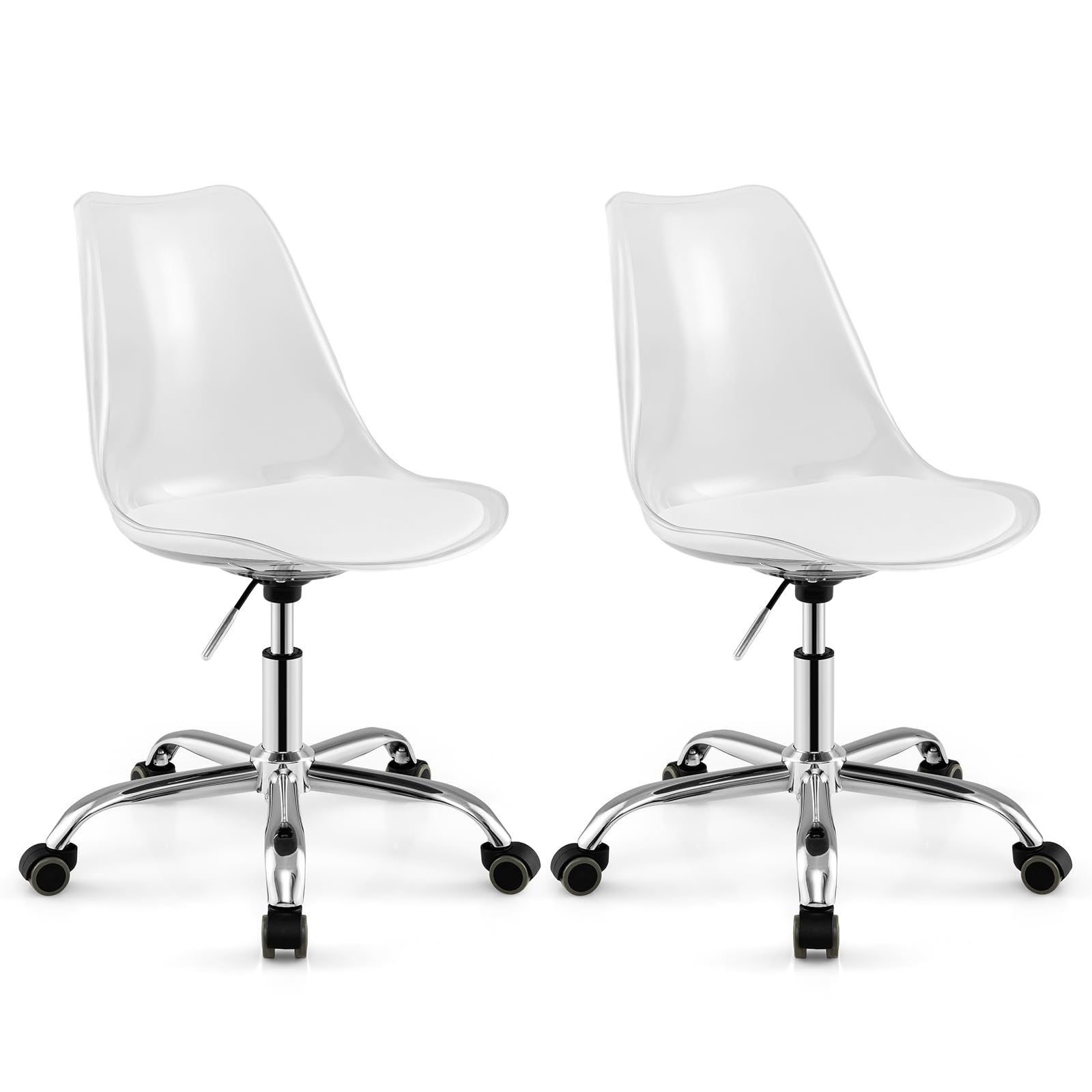 Crafted from premium acrylic, this chair features a wear-resistant surface and a robust 5-claw base supporting up to 330 lbs for ultimate stability and longevity. It offers customizable comfort with an adjustable seat height from 17" to 21" and a 360-degree swivel for easy mobility. The ergonomic backrest and high-density sponge cushion provide lasting support, ideal for prolonged sitting. Its armless design and swivel casters allow for seamless storage under desks, perfect for compact spaces. Versatile and stylish, it's suitable for various environments, from home offices to conference rooms, enhancing any decoration with a touch of modern elegance.