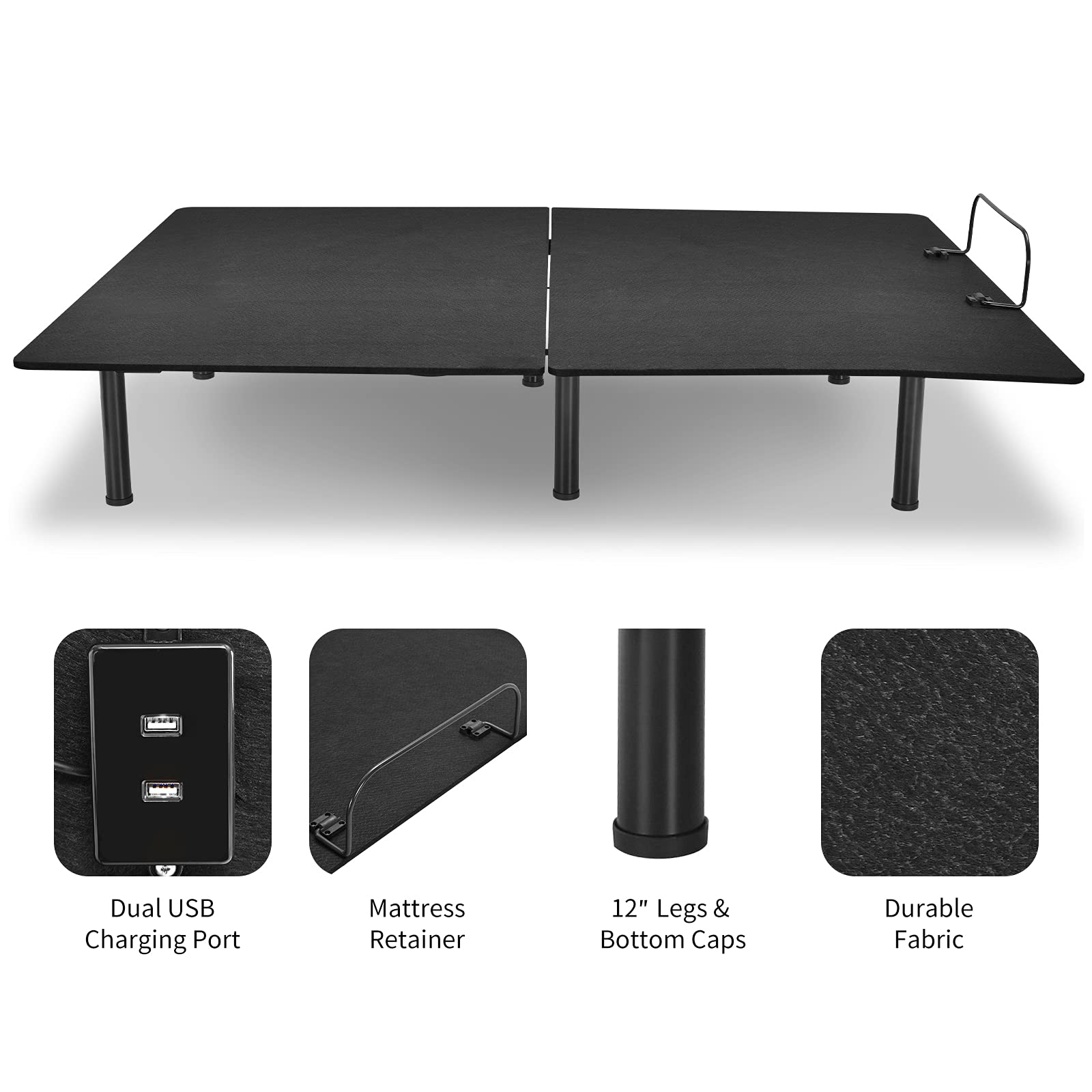 Find your most comfortable posture on our adjustable bed base. The position of head and foot can be independently or synchronously changed. You can choose the most comfortable angle as you need like zero gravity position, which is convenient for you to work on laptop, watch TV or reading a book on bed. With remote control, you can choose between 6 buttons to adjust the bed base. Besides, the construction of the bed frame is made of heavy-duty steel for extended durability while the cover is crafted with durable fabric for long-term use. Moreover, the dual USB ports provide you with great convenience. And it also has retainer bar to guarantee the mattress stay in place.