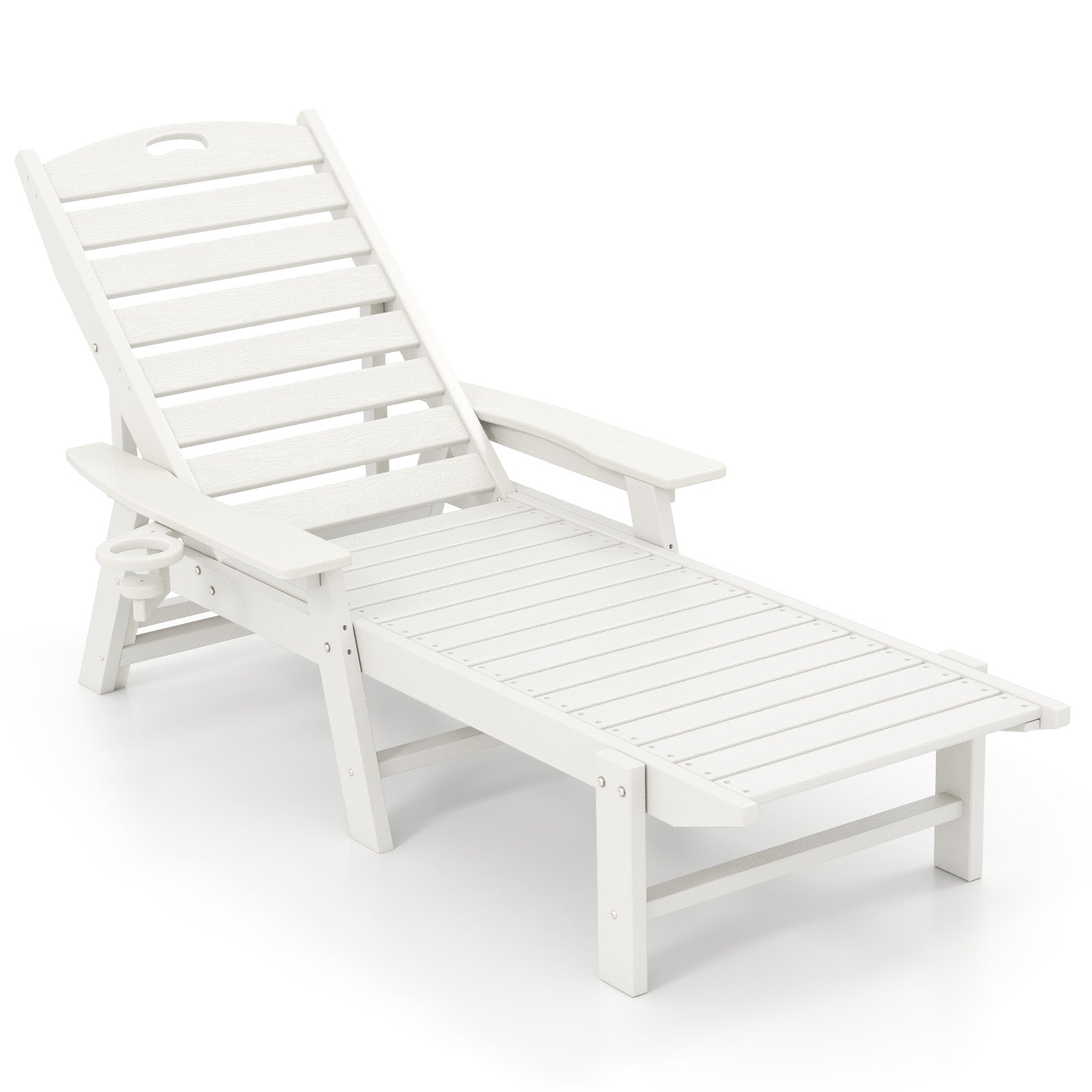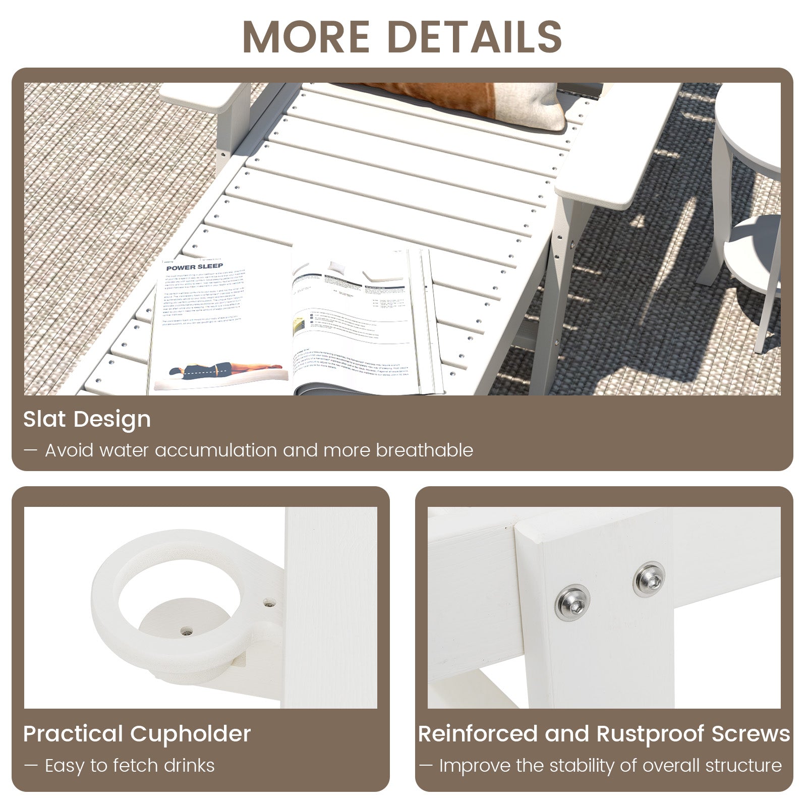The chaise lounge is totally made of tough high-density polyethylene, which is wear-resistant and weatherproof, ensuring long-lasting service life. And the chair is equipped with a high backrest that can be adjusted to 5 positions, allowing you to take a nap, read a book, or even sleep without any discomfort. The movable cup holder on the side is convenient for you to drink water. And the modern white look makes this chaise lounge chair perfectly fit into any environment. It is suitable for the beach, garden, backyard, poolside, balcony, porch, and so on.
