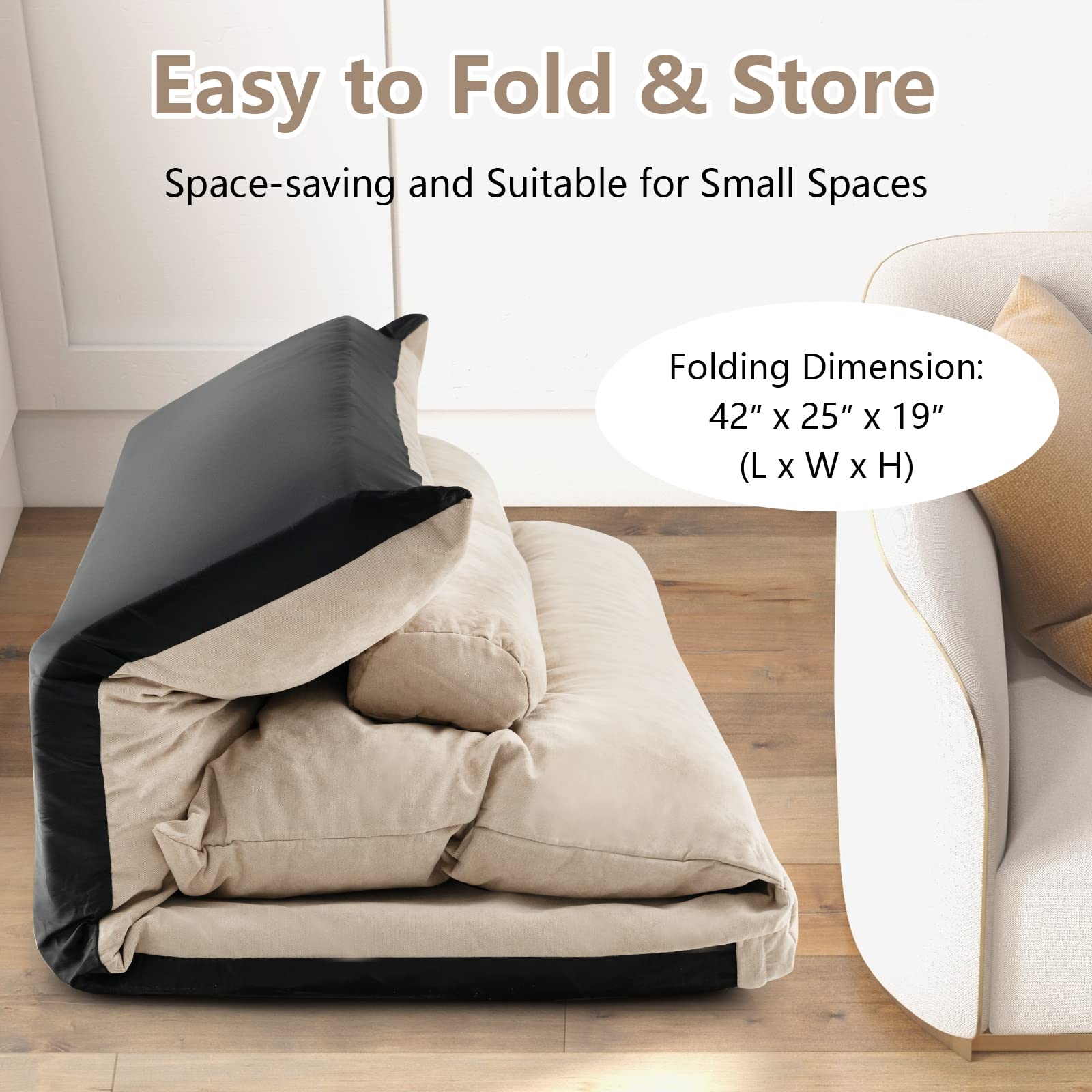 - 42-level Adjustable Backrest: The backrest of this floor sofa bed can be easily adjusted into 42 different positions, which meet your different needs. You can take a nap when you lay the backrest flat, play games or read in a cozy reclining position, or work when straightening the backrest.
