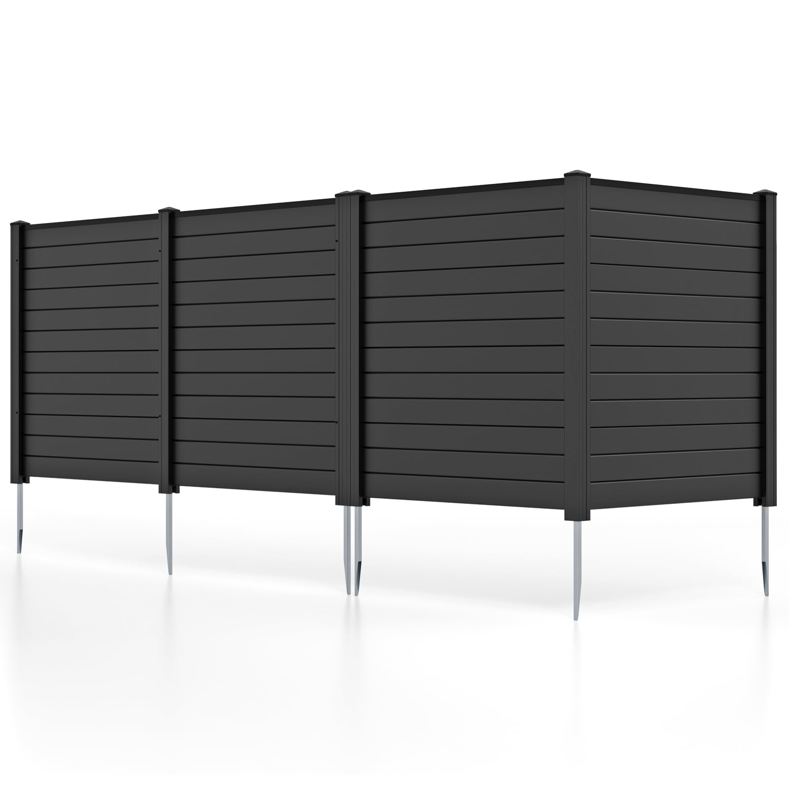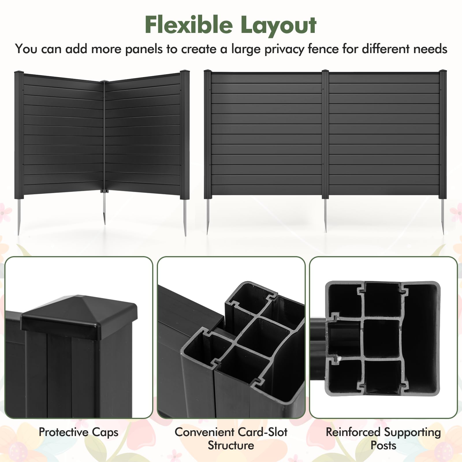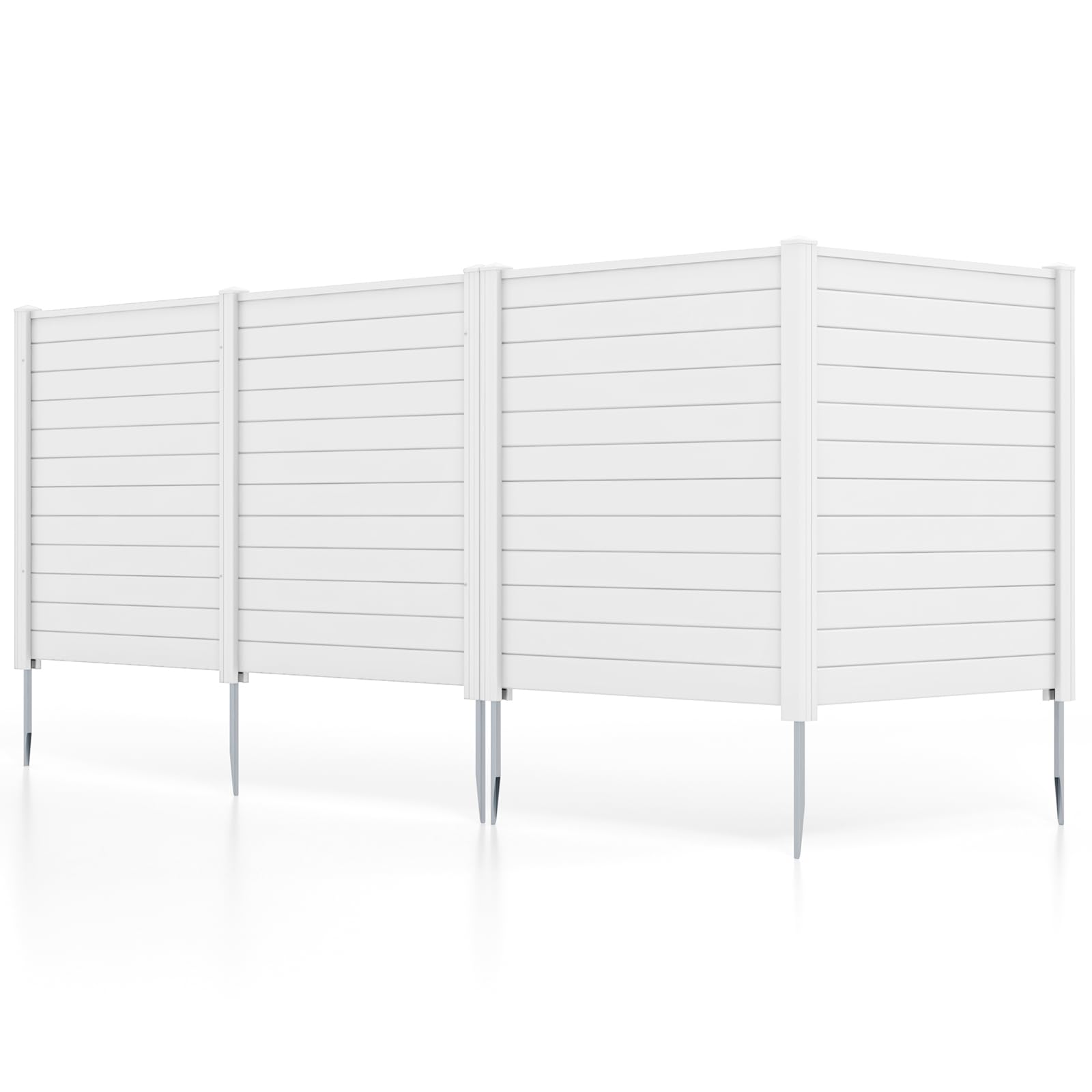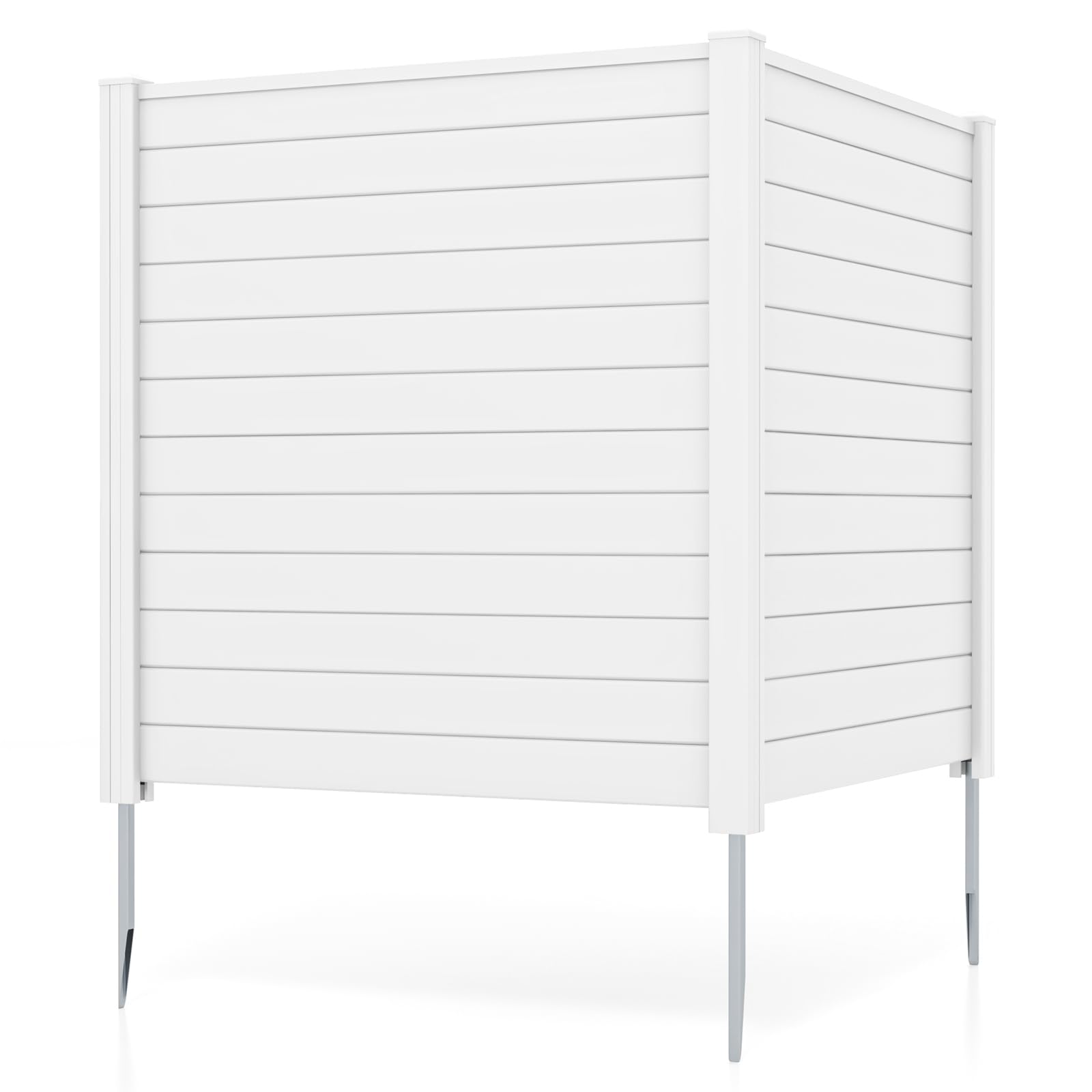 This outdoor privacy fence includes 2 large panels and there are 2 flexible layouts for you to choose from - right angle or flat angle. You can add more panels to create a large privacy fence for different needs. Reinforced with upgraded galvanized metal stakes, these screens offer a stable structure that can withstand windy conditions. Besides, the panels are crafted of selected high-quality PVC material, which is weatherproof and waterproof, ensuring long-lasting durability. And the surface is waterproof and smooth, thus you can draw and spray paint on it to personalize your panels. It also provides multiple uses—whether as a discreet enclosure for outdoor equipment, a protective barrier around trash bins, a decorative garden fence, or even as a secure area for your pets.