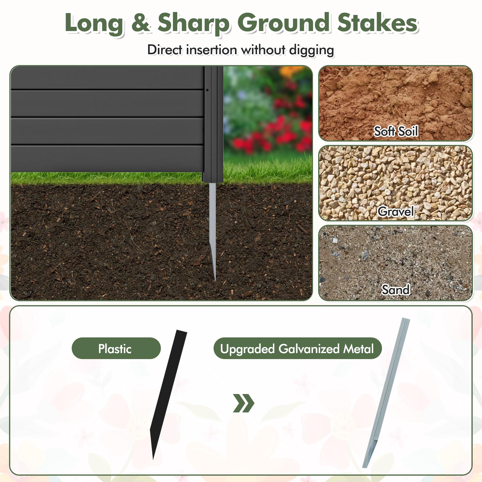 Heavy-duty galvanized metal stakes allow for direct insertion without digging when installation