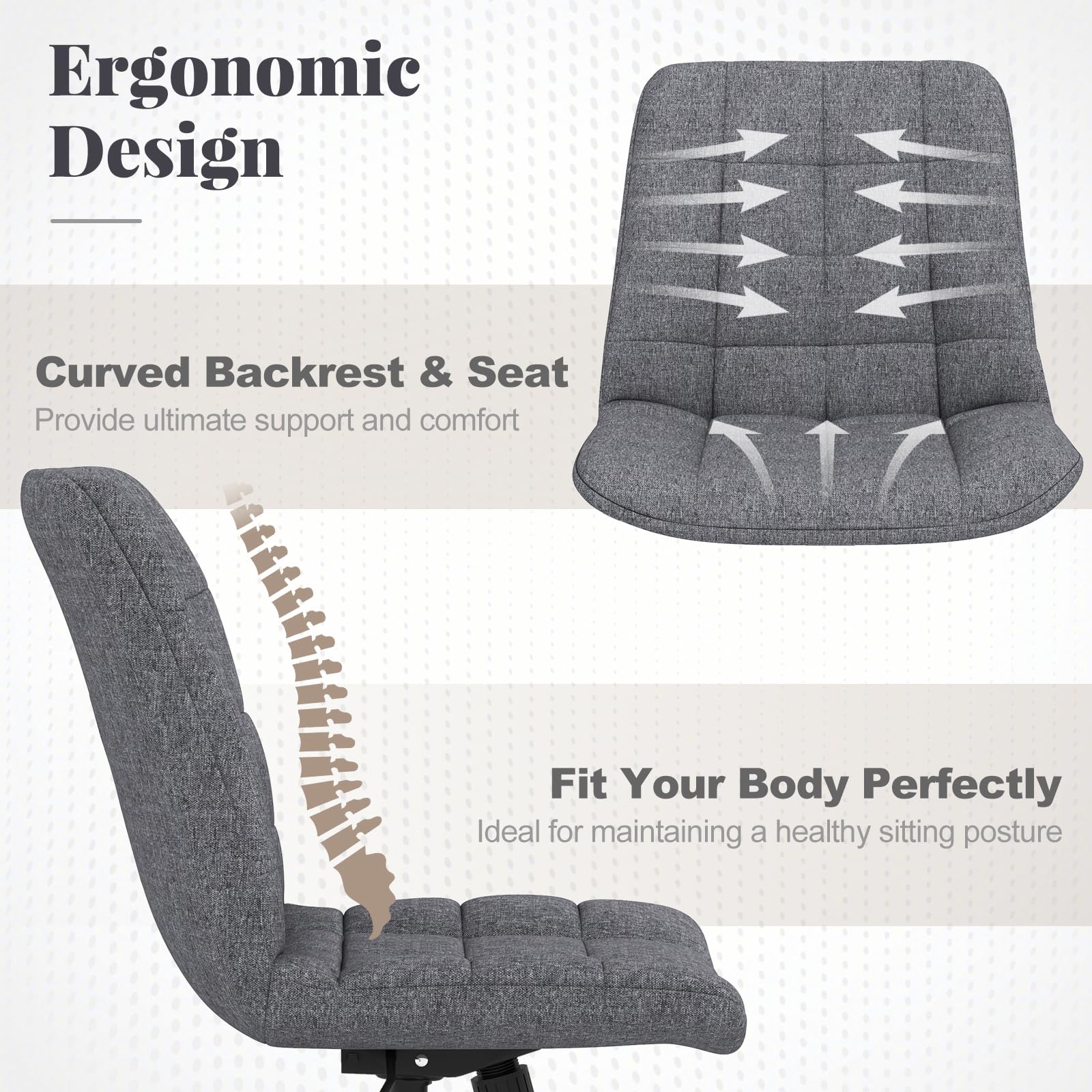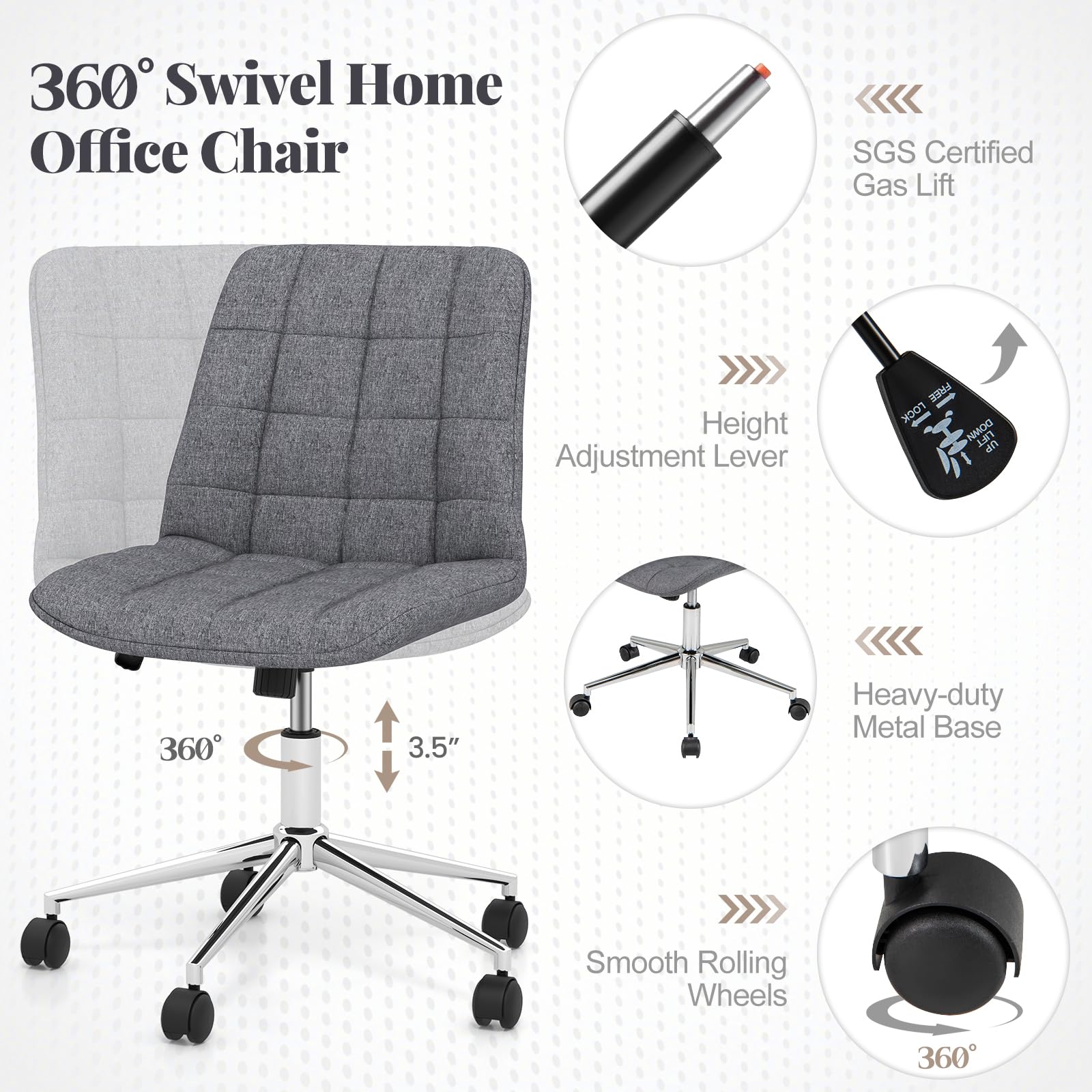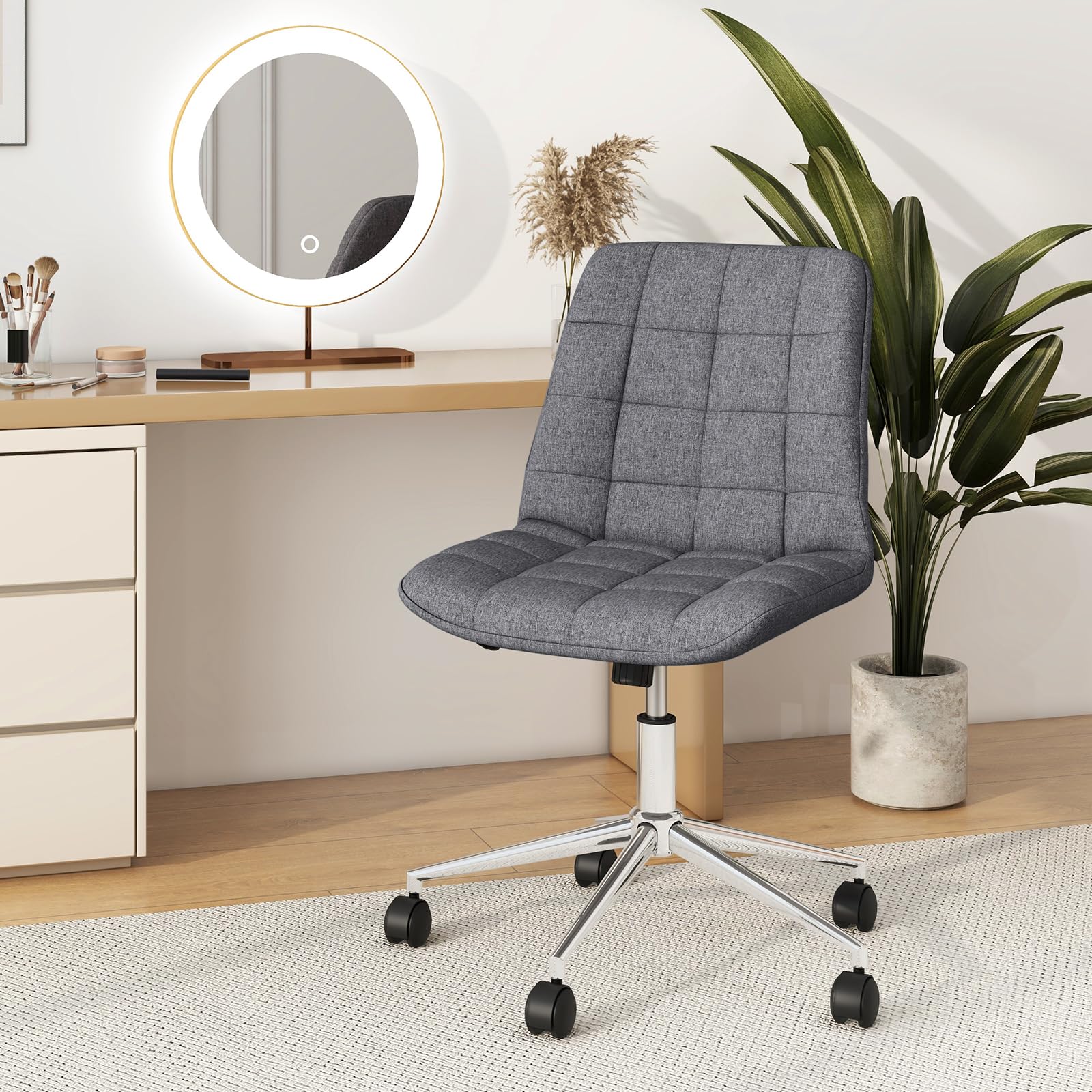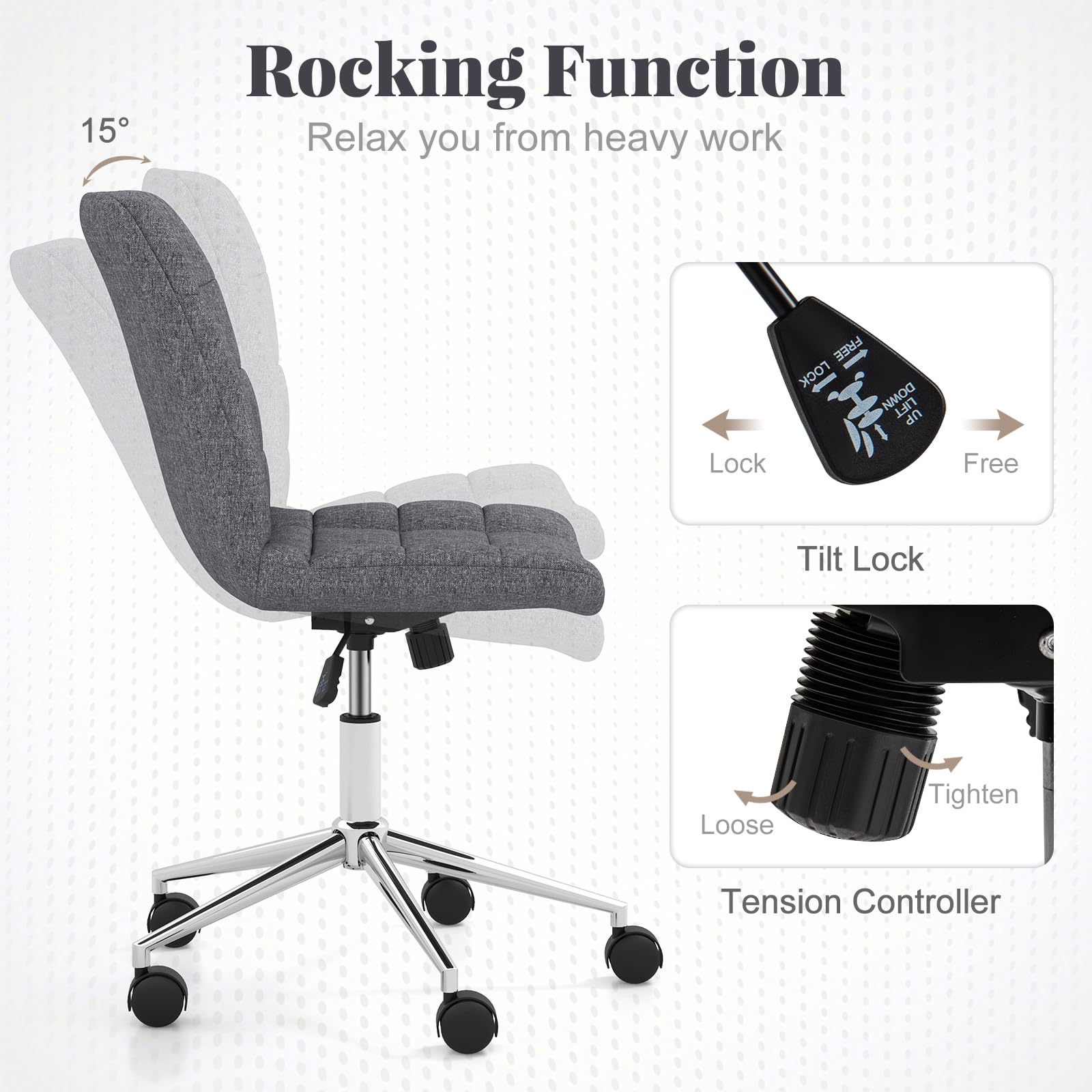 This desk chair features a 3.5 inch adjustable height range to accommodate your comfort preferences whether you are working, studying, reading, or applying makeup. Coupled with a 15° rocking function, the office chair offers soothing movement that enhances your seating experience and enables you to be free from fatigue. Plus, you can loose/tighten the tension controller to easily adjust the tilt tension. Crafted from skin-friendly fabric and soft sponge, this swivel task chair provides unmatched comfort. The curved backrest and seat make it ideal for maintaining a healthy sitting posture. What's more, 5 universal wheels are equipped to offer ease of movement across any floor surface. When not in use, this armless rolling desk chair can be tucked under desks, saving space and maintaining a clean aesthetic in your room.