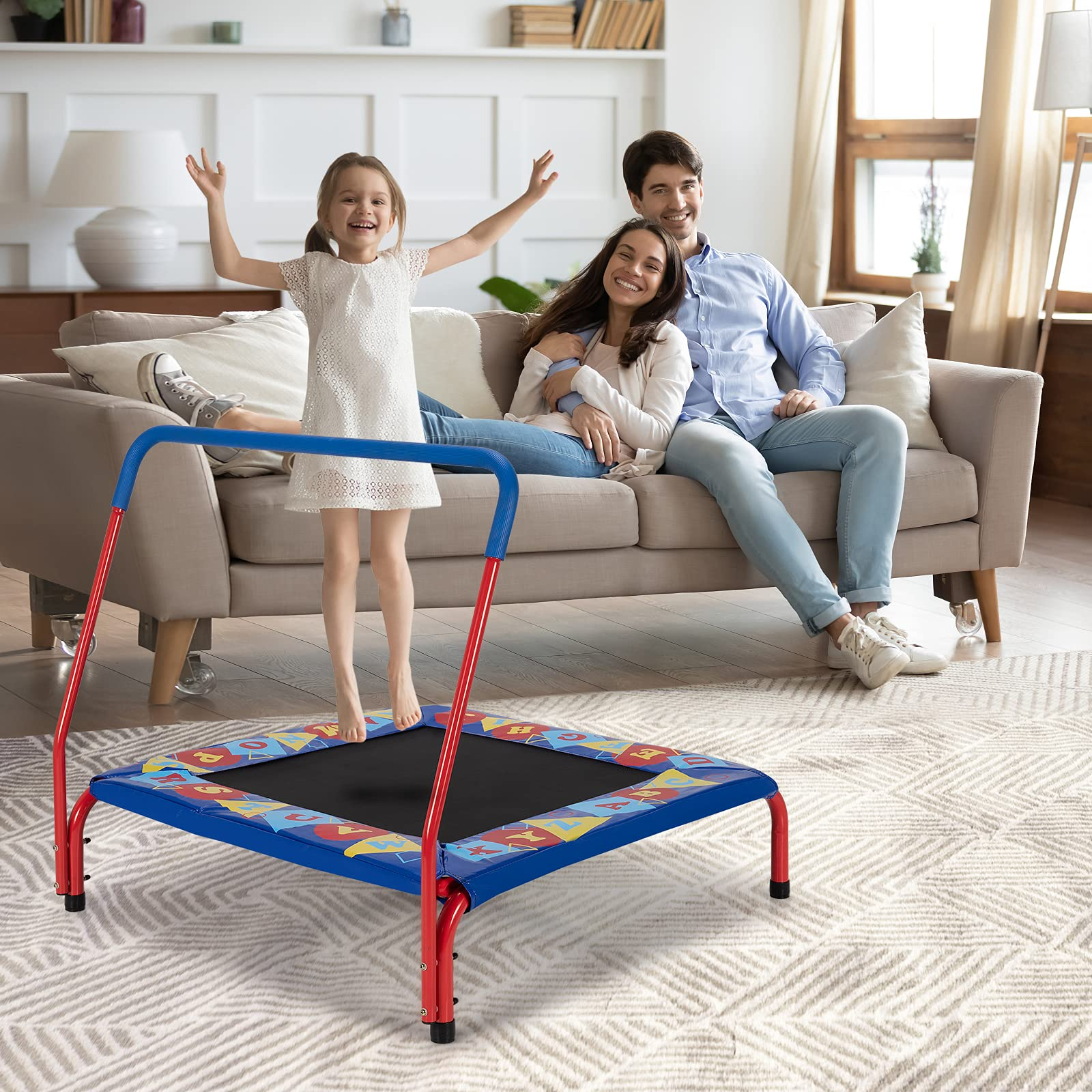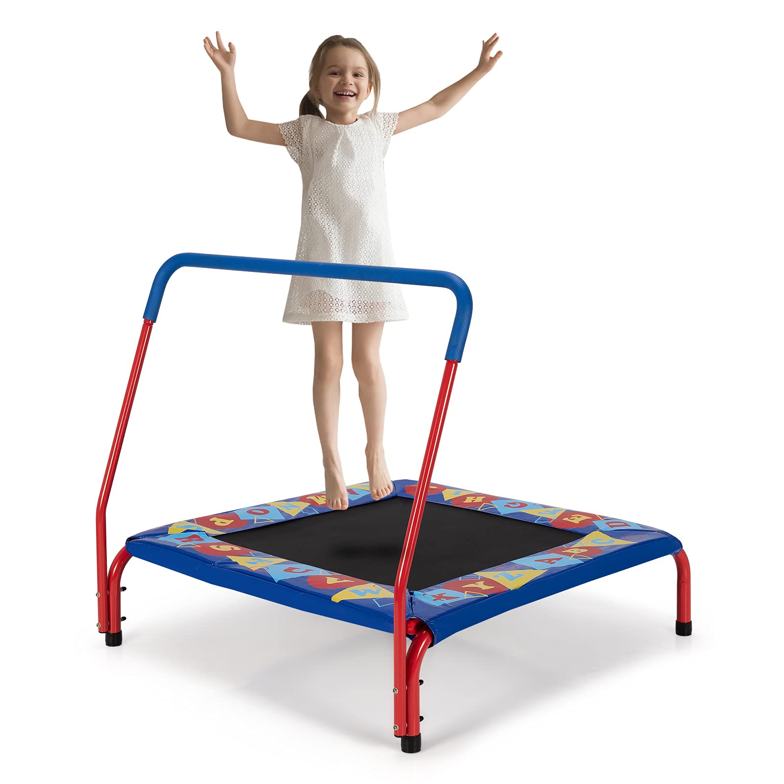 Do you often worry about children staring at the mobile phone screen every day? Do you pay close attention to your child's health? Our 36" x 36" kids square trampoline will lead your kids to a heathier lifestyle. With high-density jumping mat and enhanced steel springs, this small fitness trampoline will provide much fun to kids while jumping. And we highly consider your kid safety, so we have designed safety cover and foamed handle on the trampoline. And the anti-slip footpads with curved design not only ensure higher stability, but also protect the ground from scratches. If you are looking for a great gift to your little one, our square kids trampoline will be a good choice.